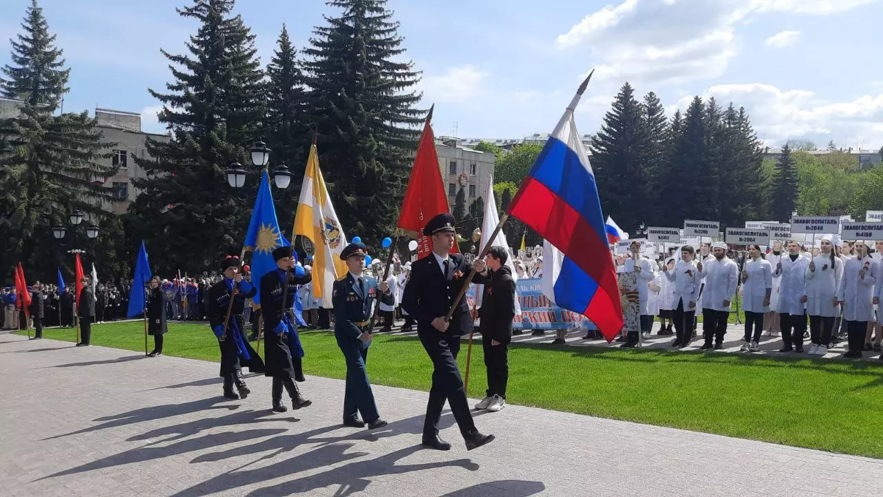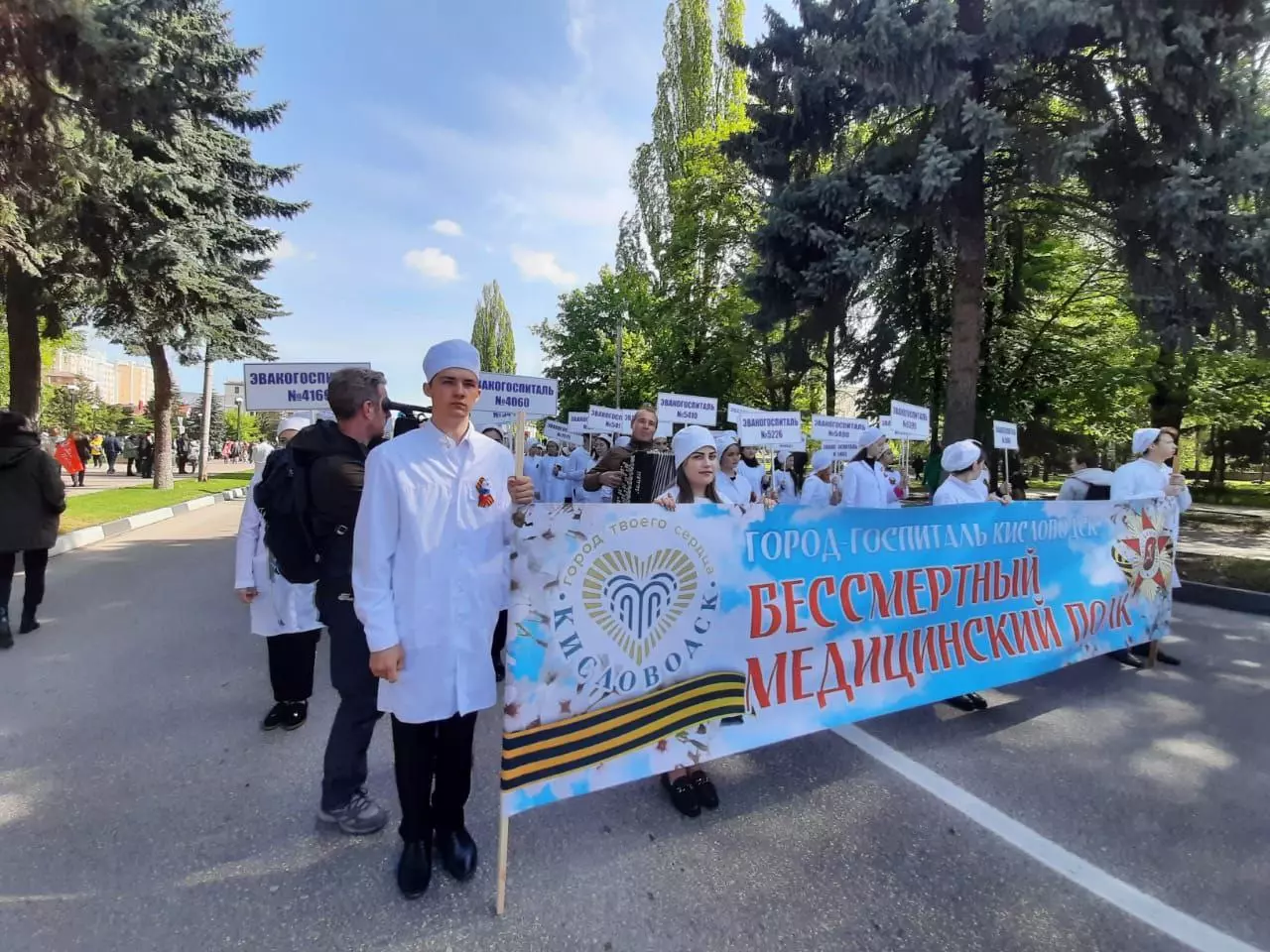Самым знаменитым событием дня стало эффектное шествие колонны медиков, которая более пяти лет 9 мая возглавляла общую колонну Бессмертного полка Кисловодска. По информации главы города, к нему присоединились более 5 тысяч кисловодчан и гостей курорта. Но все же широко растиражированное в СМИ слово «впервые» здесь, как и во многом другом, не совсем уместно: и в Кисловодске, и в некоторых других городах России эта акция проводится уже не один год. Единственное, чем она отличается от прошлогодней, это поразившая воображение массовость: чтобы санаториям выйти на впечатляющую цифру в 2000 участников по команде сверху, им, по просочившимся сведениям, пришлось в спешном порядке заполнять свои ряды всеми штатными сотрудниками, даже рабочими, закупая множество белых халатов.