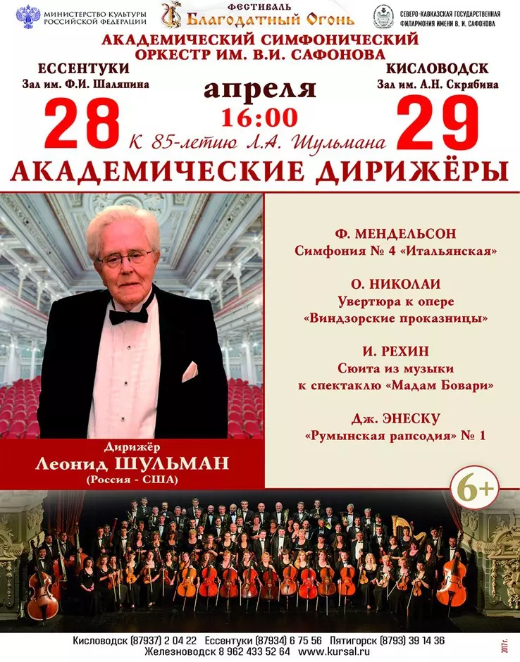 Юбилею маэстро филармония посвятила два концерта в Ессентуках и Кисловодске в рамках традиционного ежегодного фестиваля «Благодатный огонь». Едва успев разместиться в уютном номере санатория «Родник», с объятиями принявшего почетных гостей, прийти в себя после трудного перелета по маршруту Вашингтон – Москва — Минеральные Воды и резкой смены часовых поясов, Леонид Абрамович и оркестранты приступили к репетициям. Они проходили в непростой атмосфере: коллектив филармонии еще не отошел от стресса, вызванного внезапным увольнением заместителя гендиректора Андрея Дмитриевского, занимавшего эту должность в течение трех десятилетий. Состав оркестра также изменился со времени последнего совместного выступления, в доработке нуждалась партитура, на ходу решались возникавшие рабочие моменты. Подготовка к концертам потребовала от музыкантов и дирижера огр