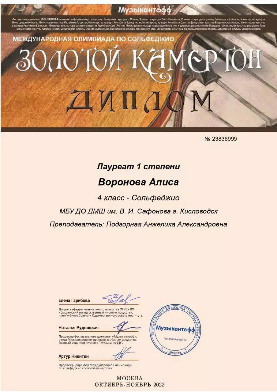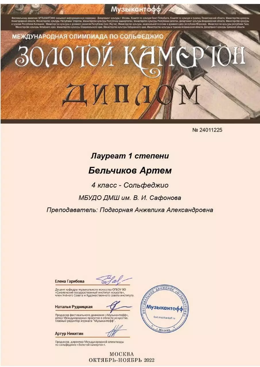 Ученики 4 класса Детской музыкальной школы имени Сафонова Артем Бельчиков и Алиса Воронова стали лауреатами 1 степени международной олимпиады по сольфеджио «Золотой камертон».