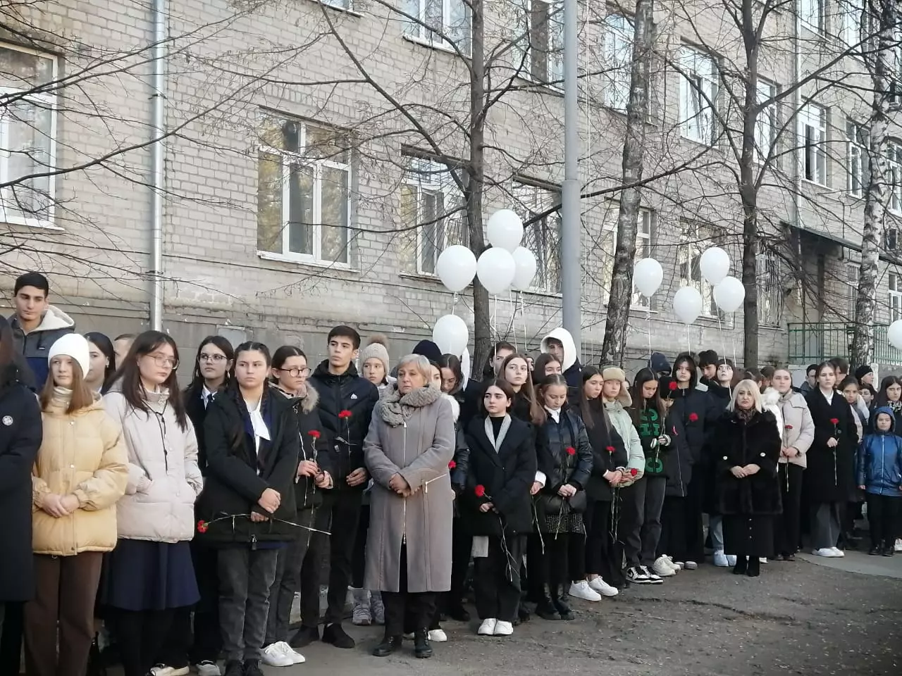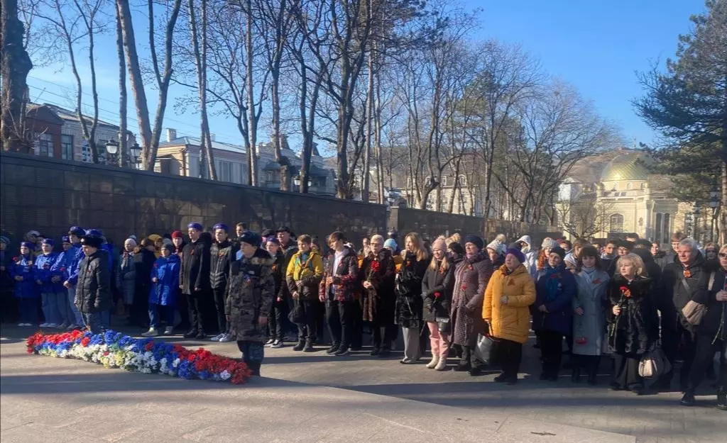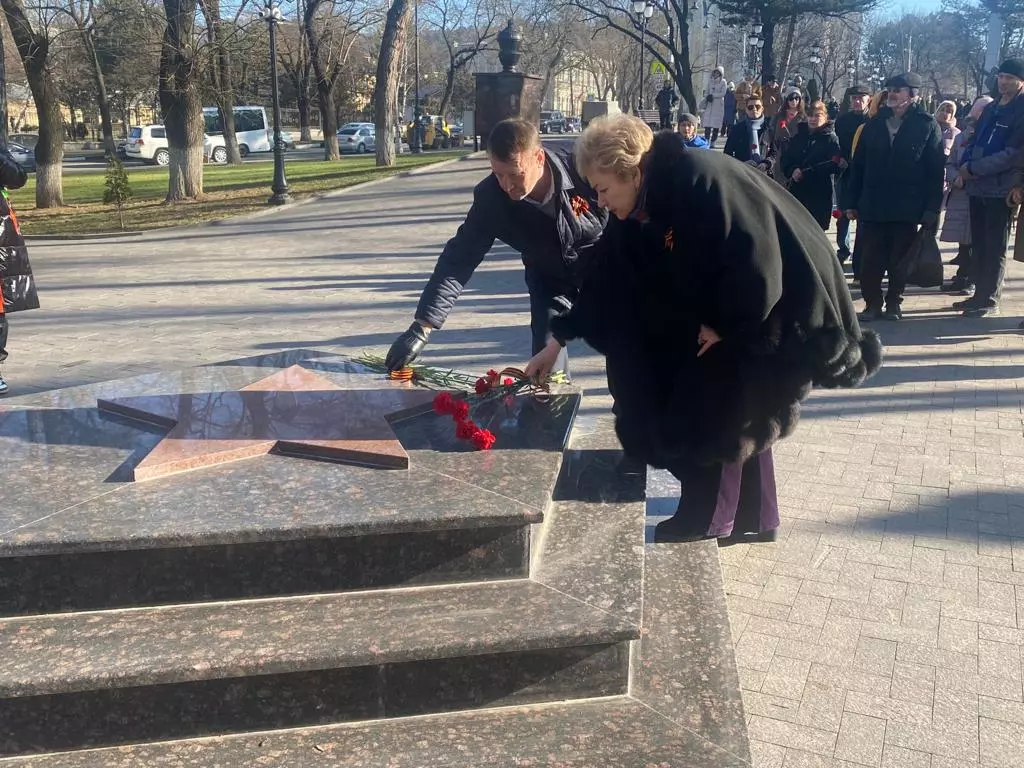 У мемориала «Журавли», более 300 участников митинга возложили красные гвоздики к Вечному огню, где в годы Великой Отечественной находился военкомат.