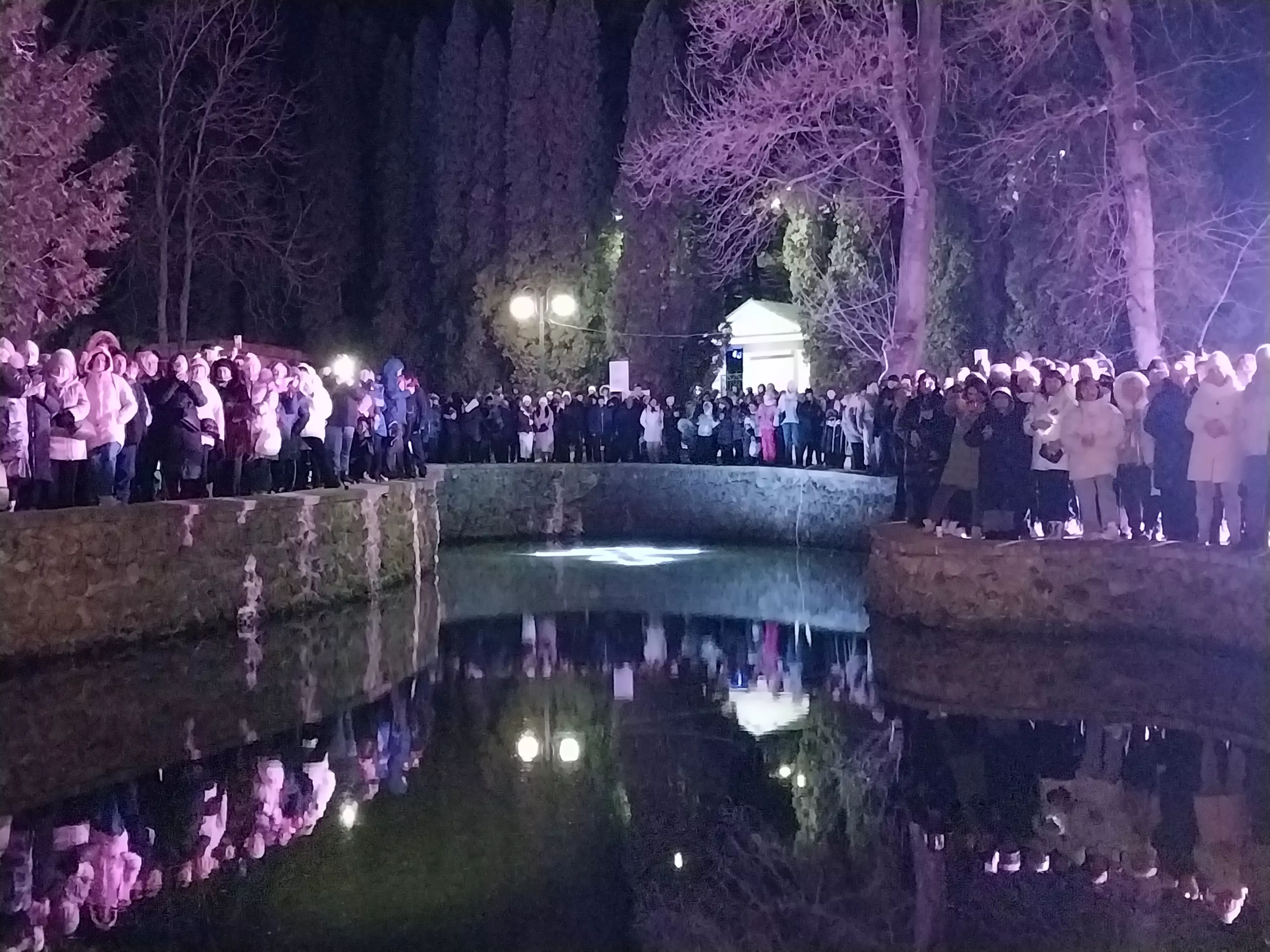 Рядом установили теплые палатки. Прибыла полевая кухня с «нарзанной кашей». Коробейники раздавали печенья с пожеланиями и вареники с предсказаниями. Праздничное настроение также создавал казачий ансамбль. В полночь после проведения чина освящения вод жители и гости города-курорта стали совершать крещенское омовение в Зеркальном пруду. Чистая вода в него поступает из пресного источника, где круглый год держится 7-градусная температура.