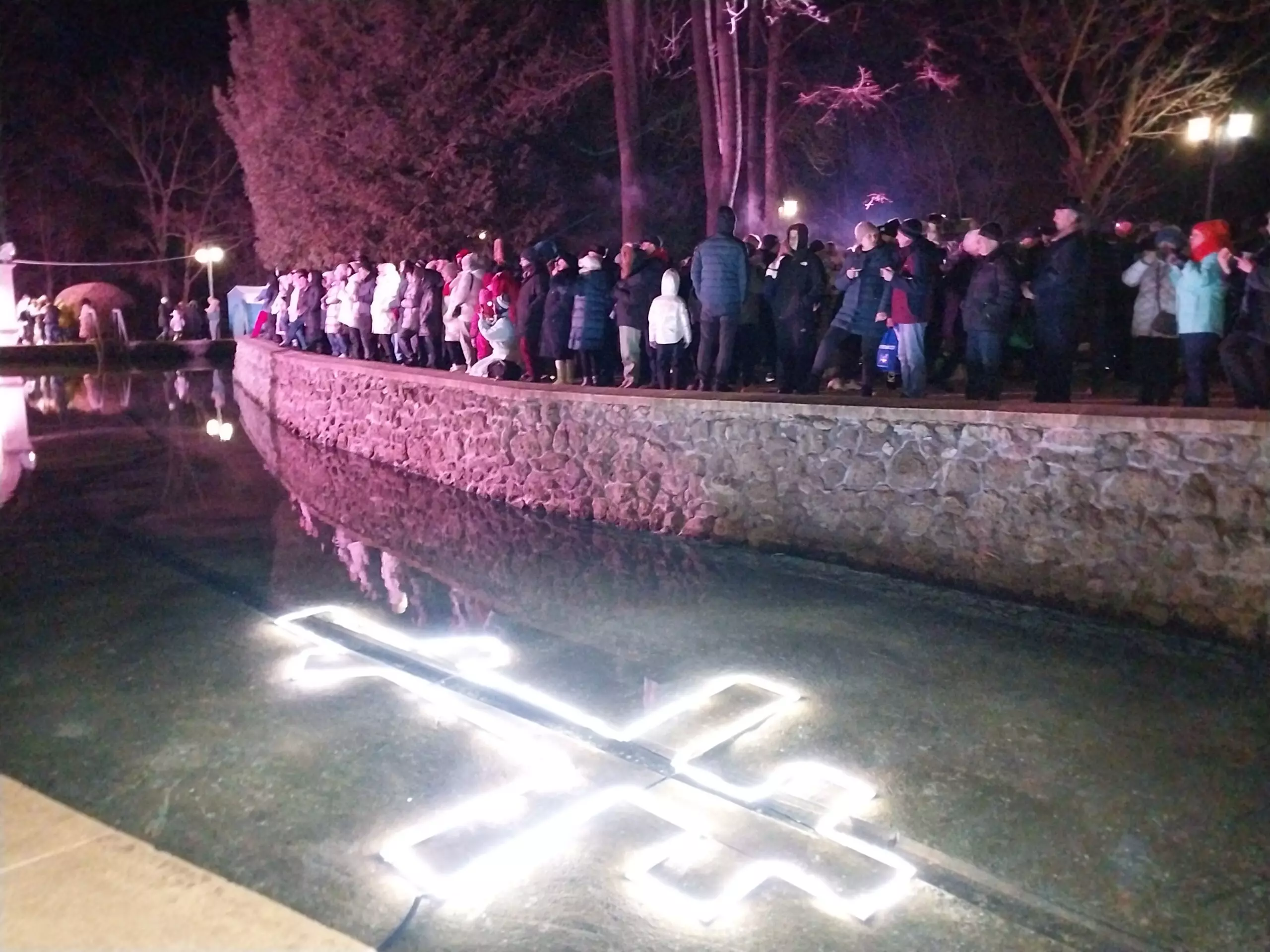 Рядом установили теплые палатки. Прибыла полевая кухня с «нарзанной кашей». Коробейники раздавали печенья с пожеланиями и вареники с предсказаниями. Праздничное настроение также создавал казачий ансамбль. В полночь после проведения чина освящения вод жители и гости города-курорта стали совершать крещенское омовение в Зеркальном пруду. Чистая вода в него поступает из пресного источника, где круглый год держится 7-градусная температура.