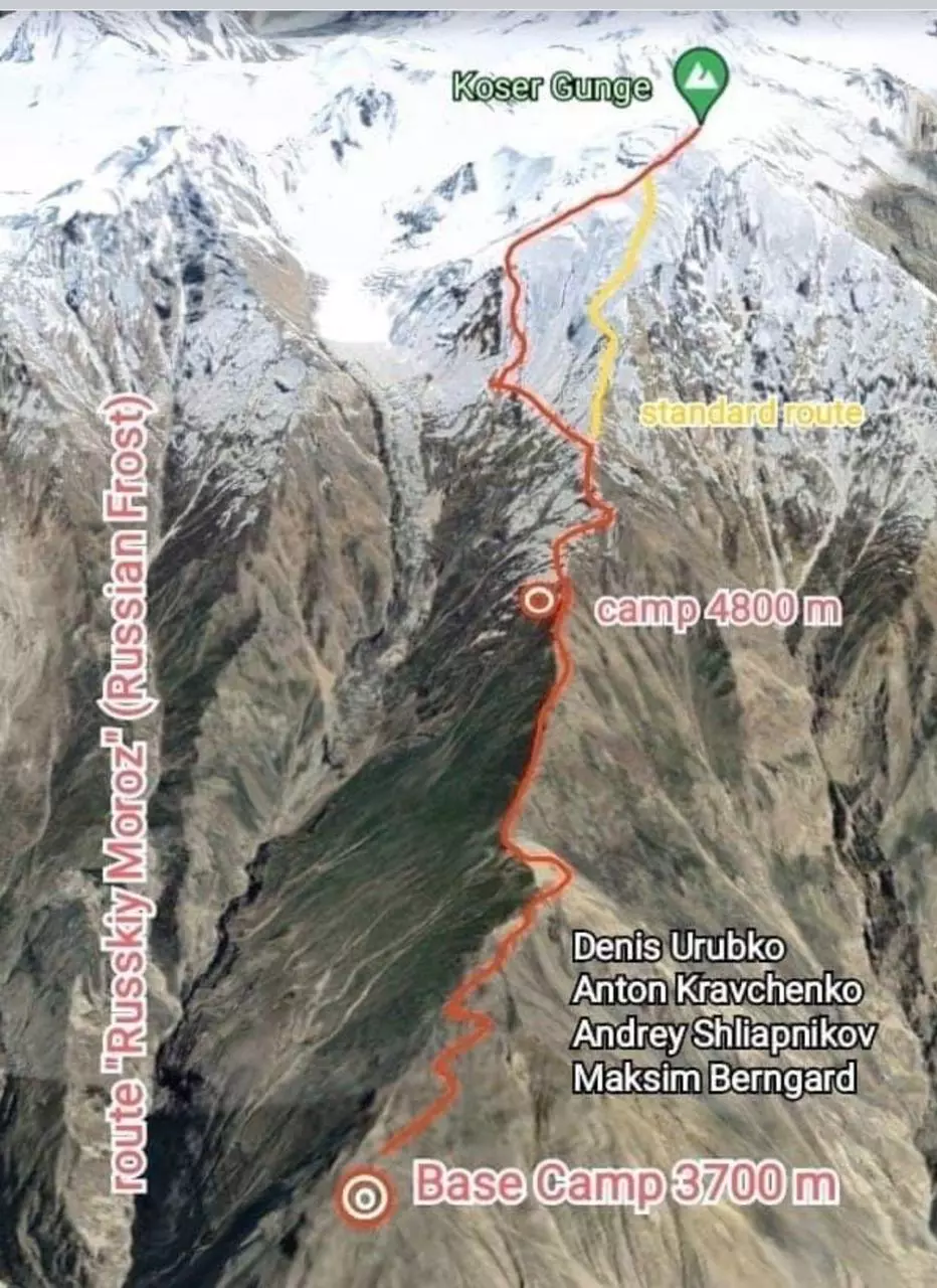 В состав группы вошли ещё 2 альпиниста: москвич Антон Кравченко и Максим Бернгард из Иркутска.Маршрут назвали «Русский Мороз». Восхождение прошло под руководством легендарного альпиниста Дениса Урубко. Все члены команды известны ему по восхождению на Эльбрус.