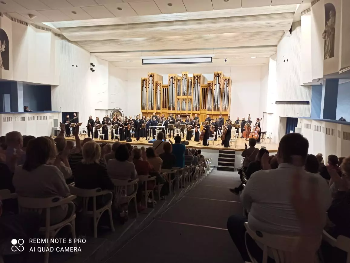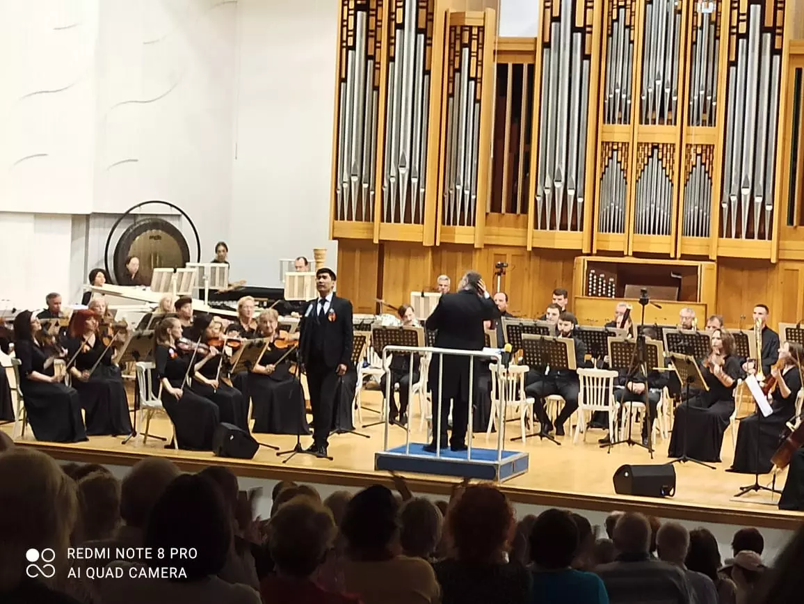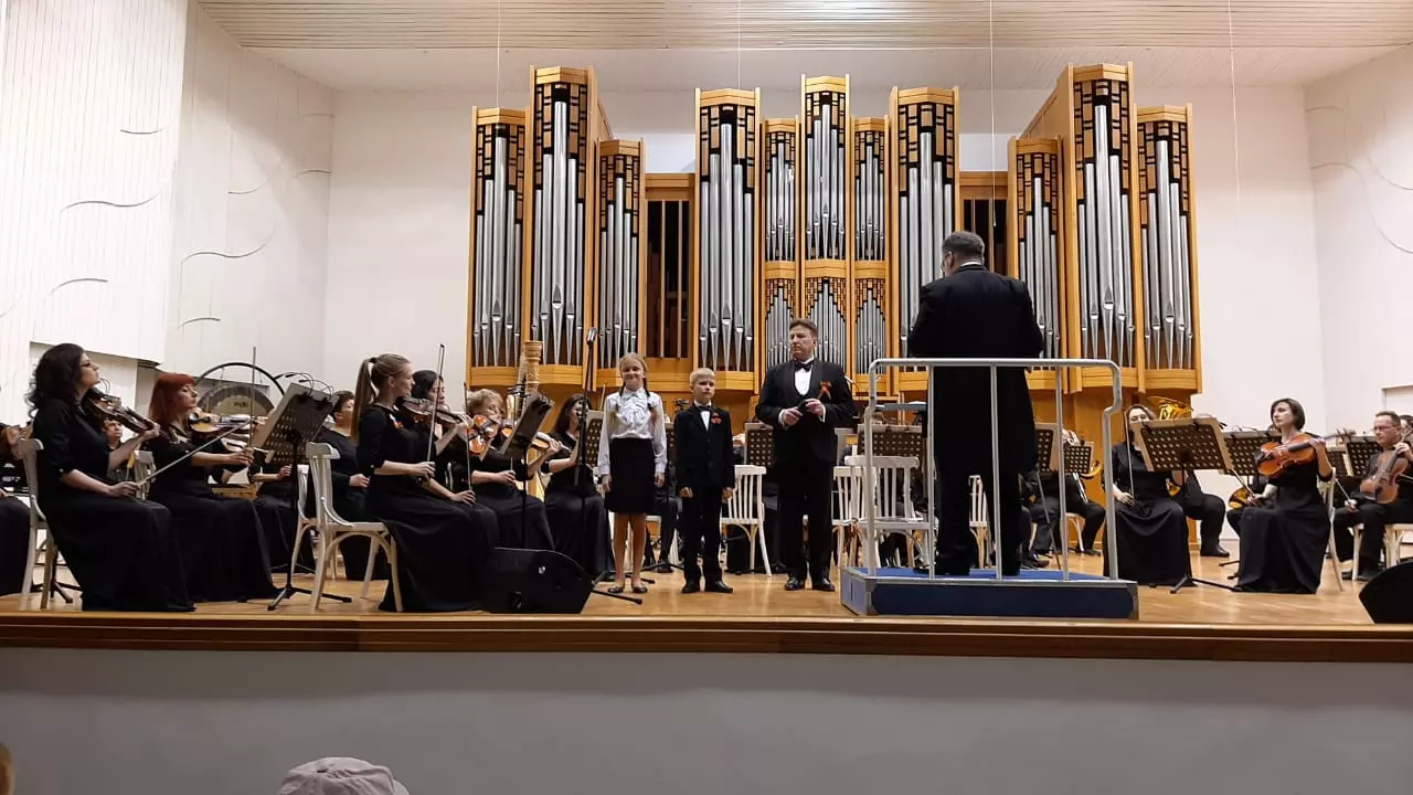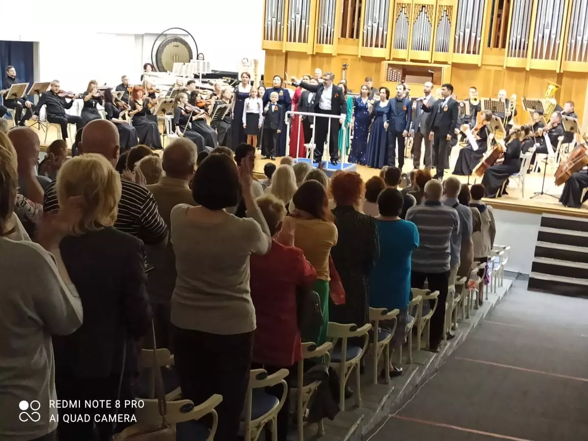 В первом отделении в исполнении оркестра прозвучало попурри песен из известных фильмов, сопровождаемое видеорядом с кадрами кинохроник. С первыми звуками песни М.Львова на слова А.Пахмутовой «Поклонимся великим тем годам» зрители встали и молча, со склоненными головами, простояли до конца произведения. Так же дружно поднялся зал и в конце второго отделения, но в нем скорбь уступила место торжеству, душевному подъему. Да иначе и быть не могло: концерт завершила песня Давида Тухманова «День Победы», давно ставшая жизнеутверждающим гимном подвигу народа, сумевшего победить фашизм. Мы постарались передать читателям это настроение с помощью фотографий и видеозаписей, сделанных Светланой Рожновой и автором. С праздником, друзья! С Днем Победы!