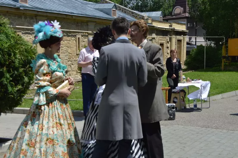 После завершения патриотической акции «Священный долг – Отечеству служить», гости словно «переместились» в XIX век. По дорожкам чинно прогуливались представители общества «водопийцев» (артисты театра-музея «Благодать»), а директор храма муз рассказывал об особенностях лечения на Водах в XIX веке, о так называемом «Водяном обществе», очень точно описанном в повести М.Ю. Лермонтова «Княжна Мери».