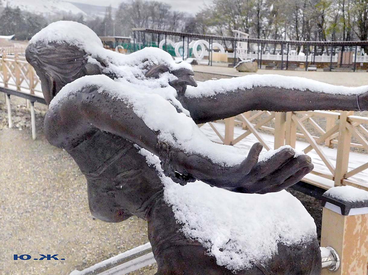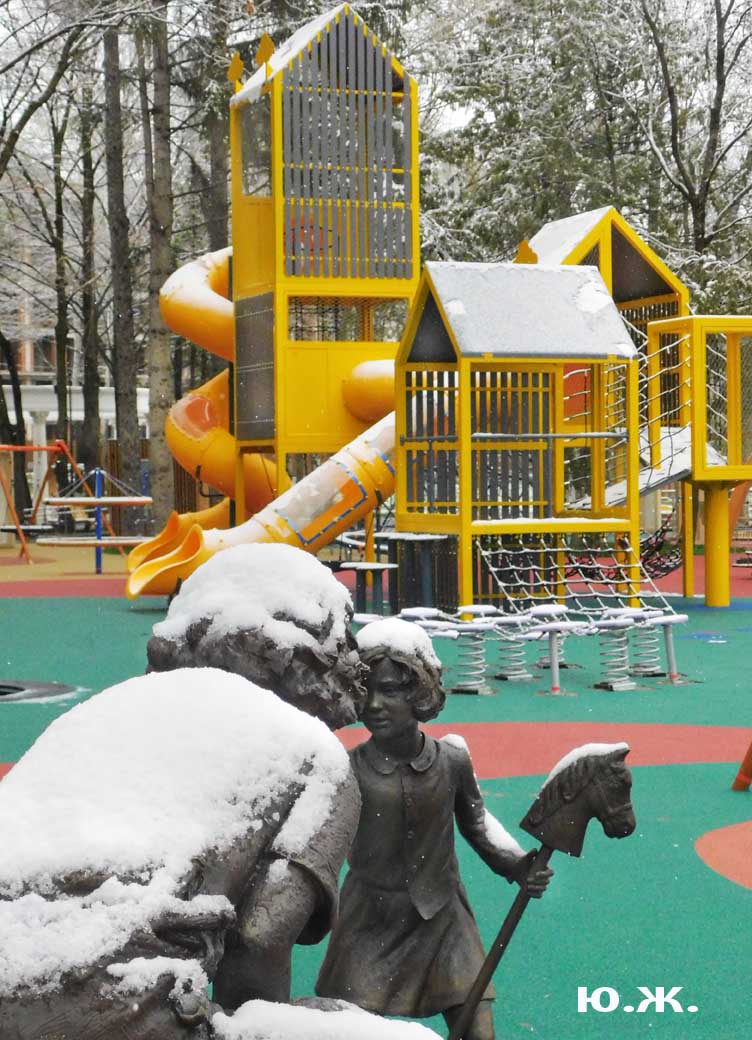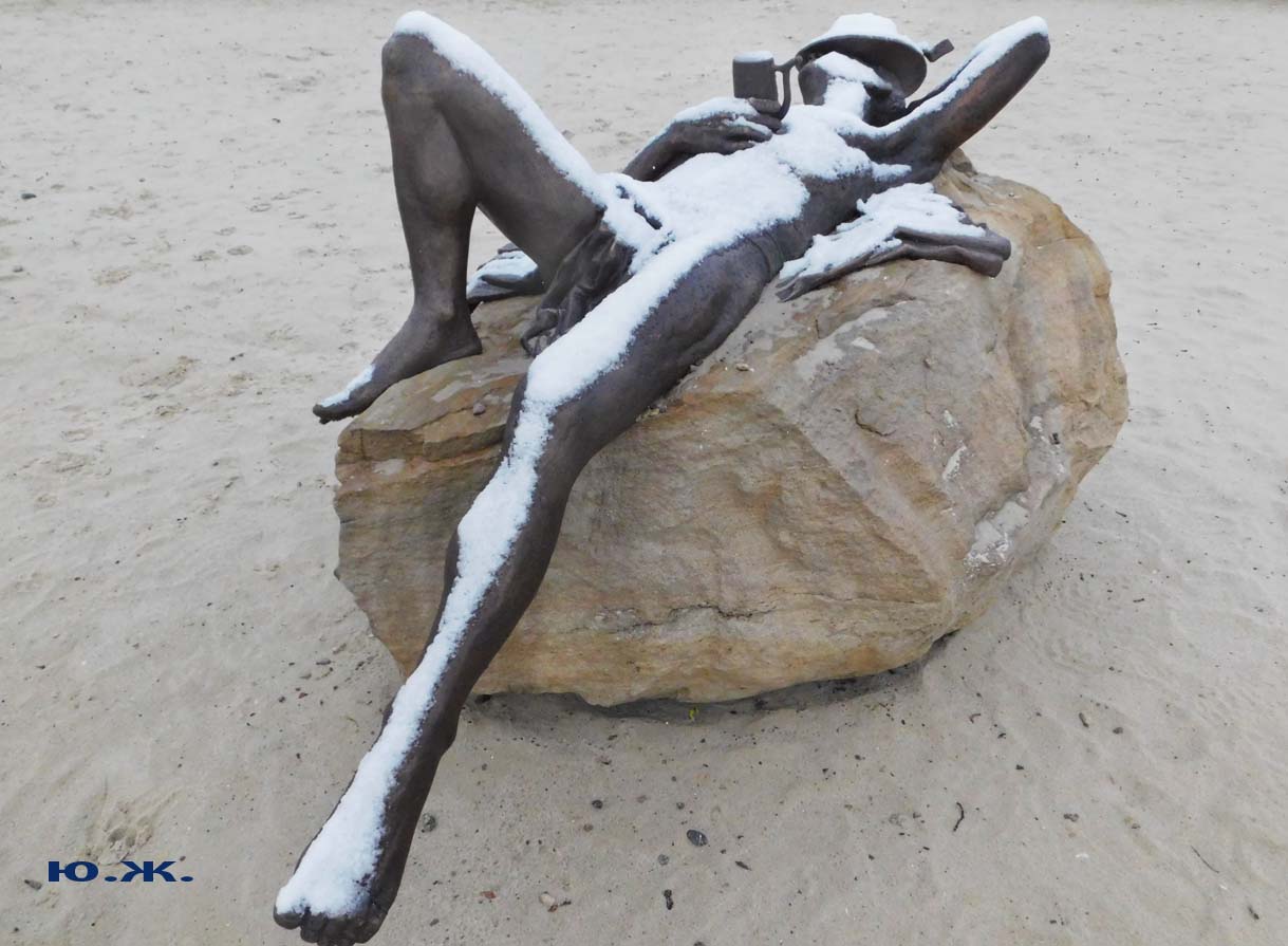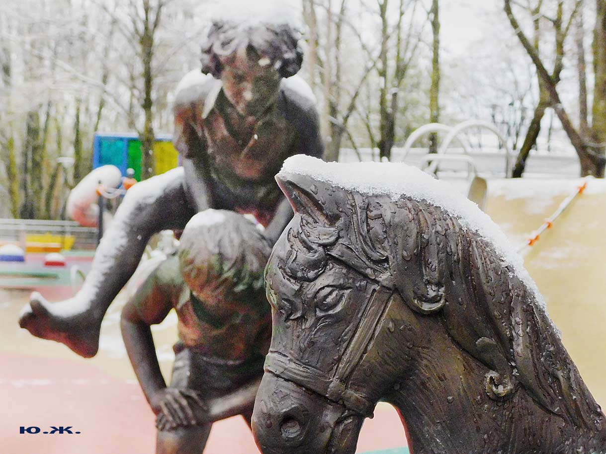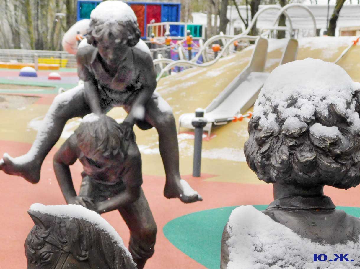 Первый раз видел бронзовых друзей в необычном одеянии. Особенно интересно выглядел загорающий молодой человек, засыпанный снегом по горизонтали. Просто стало его жалко: лежать в снегу в одной повязке и шляпе… Стройная бронзовая купальщица выглядела бодрее, была бы вода, говорят, в воде в апреле теплее, ей было бы совсем нипочем. Импозантный бронзовый рыбак со своим умным котом был в хорошей спортивной форме, и оба всматривались напряженно в туманно-снежную даль… А нашим бронзовым ребятам, что в игровом городке, никакой снег не страшен, как прыгали друг через друга на прошлой неделе, так и прыгают сейчас… Черепашка вся засыпана до головы снегом, разгребать пока его не буду.