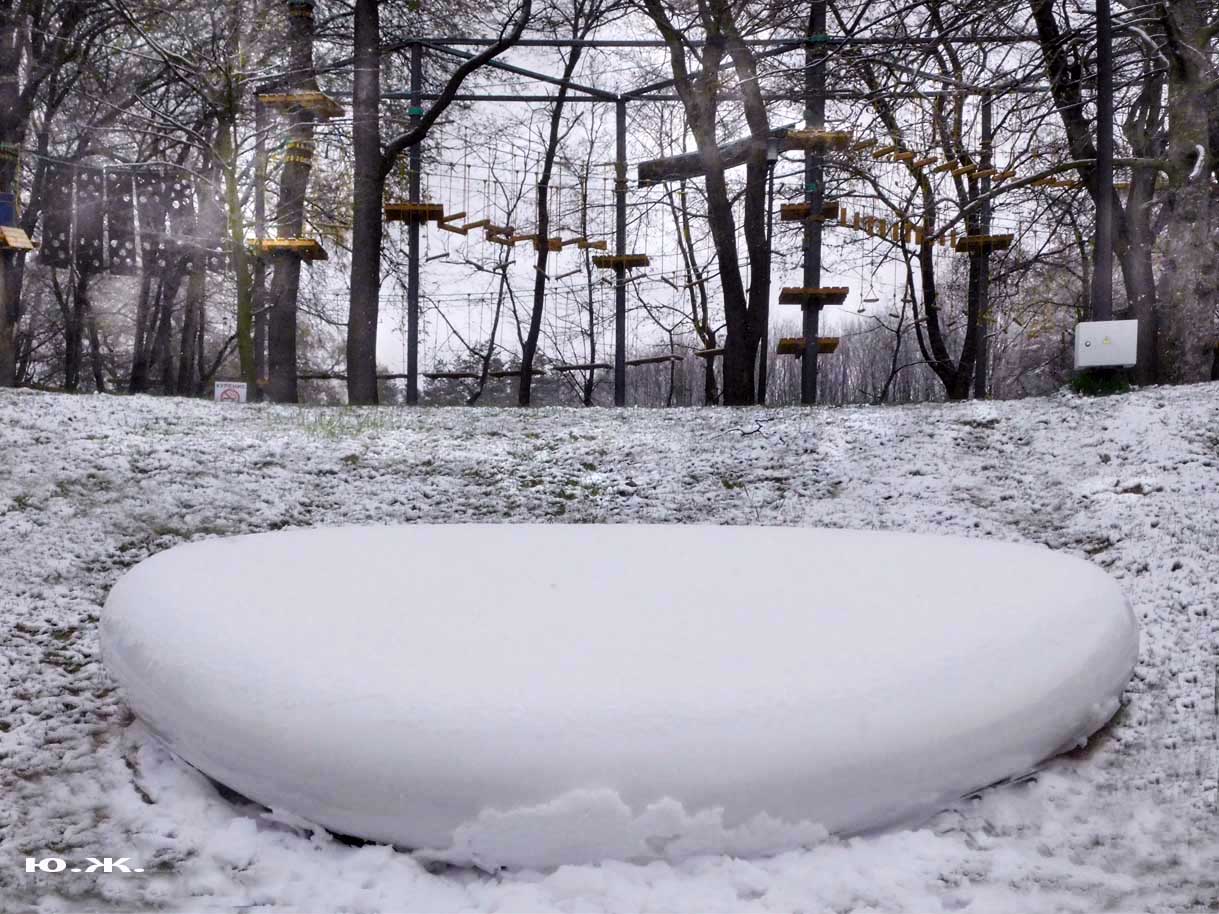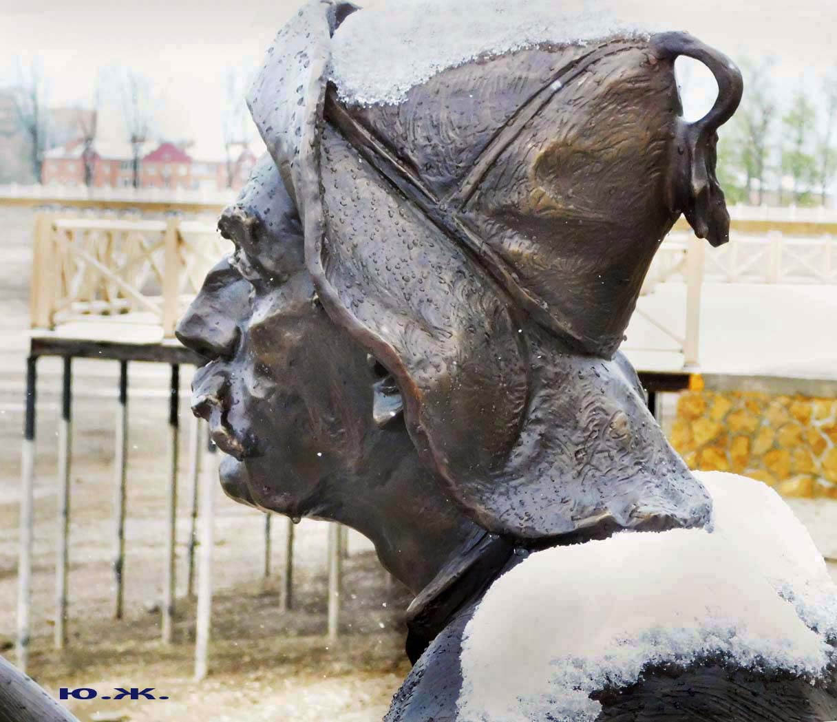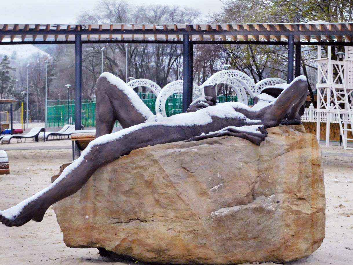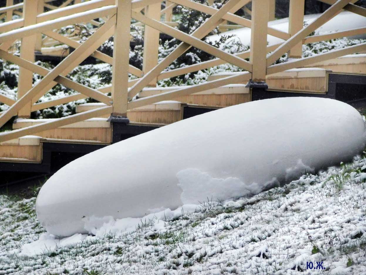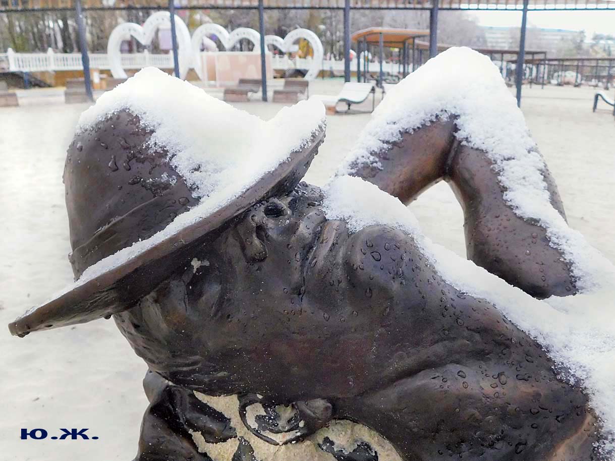 Первый раз видел бронзовых друзей в необычном одеянии. Особенно интересно выглядел загорающий молодой человек, засыпанный снегом по горизонтали. Просто стало его жалко: лежать в снегу в одной повязке и шляпе… Стройная бронзовая купальщица выглядела бодрее, была бы вода, говорят, в воде в апреле теплее, ей было бы совсем нипочем. Импозантный бронзовый рыбак со своим умным котом был в хорошей спортивной форме, и оба всматривались напряженно в туманно-снежную даль… А нашим бронзовым ребятам, что в игровом городке, никакой снег не страшен, как прыгали друг через друга на прошлой неделе, так и прыгают сейчас… Черепашка вся засыпана до головы снегом, разгребать пока его не буду.