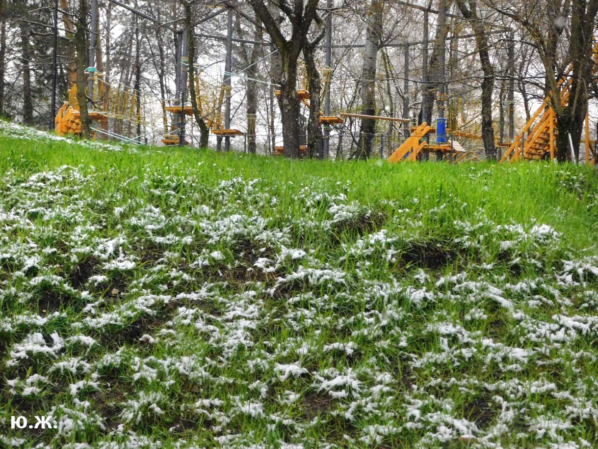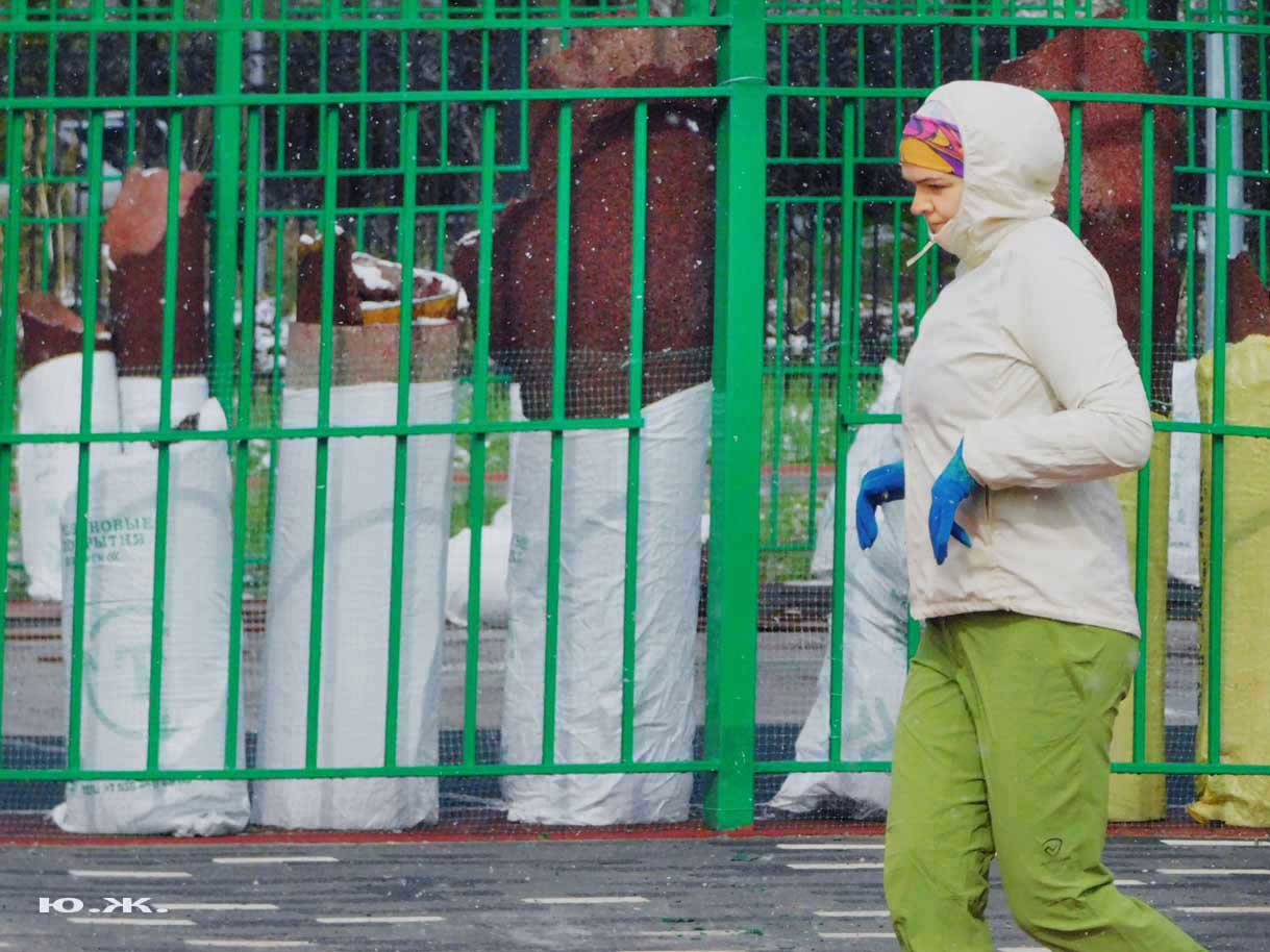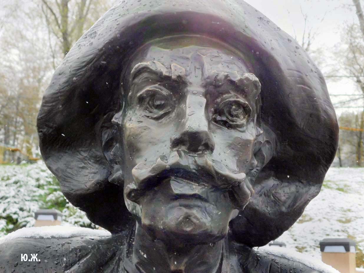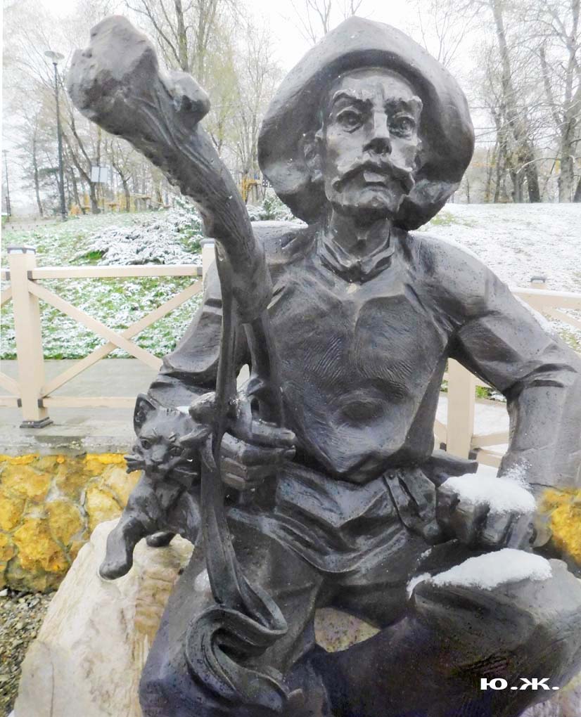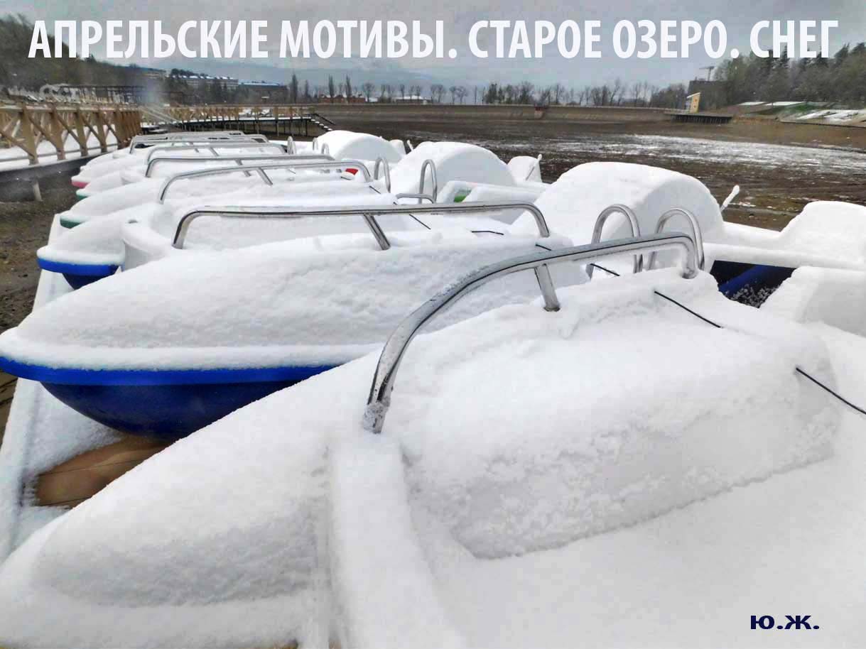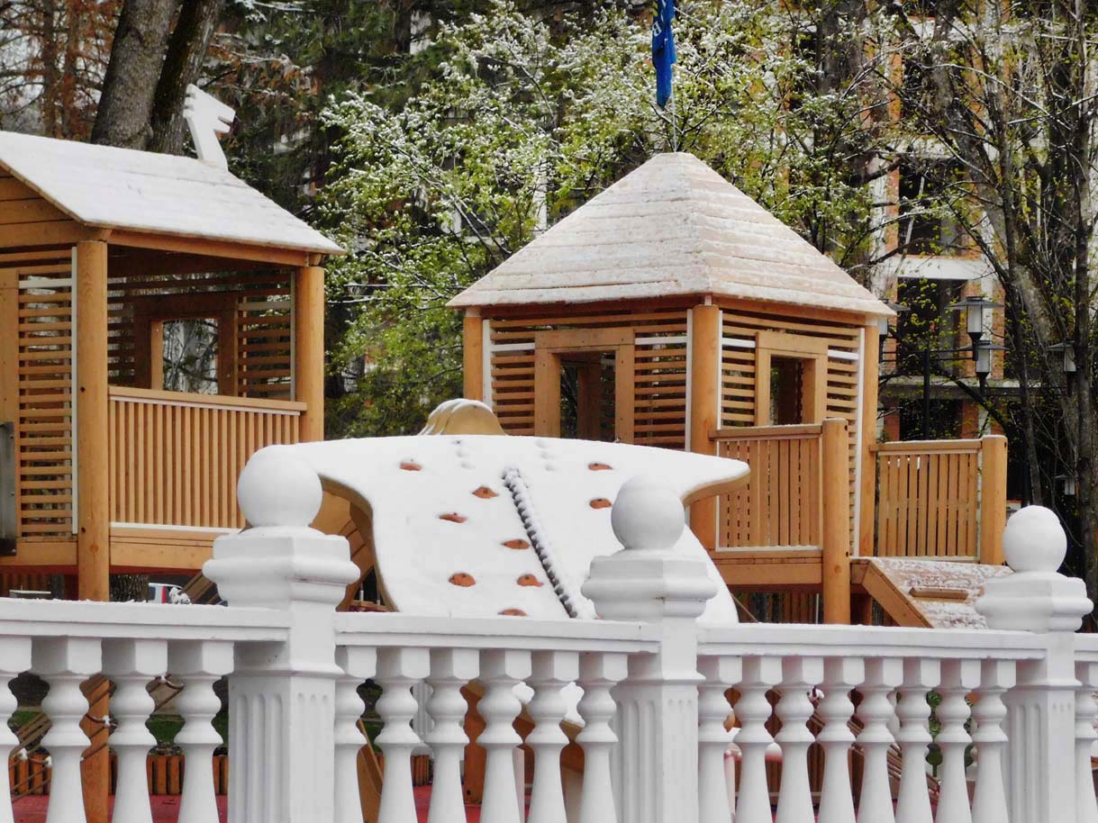 Первый раз видел бронзовых друзей в необычном одеянии. Особенно интересно выглядел загорающий молодой человек, засыпанный снегом по горизонтали. Просто стало его жалко: лежать в снегу в одной повязке и шляпе… Стройная бронзовая купальщица выглядела бодрее, была бы вода, говорят, в воде в апреле теплее, ей было бы совсем нипочем. Импозантный бронзовый рыбак со своим умным котом был в хорошей спортивной форме, и оба всматривались напряженно в туманно-снежную даль… А нашим бронзовым ребятам, что в игровом городке, никакой снег не страшен, как прыгали друг через друга на прошлой неделе, так и прыгают сейчас… Черепашка вся засыпана до головы снегом, разгребать пока его не буду.