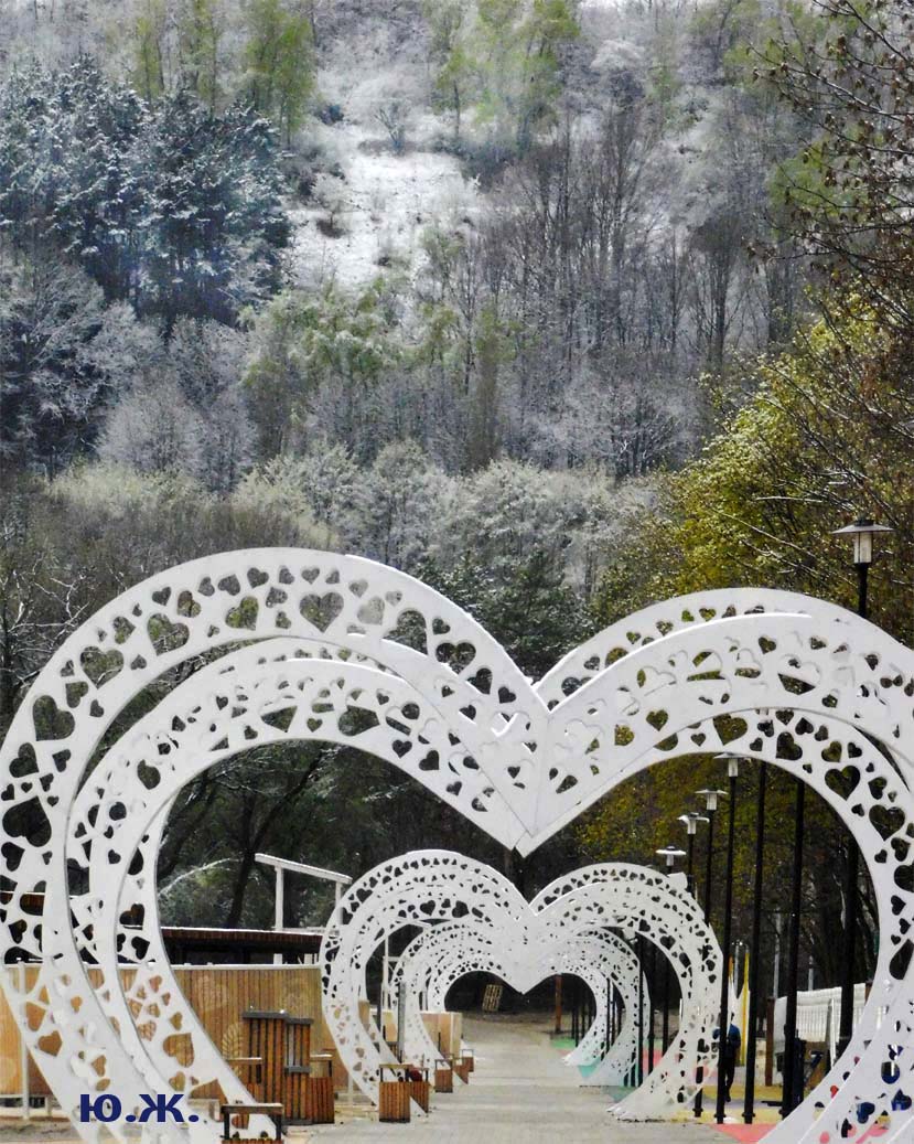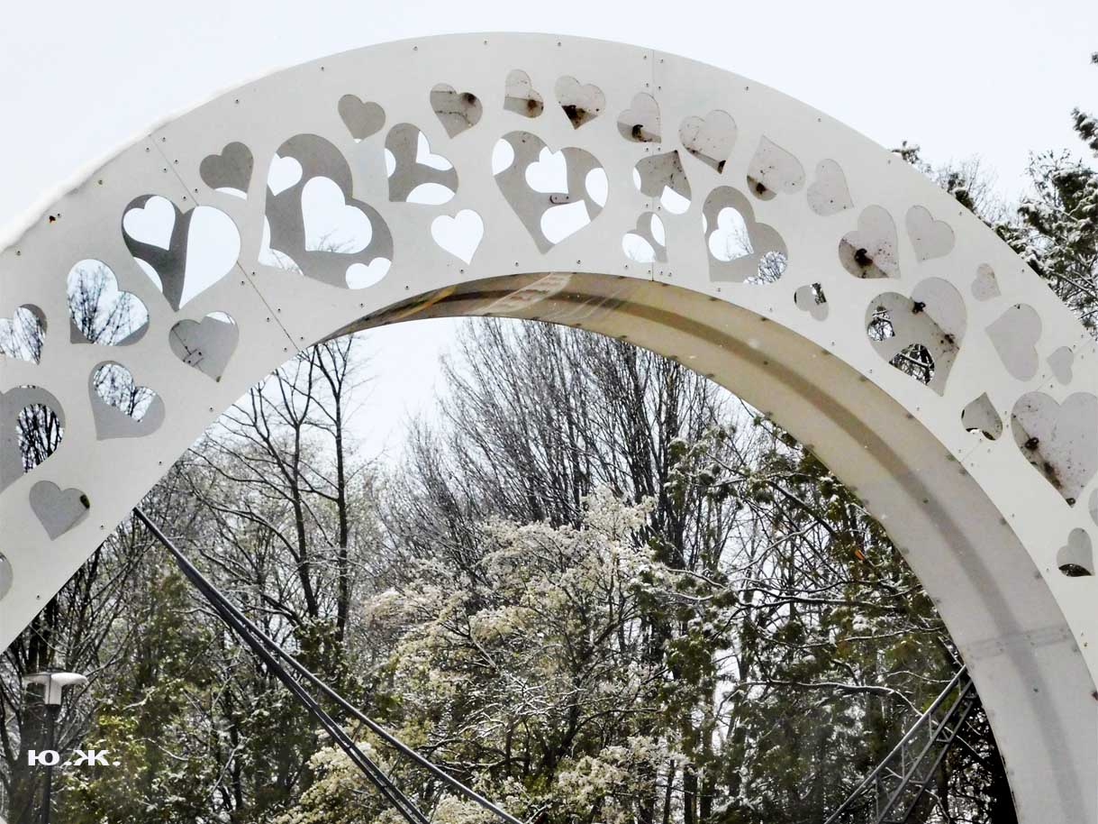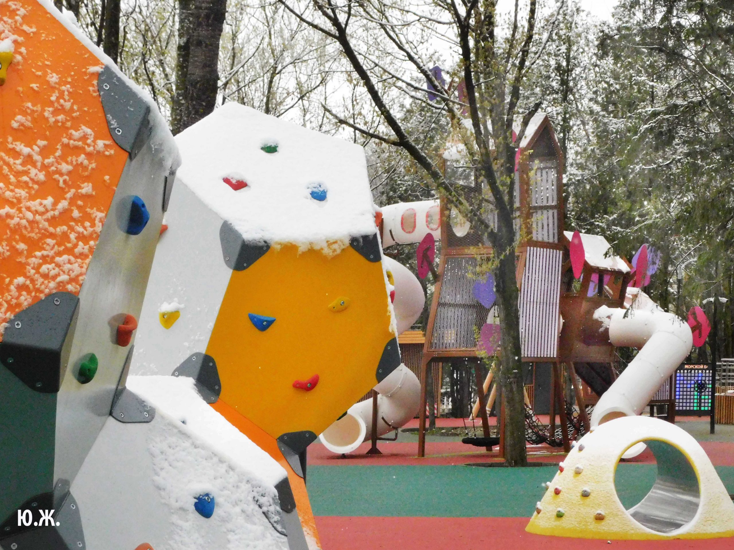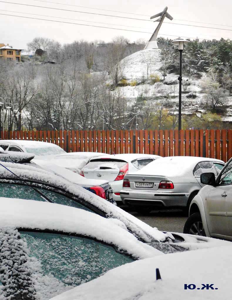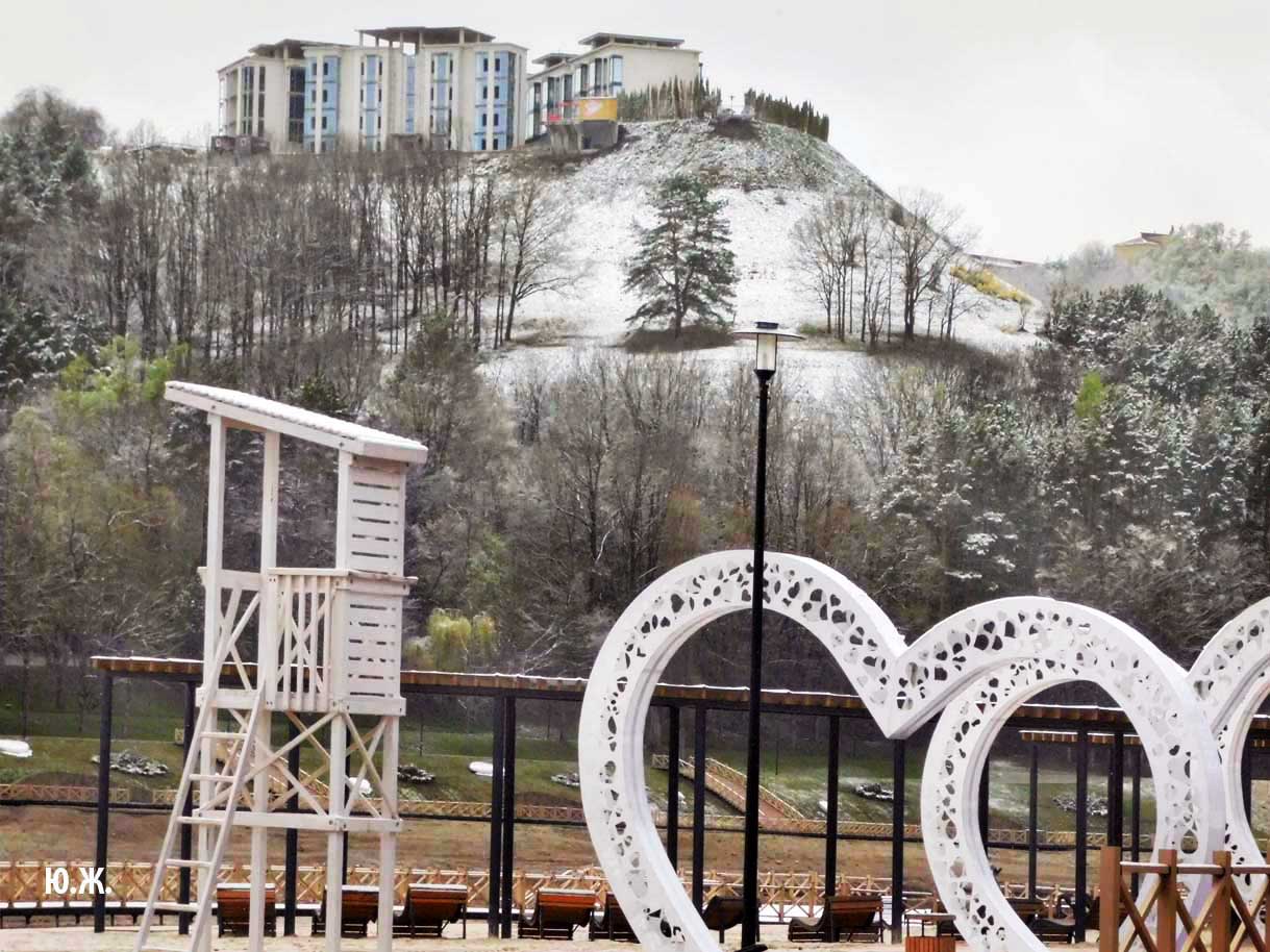 Первый раз видел бронзовых друзей в необычном одеянии. Особенно интересно выглядел загорающий молодой человек, засыпанный снегом по горизонтали. Просто стало его жалко: лежать в снегу в одной повязке и шляпе… Стройная бронзовая купальщица выглядела бодрее, была бы вода, говорят, в воде в апреле теплее, ей было бы совсем нипочем. Импозантный бронзовый рыбак со своим умным котом был в хорошей спортивной форме, и оба всматривались напряженно в туманно-снежную даль… А нашим бронзовым ребятам, что в игровом городке, никакой снег не страшен, как прыгали друг через друга на прошлой неделе, так и прыгают сейчас… Черепашка вся засыпана до головы снегом, разгребать пока его не буду.