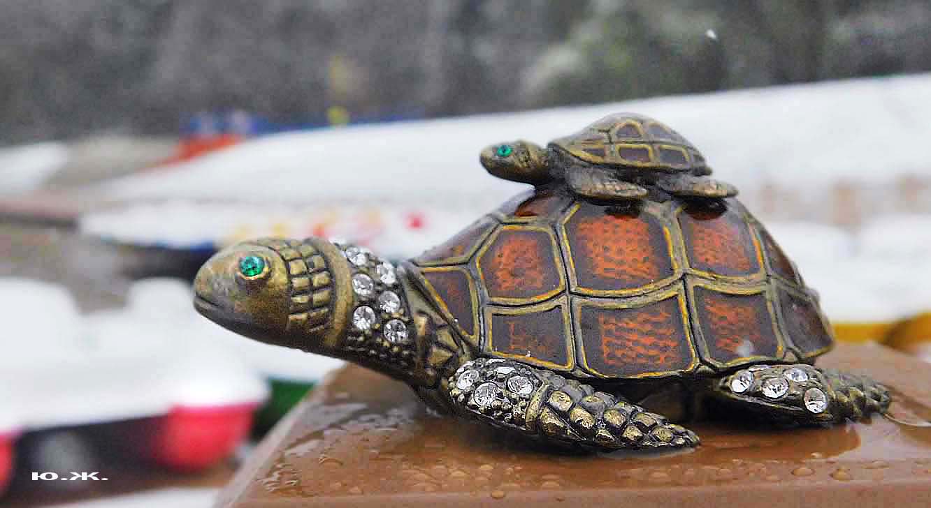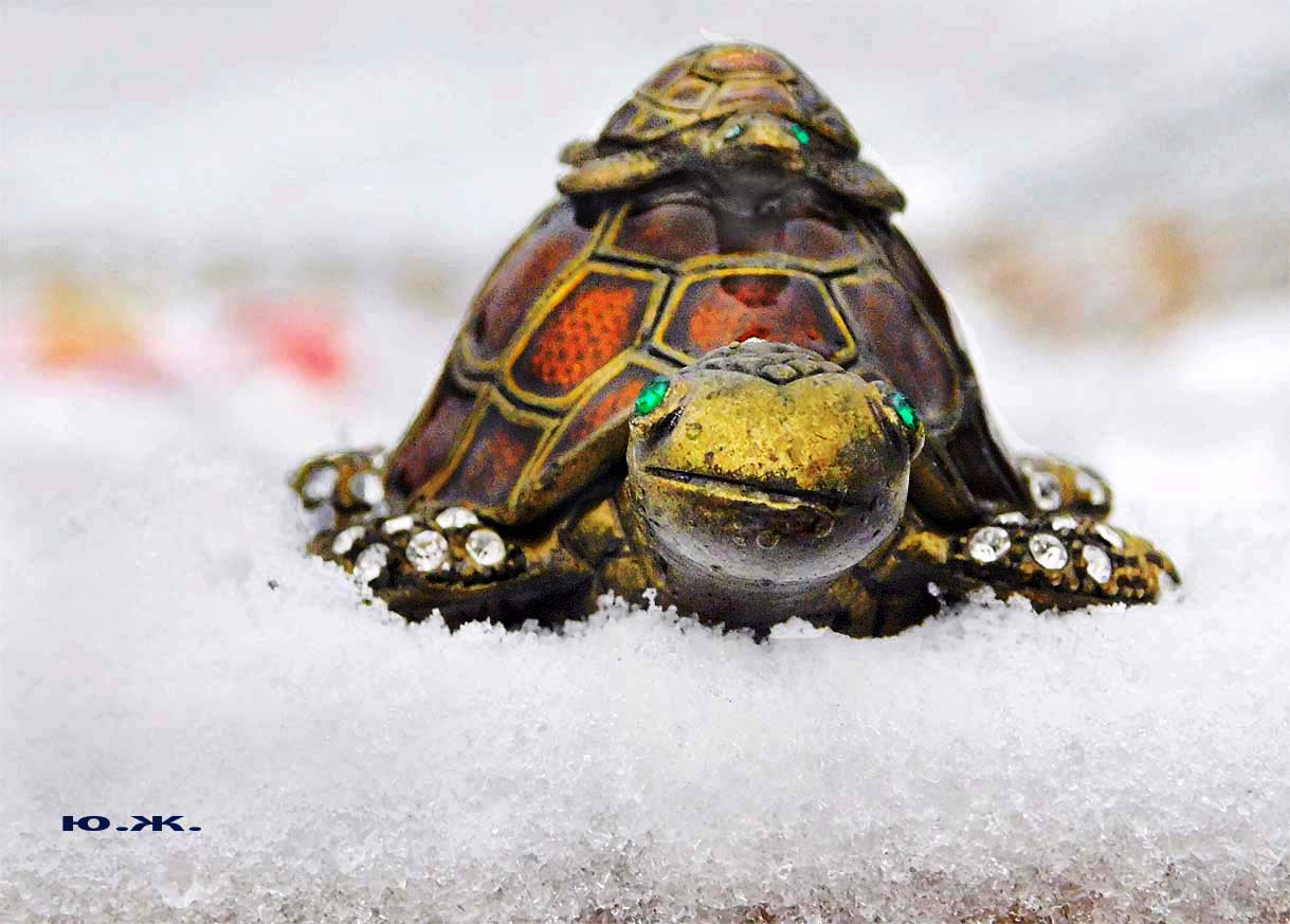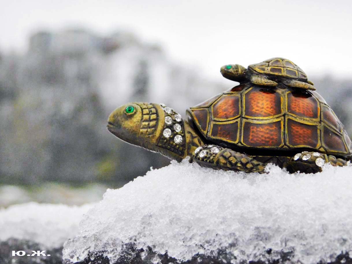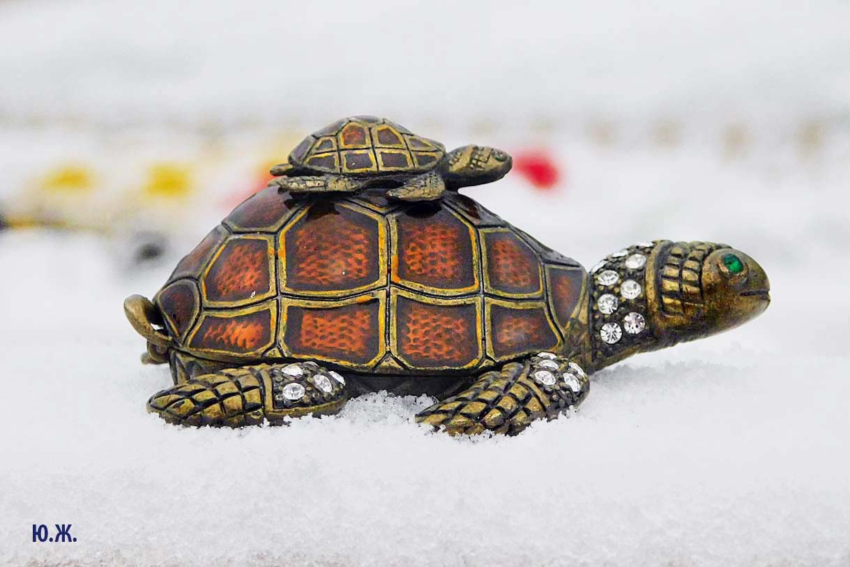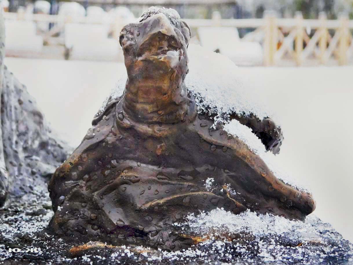 В Железноводском озере, очень похожем на наше, в западной его части, живут большие красивые черепахи. В этом месте всегда много и взрослых, и детворы. У нас на озере тоже есть бронзовая черепаха. Для начала. В моей фото кофре есть сюрприз — маленькая бронзовая черепаха. Талисман. Во время этого снега я ее фотографировал. Решил показать.