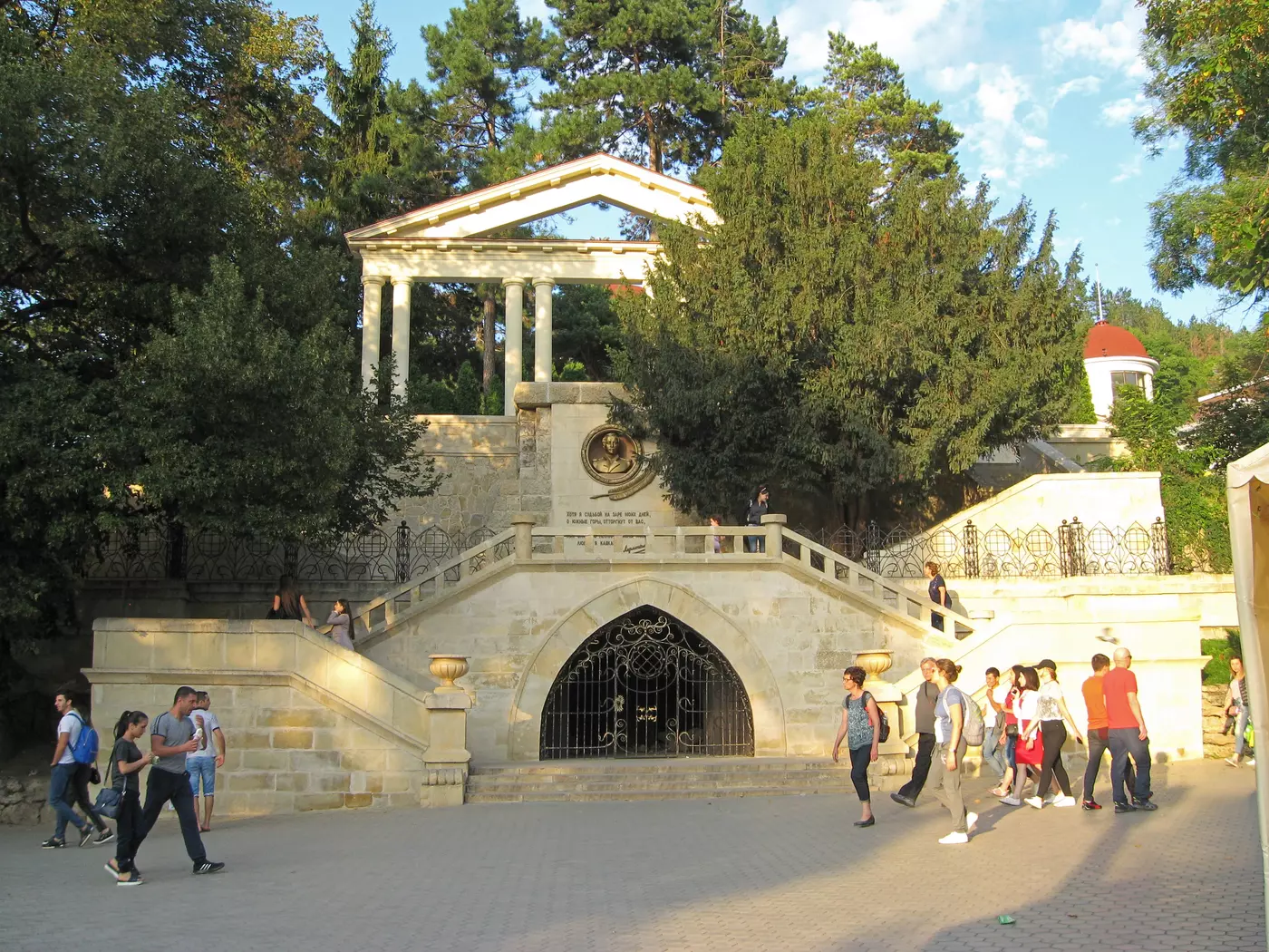 Еще одно лермонтовское место – площадка у Колоннады. Внизу у главной парковой аллеи — грот, где установлена скульптура Демона (скульптор Г. Курегян). Над гротом в круглой нише — бюст М.Ю. Лермонтова. Лермонтовская площадка возведена в 1948 году на месте старого здания Ресторации. В ней останавливался Александр Сергеевич Пушкин, ее посещал и Лермонтов. В повести «Княжна Мери» читаем: «В ресторации, построенной на холме, в нескольких шагах от моей квартиры, начинают мелькать вечером огни сквозь двойной ряд тополей; шум и звон стаканов раздаются до поздней ночи».