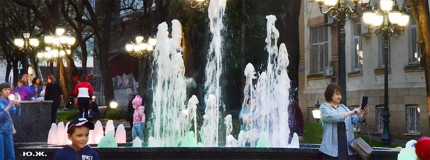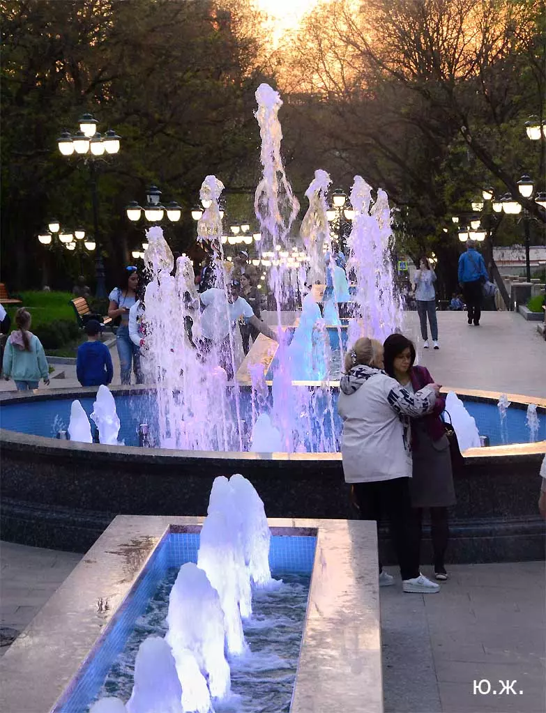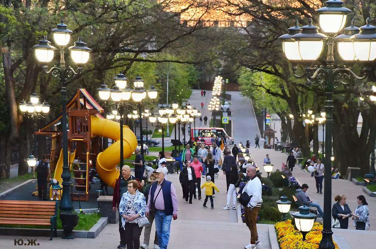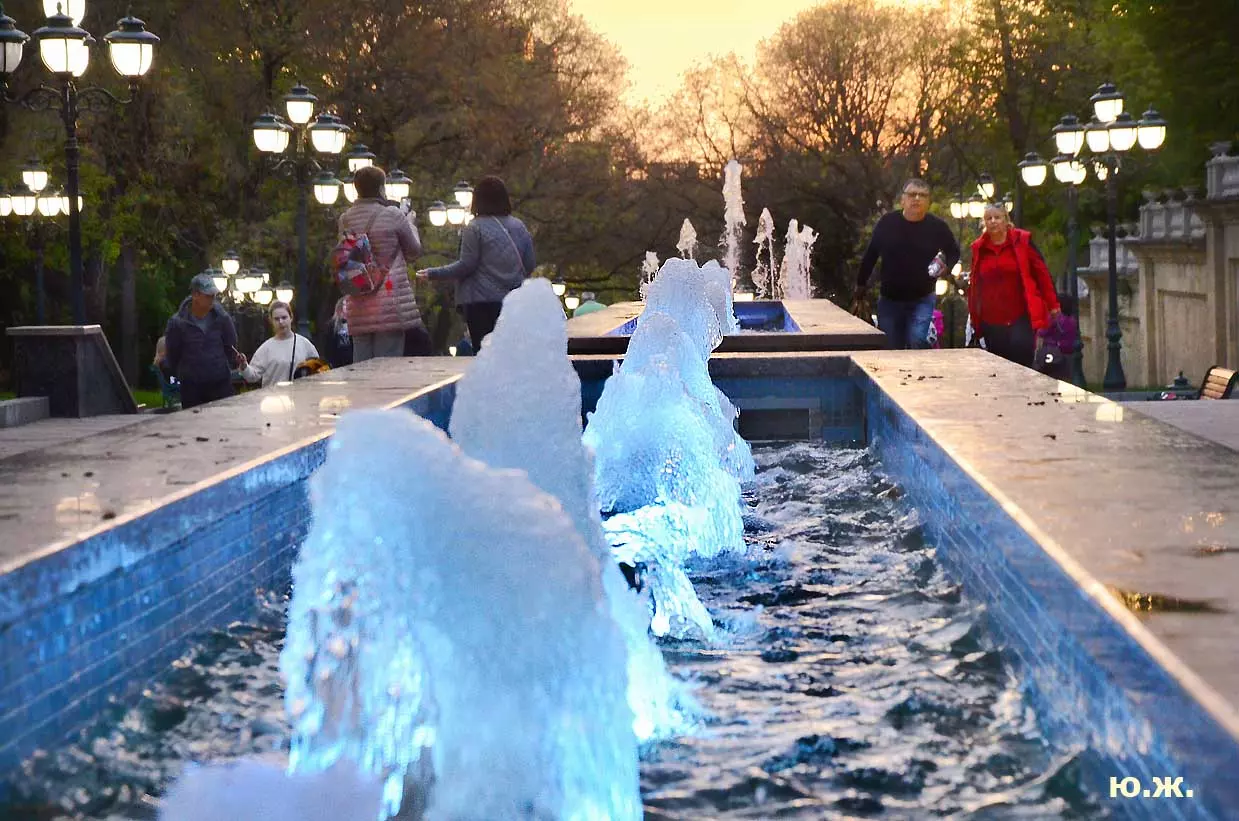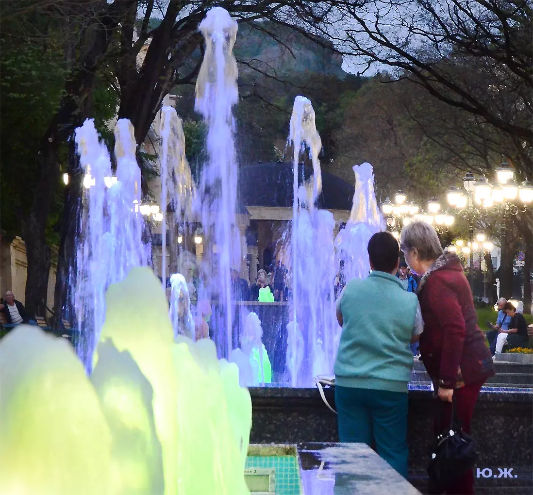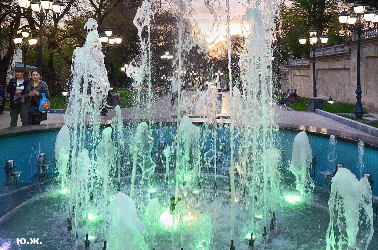Сегодня у нас вечерний проспект с его фонтанами, недавно запущенными, с его неспешным променадом недавно пришедшим сюда с Курортного бульвара, но имеющим не такой ровный рельеф как на проспекте. Здесь много ступенек поднимающих нас вверх и спускающих вниз, у него большая протяженность, а значит, помимо всего позитивного, как теренкур, он будет тренировать и наши ноги, сердце, легкие…