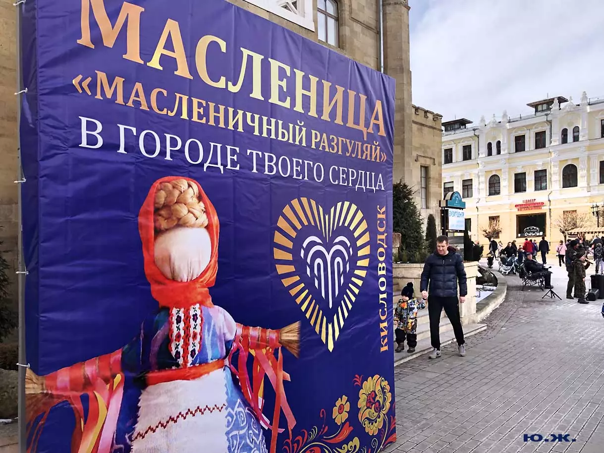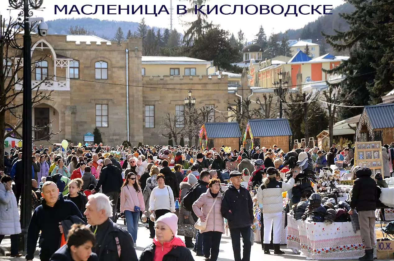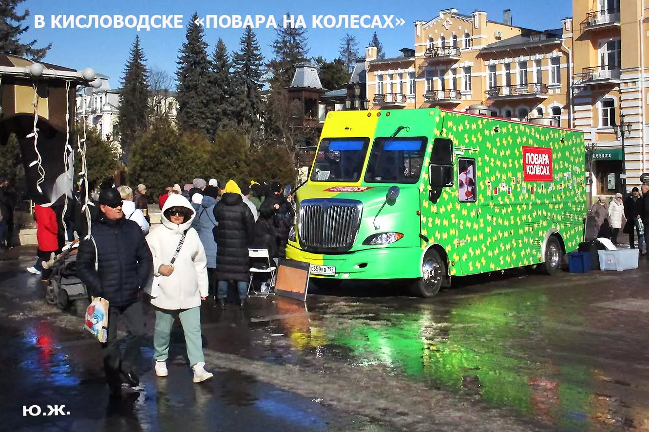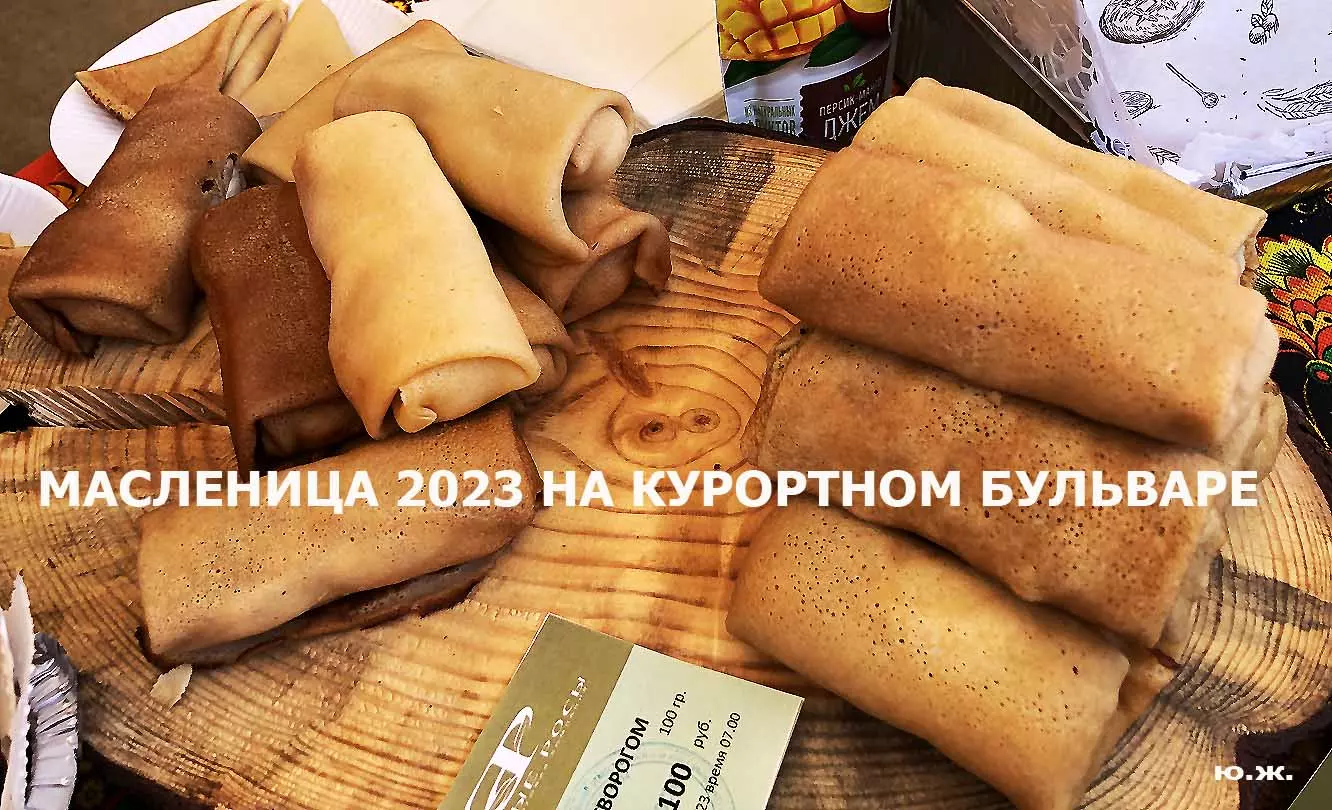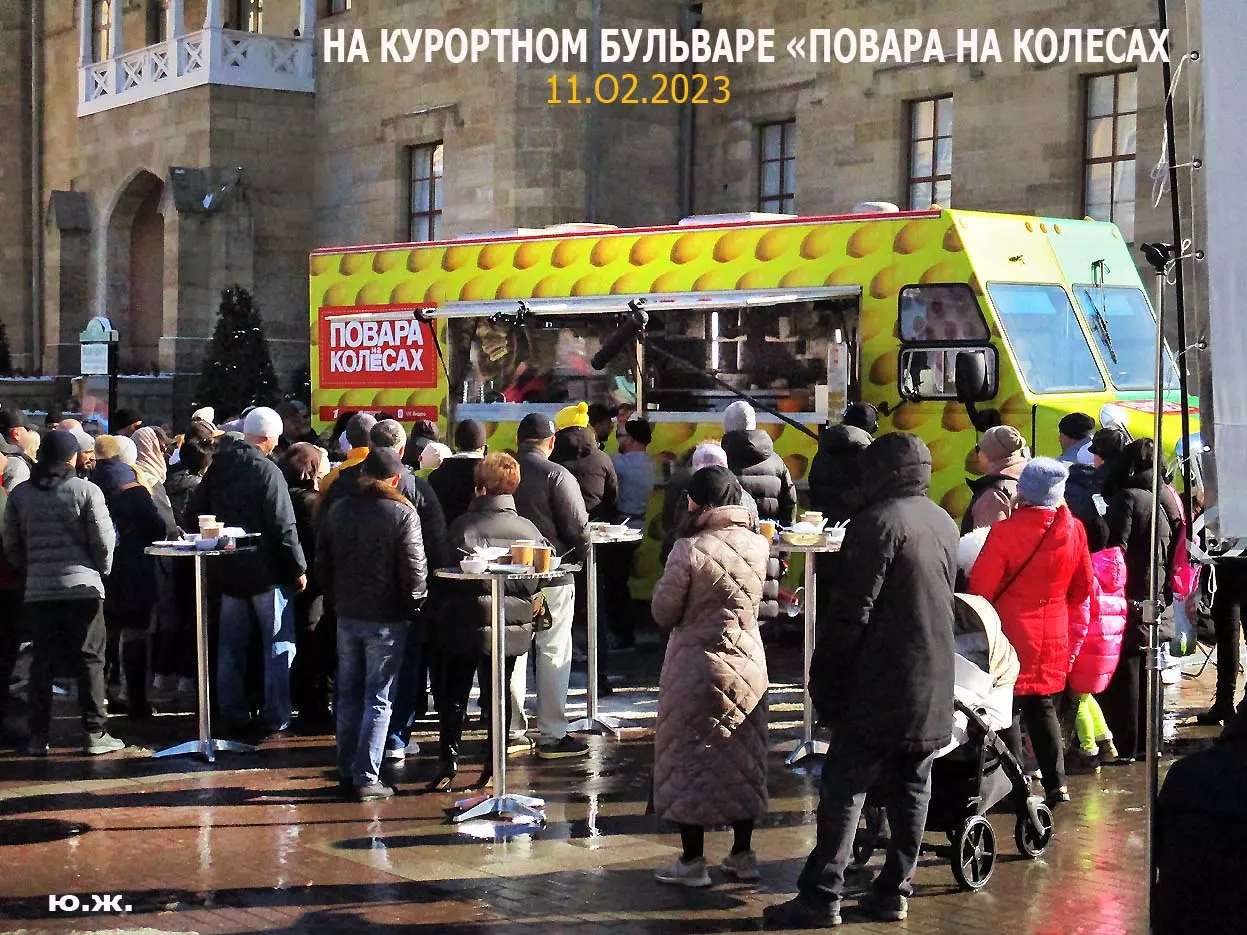 На Курортном бульваре в киоске, что у Визит-центра, был большой выбор блинов и всего того, что их сопровождает. Рядом стояли девушка и молодой человек в русских народных костюмах и держали яркое чучело — тоже атрибут масленицы. Я не так давно снимал группу поваров в красивом автобусе-кухне с надписью «ПОВАРА НА КОЛЕСАХ», серьезную группу, снимающую фильм о Кисловодске и его кухне, вокруг были расставлены высокие столики, повара готовили, люди дегустировали стоя. Все это немного перекликается с сегодняшней Масленицей — с павильоном, где готовились и продавались многочисленные виды блинов и джемов.