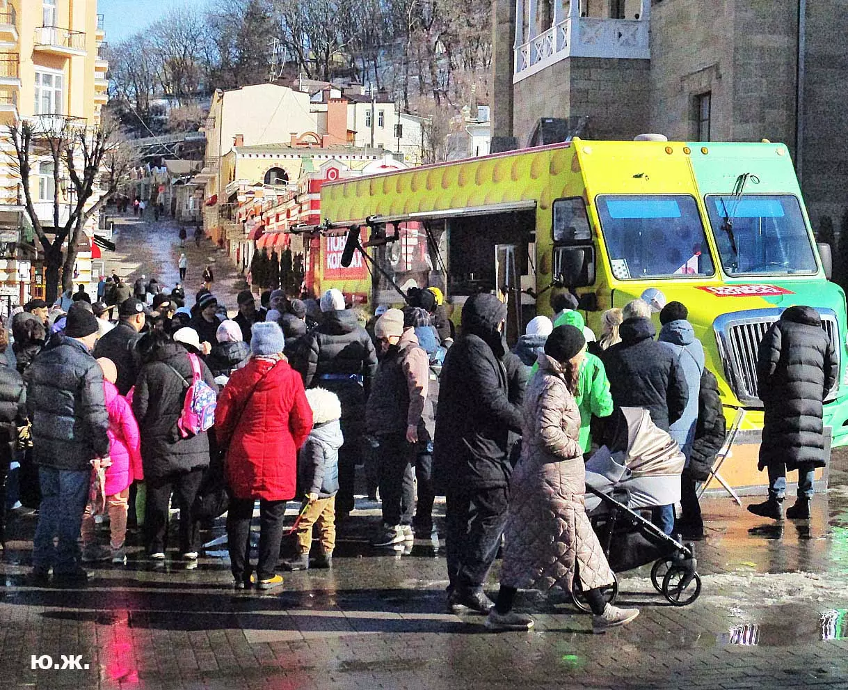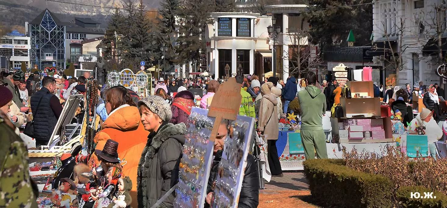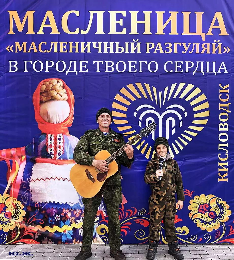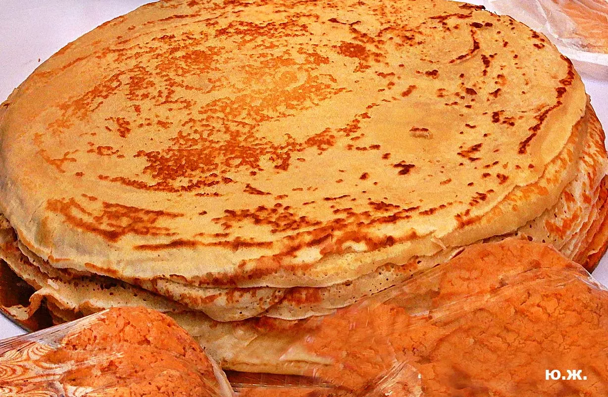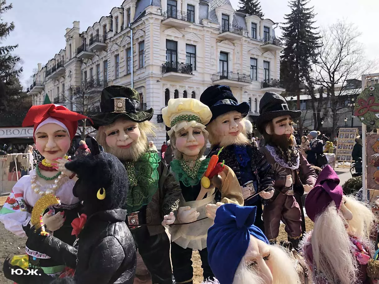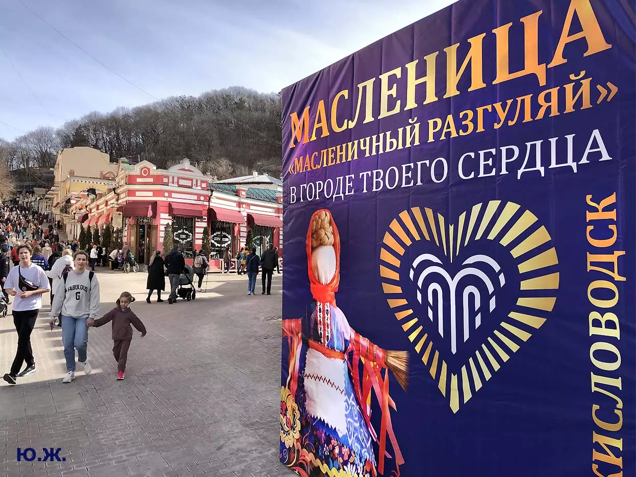 На Курортном бульваре в киоске, что у Визит-центра, был большой выбор блинов и всего того, что их сопровождает. Рядом стояли девушка и молодой человек в русских народных костюмах и держали яркое чучело — тоже атрибут масленицы. Я не так давно снимал группу поваров в красивом автобусе-кухне с надписью «ПОВАРА НА КОЛЕСАХ», серьезную группу, снимающую фильм о Кисловодске и его кухне, вокруг были расставлены высокие столики, повара готовили, люди дегустировали стоя. Все это немного перекликается с сегодняшней Масленицей — с павильоном, где готовились и продавались многочисленные виды блинов и джемов.