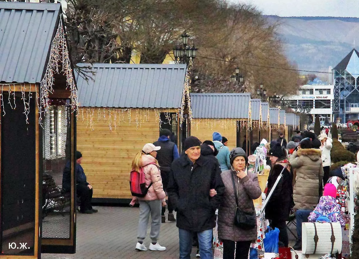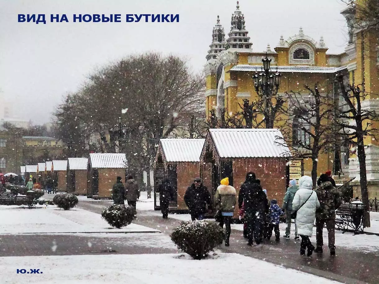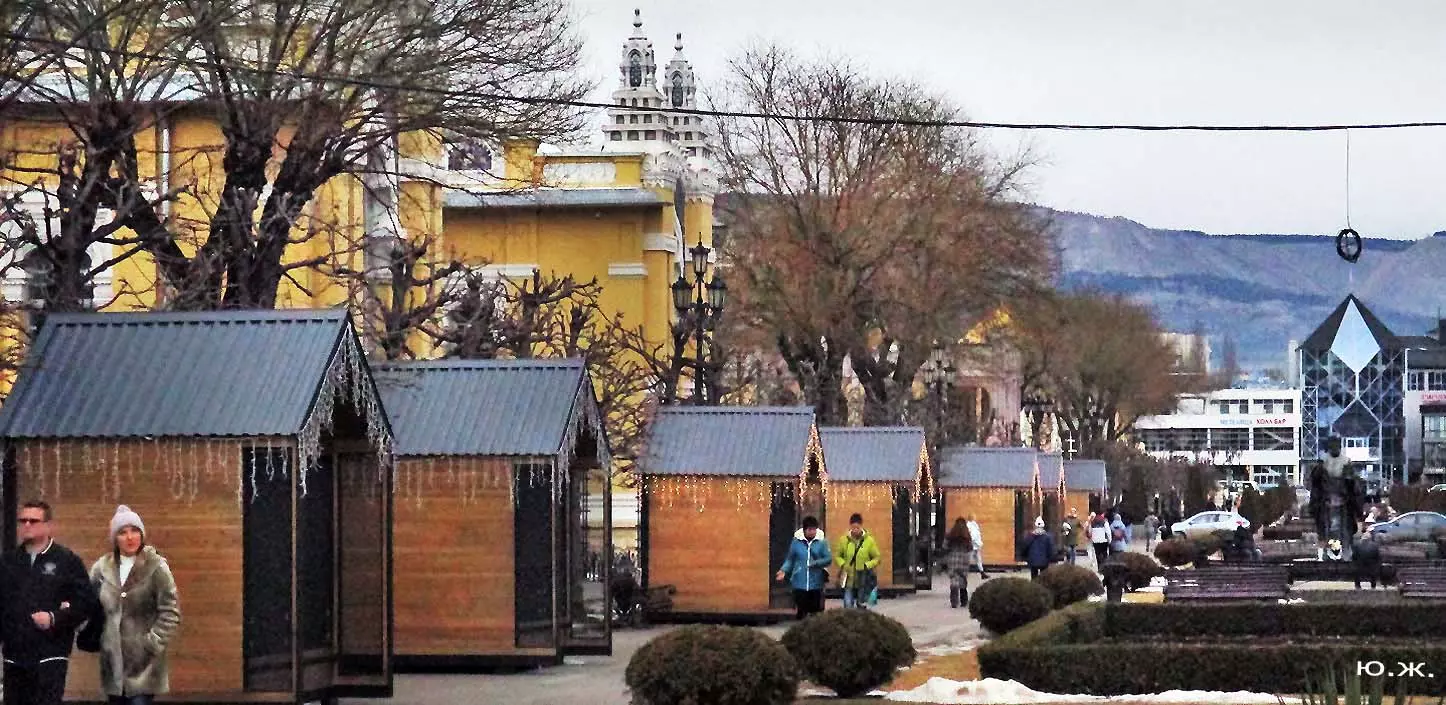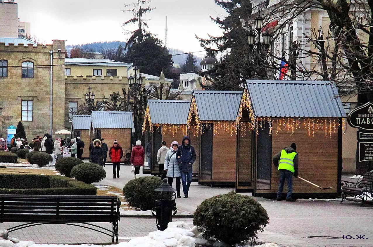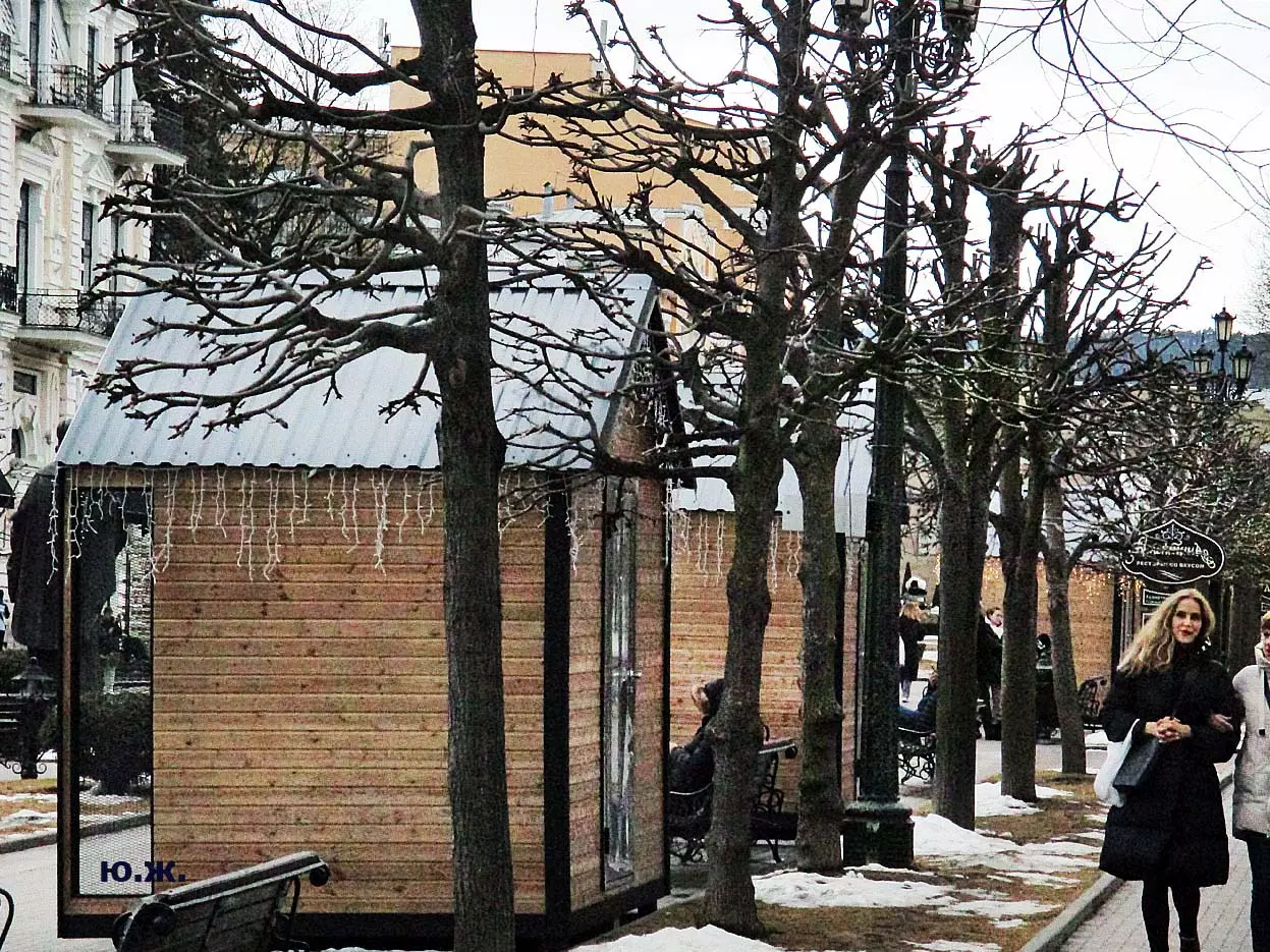 В конце я хотел бы сказать несколько слов о новых постройках, киосках, ларьках, домиках (у них много названий), расположенных с одной стороны Курортного бульвара и стоящих закрытыми уже почти два месяца — после встречи Нового года. В этой подборке довольно много фотографий, где они представлены. Я выскажу здесь свое личное мнение. Эти деревянные постройки совершенно не вписываются в Курортный бульвар. Кроме того, они закрывают его архитектуру, дробят ее. Здесь бывает много экскурсионных групп. И на что они будут смотреть?