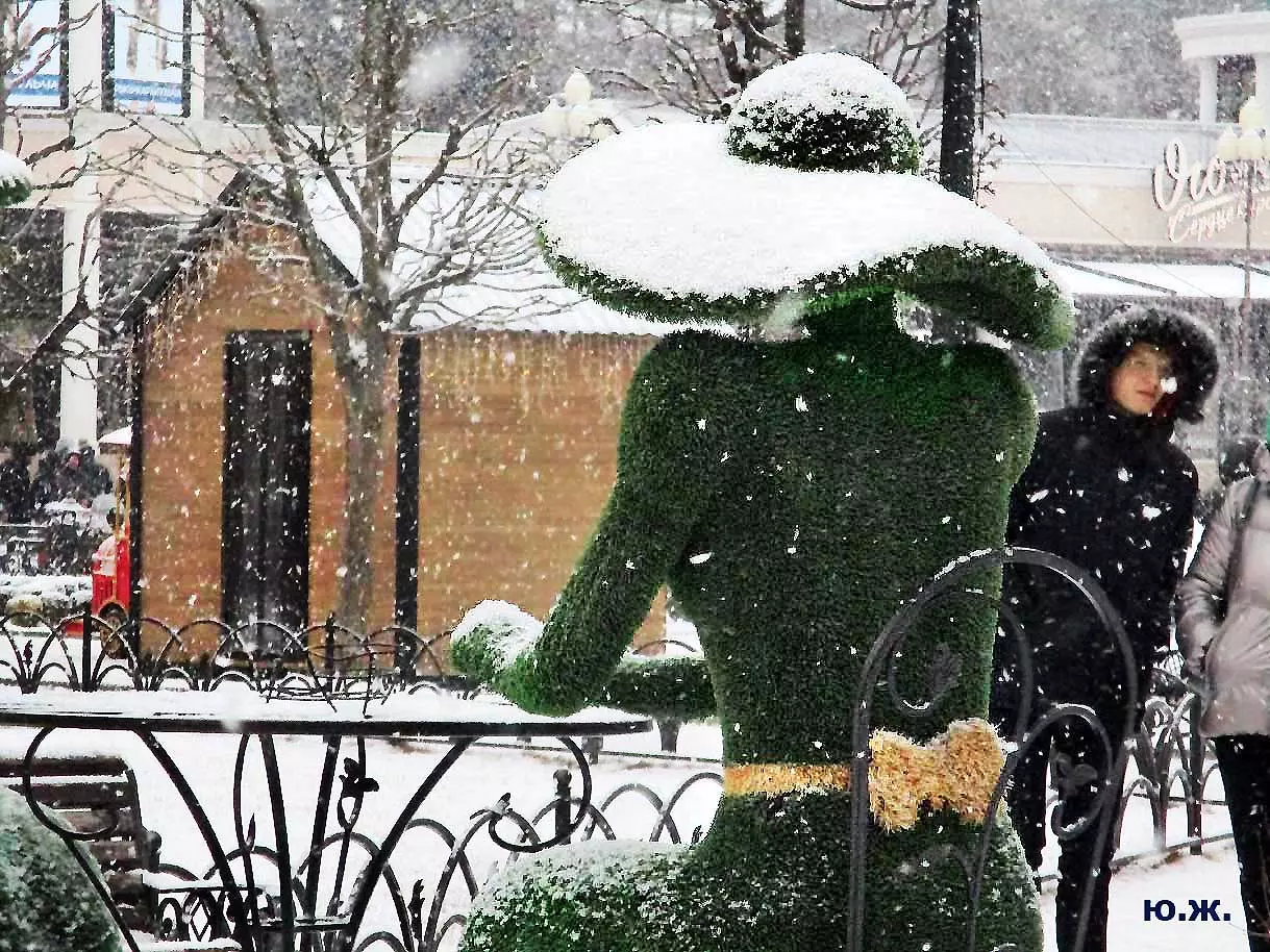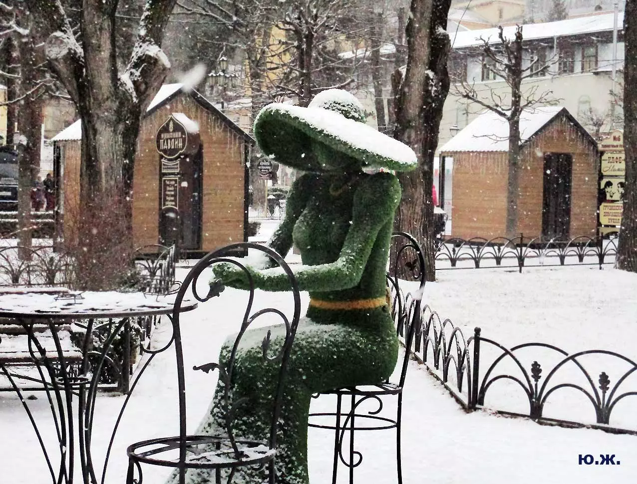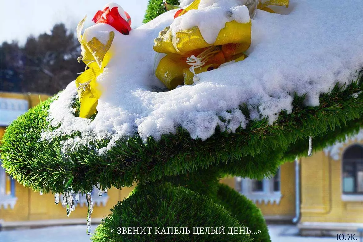 У меня приход весны в последние годы связан с зелеными скульптурами у Нарзанных ванн, когда с красивых шляпок девушек, при отрицательных ночных температурах в солнечное утро с сосулек капает капель … Весна. «Звенит капель целый день с утра и…». Вспоминается эта песня о капели шестидесятых певца Жана Татляна. Сейчас ее тоже можно слушать — набирайте в интернете.