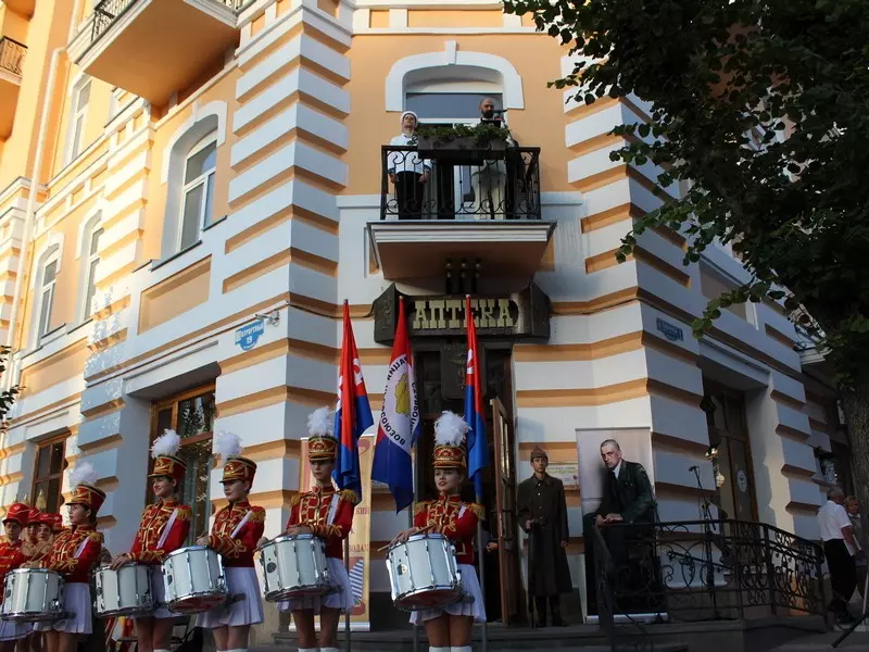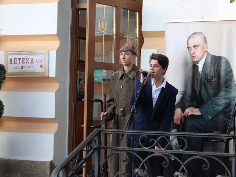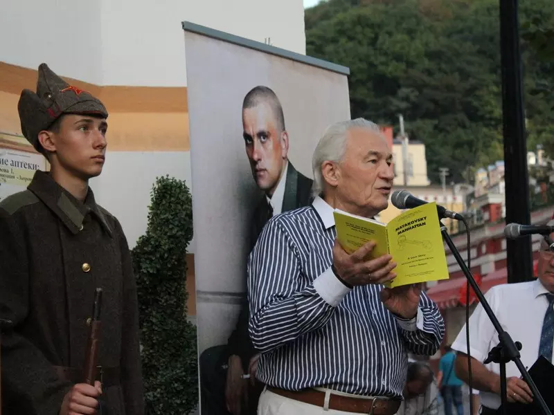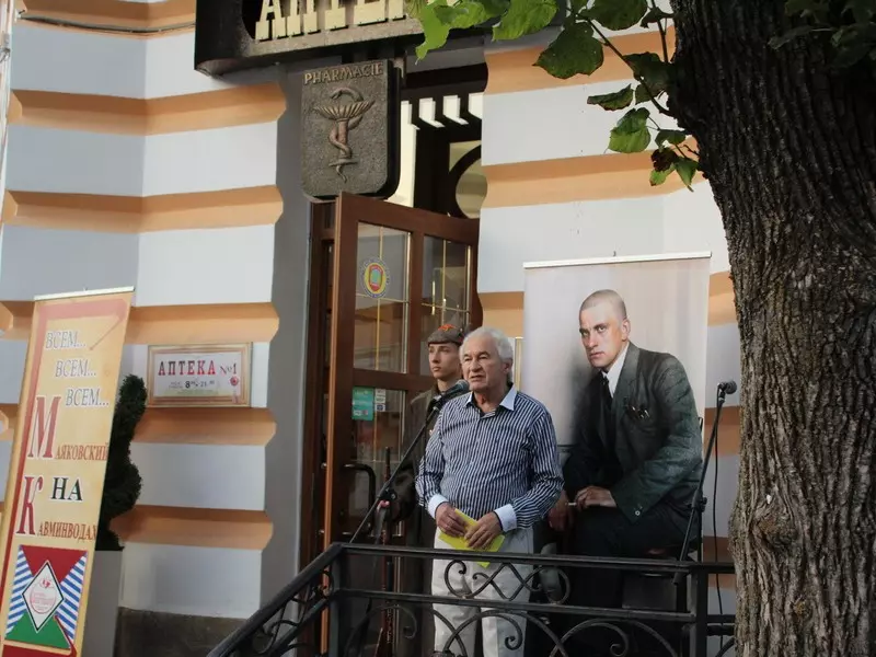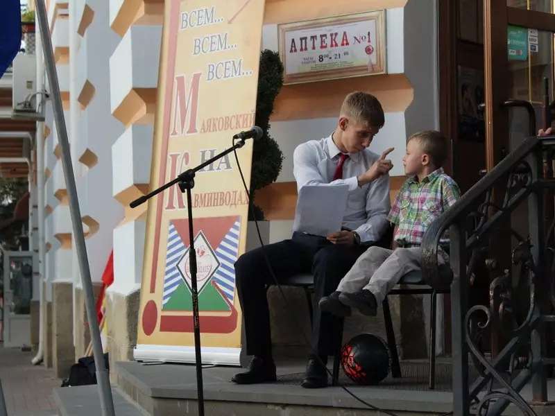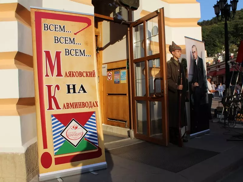 Кисловодчане стали свидетелями исторического события. Ровно 90 лет назад, в сентябре 1927 года, в городах Кавказских Минеральных Вод запестрели многочисленные афиши: Владимир Маяковский «Разговор-доклад: Всем – всё». Осенью поэт остановился в гостинице «Гранд-отель» Кисловодска, занимая угловой 121-й номер на втором этаже, ныне 225-й. Сегодня, как и почти век назад, актер театра-музея «Благодать» Аслан Астежев в образе Маяковского, рассекал воздух с балкона четкими, «сочными» строками, доносившимися на весь Курортный бульвар.