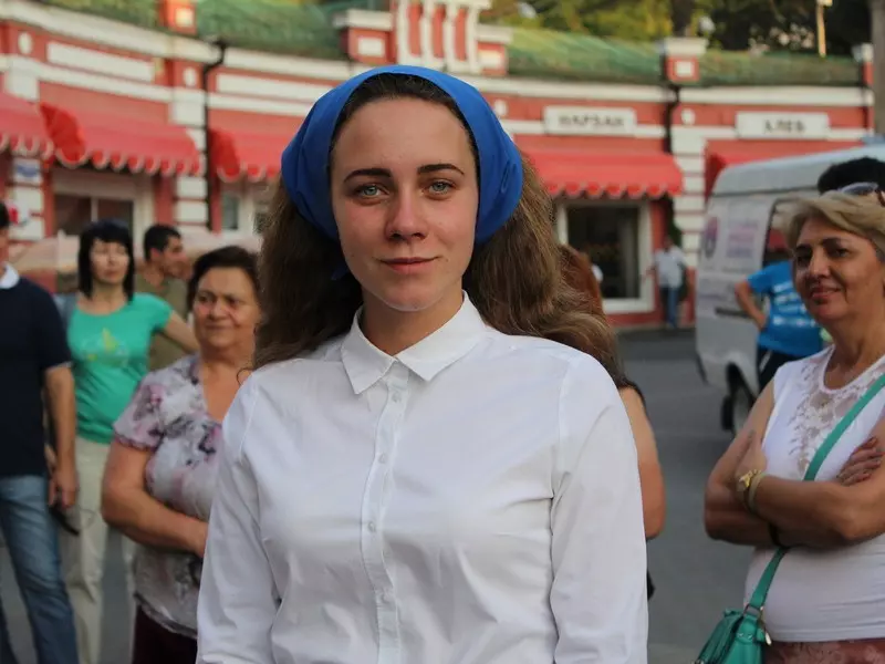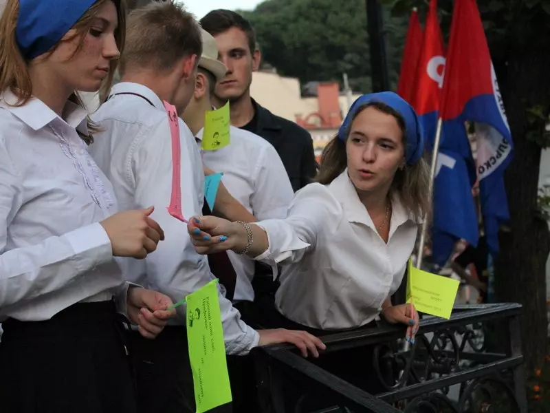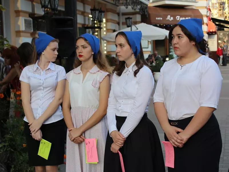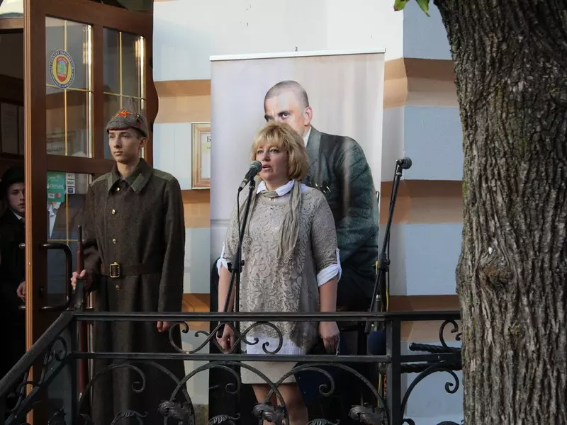 «Маяковский ворвался в поэзию своим высоким ростом. Поэт-новатор, поэт-футурист, «певец машинного века», как говорили про него критики, он не мог остаться равнодушным ни к одному из значимых для страны событий». Она провела небольшой экскурс в историческое прошлое страны, рассказав о VIII Московском губернском съезде профсоюзов 1927 года. Многие «мозаичные» детали, такие как лозунги, синие платки и рабочая форма, словно оживили описанную поэтом советскую эпоху в Кисловодске.
