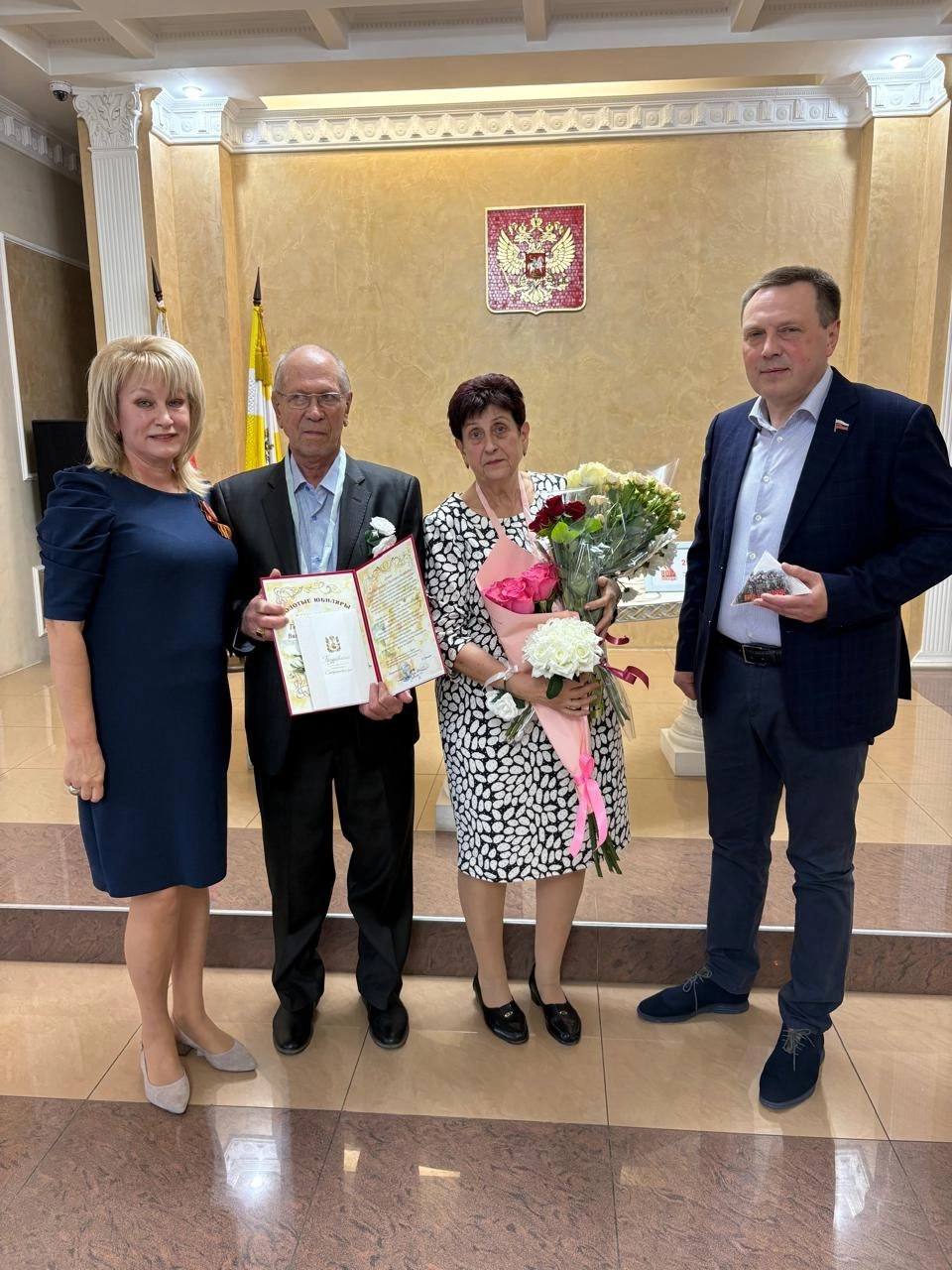 Супруги с «золотым стажем» семейной жизни оставили автограф в Книге почетных юбиляров ЗАГСа, получили из рук заведующей ЗАГСа Ольги Данцовой поздравительную открытку от губернатора Ставропольского края Владимира Владимирова, памятный адрес «Золотые юбиляры». А пришедший поздравить семейную пару депутат кисловодской думы Герман Шаклеин, принял от юбиляров письмо, которое передаст бойцам на передовую, как пример любви и верности вторых половинок и родных, ожидающих дома.