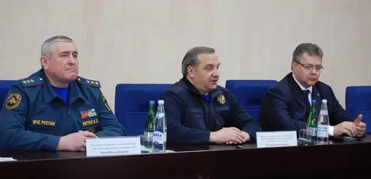 Слева направо: главный врач Центра Алексей Агафонов, губернатор СК Владимир Владимиров, министр МЧС Владимир Пучков, и сопровождающие лица