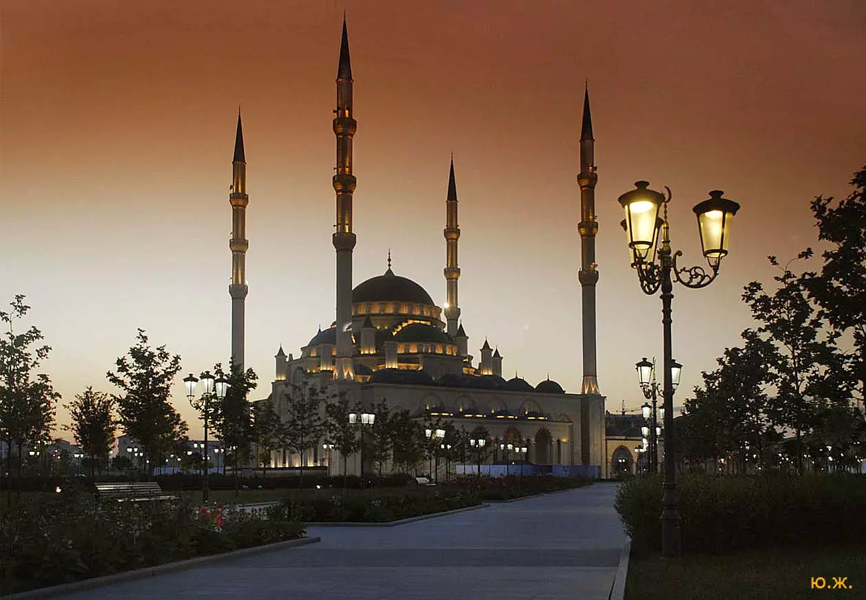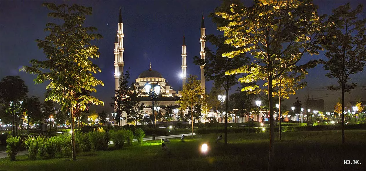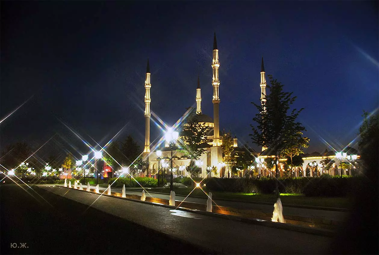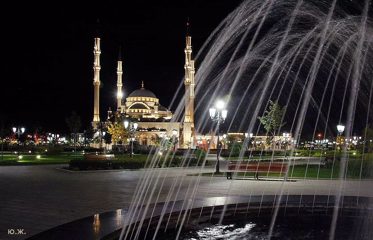Лучшее время для съемок там, конечно, май, когда сочная, пышная южная растительность бывает нежно-зеленых оттенков, цветут крупные дикие алые маки, а когда идет весеннее становление погоды и в небе часто появляются красивые облака — случаются быстро проходящие дожди, делающие атмосферу чистой и прозрачной, без атмосферной дымки, и изумительный снежный Кавказский хребет предстает во всей своей красе… Так все и складывалось. За мной посылают автомобиль и мы направляемся на юго-восток, как раз при красивых кучевых облаках. Не люблю снимать при чистом, пустом, не интересном небе — такое большое пространство остается незаполненным. После Георгиевска короткий сильный ливень, появляется радуга, останавливаемся это запечатлеть — пригодится. Начинаются красивые места, вдоль трассы видим дикие маки. С низкой точки съемки, с земли, они в кадре оказываются вместе со сверкающим белизной снежным хребтом. Уже к вечеру въезжаем в Грозный, и я прошу сразу же подъехать к знаменитой Мечети «Сердце Чечни». Здесь огромное пространство, все в зелени, роскошных клумбах, мощных фонтанах. Все в великолепной подсветке. Недалеко от Мечети растут, поднимаются вверх билдинги, высотки. Пока еще небо темно голубое, а силуэты высоток, башни минаретов и сам город четко прорисовываются на его фоне, делаю несколько пробных снимков вокруг. Завтра начинается настоящая съемка. Еще несколько минут — и мы уже в темноте въезжаем на красивую территорию, где много отдельно стоящих коттеджей. В один из них и выгружаем мое оборудование: штативы, свет, цифровую фотоаппаратуру — правда, на то время она была еще не так совершенна, как сейчас. В заключение этого дня представляют моего водителя, он же все эти дни будет меня охранять и — оберегать. Правда,так и не узнал, от кого.