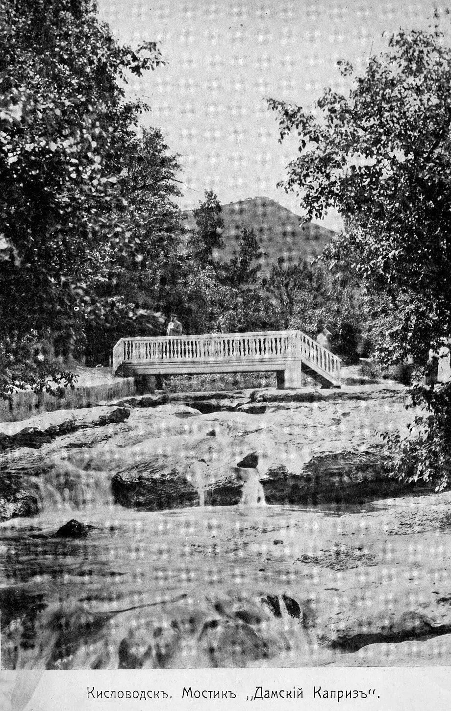 Свое название мостик получил благодаря одной капризной даме, которая во время прогулки по набережной отказалась переходить на другой берег реки по камням. В свою очередь галантному кавалеру, сопровождавшему её, пришлось перенести эту даму на руках. После чего он и дал обещание построить мост. Предположительно, первый мостик у подножия Романовской горки появился около 1892 года. Это было связано с сильным наводнением 14 мая 1890 г., которое уничтожило все парковые мосты на Ольховке. Было сделано основательное укрепление правого берега Ольховки в этом месте, отчего он стал значительно выше левого. Перейти речку по камням стало невозможно, и в этом узком месте был сооружен небольшой деревянный мостик. Первоначально мостик назывался просто «Первым». Деревянный однопролетный мостик длиной 6,5 м. восточным краем лежал на стенке правого берега, а с его западного края была устроена деревянная лестница. Несмотря на всю простоту, мостик, выкрашенный белой краской, выглядел изящно благодаря резной балюстраде. Автором первого проекта этого мостика был, вероятно, главный архитектор Вод Яков Григорьевич Лукашев. Спустя несколько лет элегантный мостик получил название «Дамский каприз». Мостик около пяти раз менял свой облик из-за наводнений и ветхости отдельных частей. В конце 2016-17 г.г. мостик был снова отреставрирован.