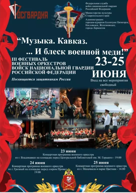 С 23 по 24 июня жителей и гостей городов Кавминвод ждут на открытых площадках, где выступят оркестры Росгвардии из Владикавказа, Махачкалы и Грозного.