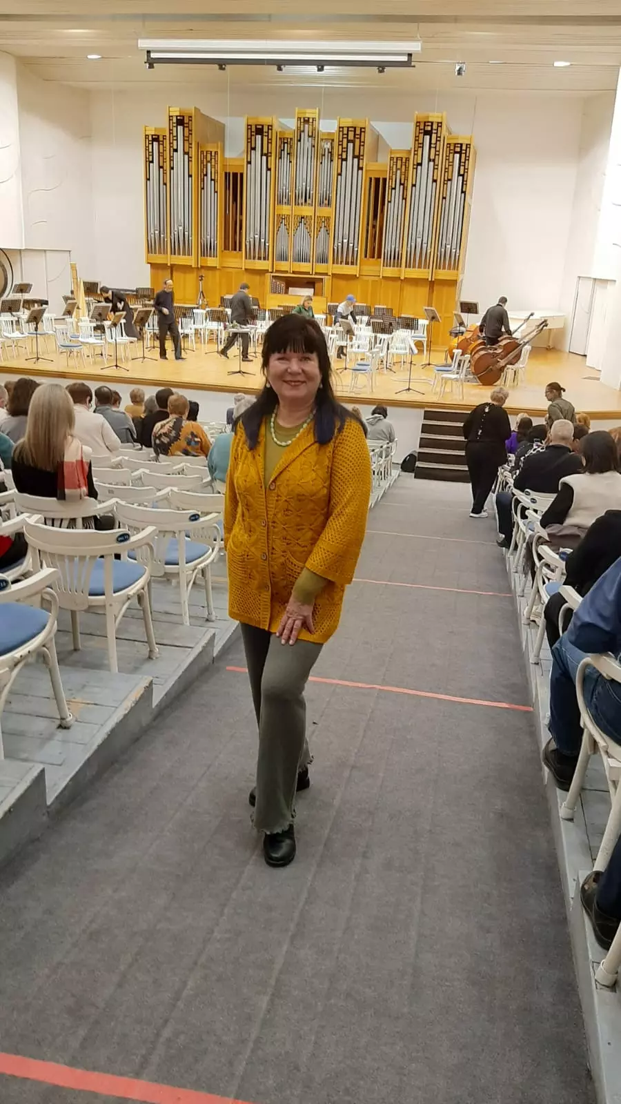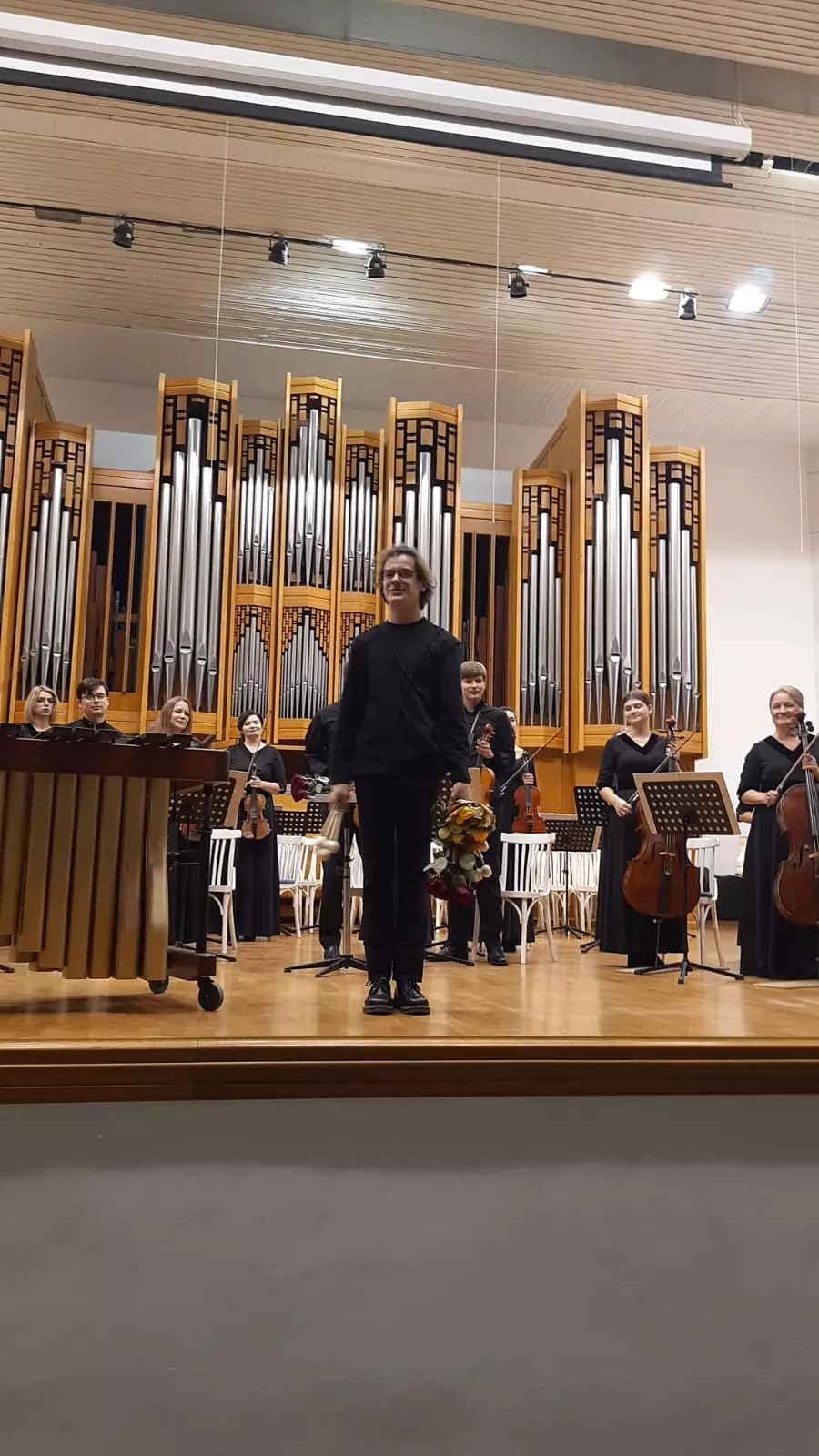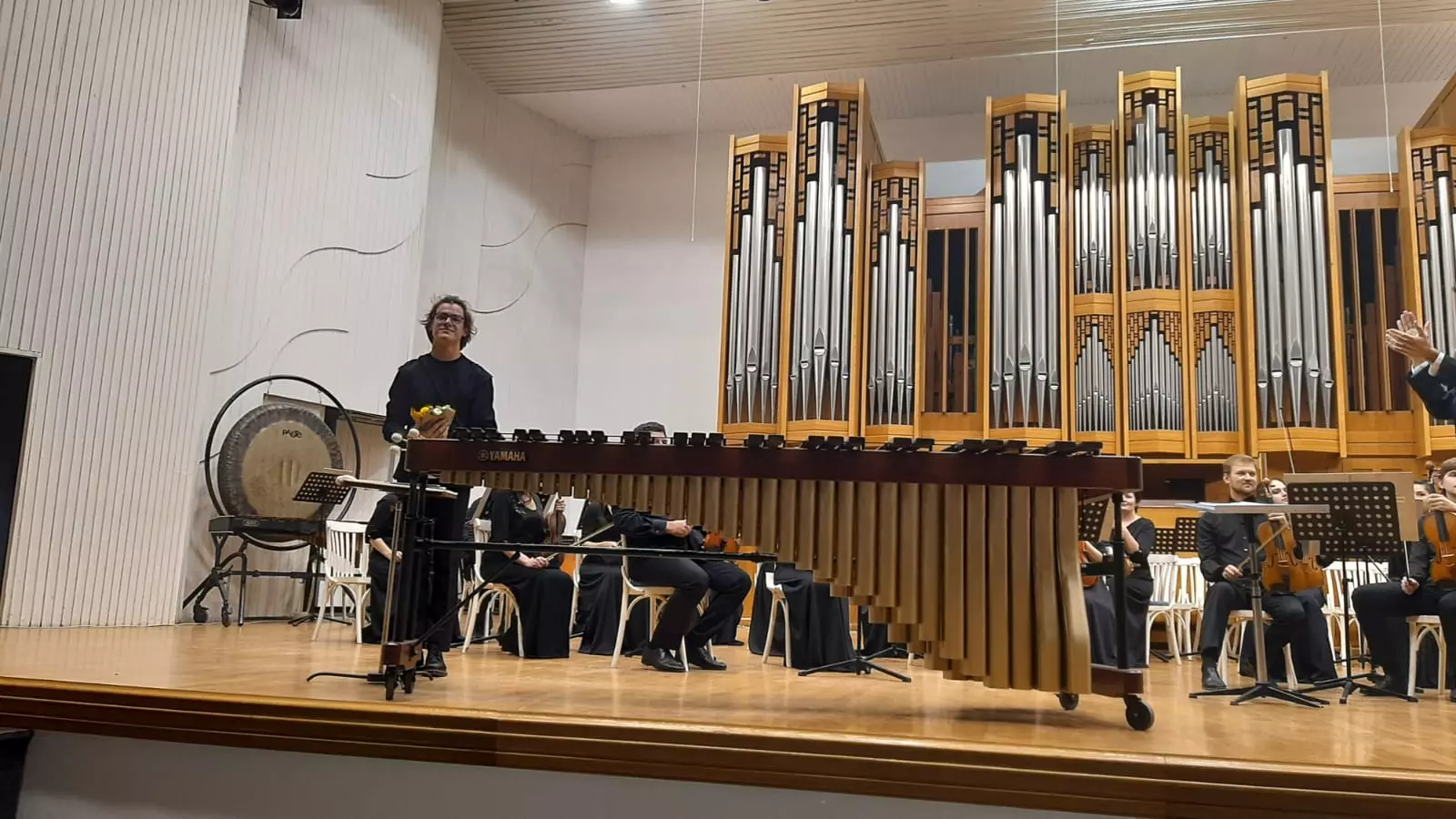 В первом отделении звучал Концерт для маримбы со струнным оркестром современного французского композитора Э.Сежурне, профессора и руководителя факультета ударных инструментов Страсбургской консерватории. Его произведение выразительно, так как звучание маримбы придает музыкальному произведению объемное звучание. Эти звуки, как горные «ручьи», стекающиеся с гор и подхваченные общим потоком струнного оркестра, вместе наполняют «реку», которая уже спокойно течёт по равнине.