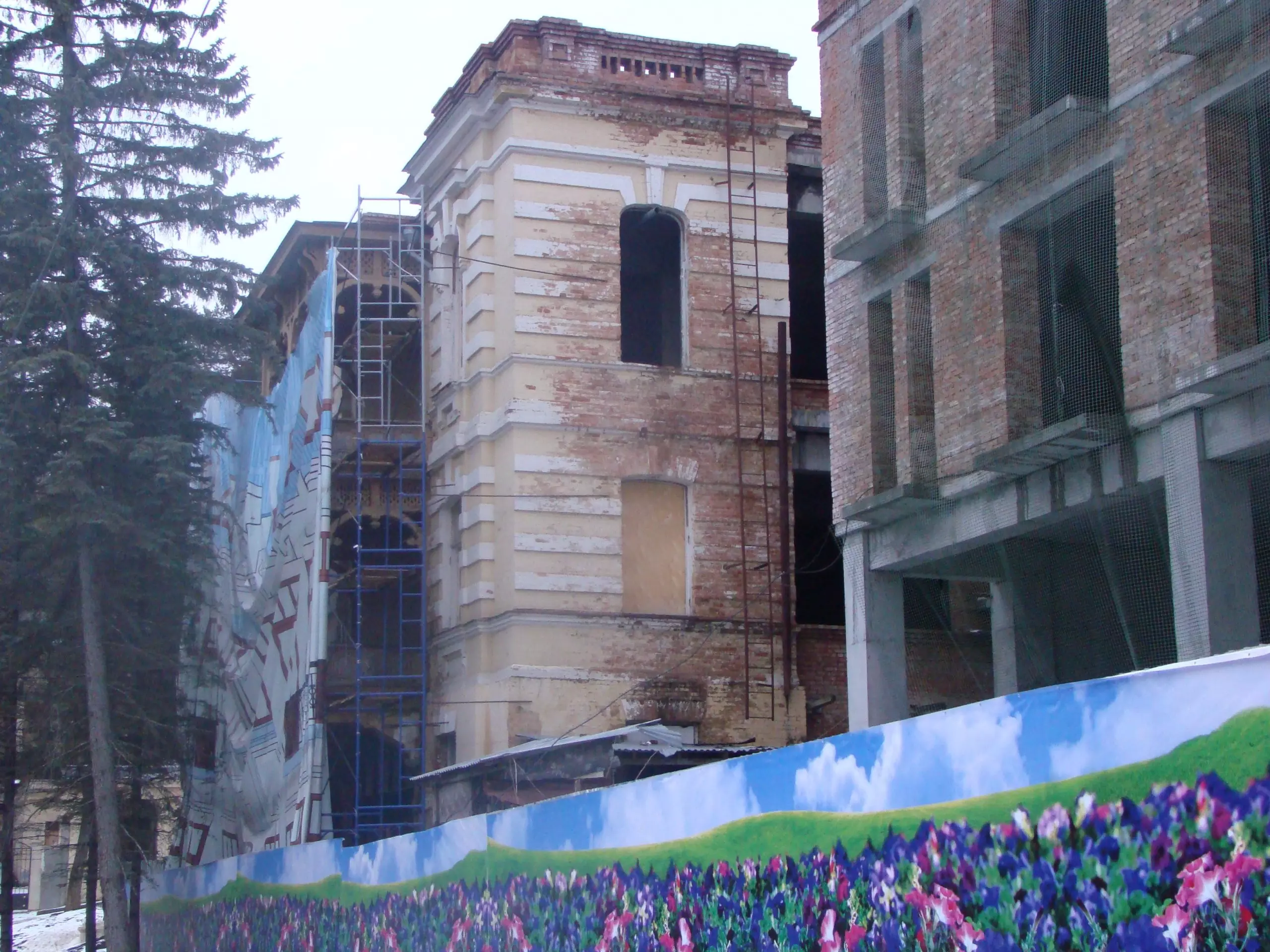 История эта давняя и печальная, как и большинство других историй, связанных с объектами исторического наследия Кисловодска. Когда-то по обе стороны от Каскадной лестницы стояли корпуса санатория «Красный октябрь». Все они располагались в бывших частных особняках, построенных еще задолго до самой «Каскадки», которая, кстати, появилась лишь в 1935 году. Так вот, по правую руку от лестницы, если стоять к ней лицом, на углу по адресу ул. Володарского 1, просп. Дзержинского, 5 находился особняк купца Калинкина, красивое трехэтажное здание 1905 года постройки с ажурными коваными балкончиками. Еще в 1995 году особняк был признан памятником архитектуры, поставлен на госохрану, а позже внесен в государственный реестр объектов культурного наследия РФ под номером 2600000218. Однако все это не помешало санаторию продать его в частные, притом иностранные руки, которые быстренько решили перекроить памятник архитектуры на свой лад. Новым хозяином объекта историко-культурного наследия России стал международный холдинг Africa Israel Investments Ltd, дочернюю компанию которого AFI Development в России представляет ООО «АФИ РУС» под руководством выходца из Израиля Марка Гройсмана. Его же фамилия значится в реестрах и в связи с прописавшейся в Кисловодске фирмой ООО «ЭЙТАН К», которая выступила непосредственным застройщиком. Как рассказывает официальный сайт AFI Development, на месте особняка Калинкина было решено построить новый санаторий на 90 мест. Так называемый «Проект Версаль» подразумевал, что будет проведена реконструкция исторического здания и построены два новых крыла, объединенных в единый комплекс. И все, вроде бы ничего, за одним исключением, уже на эскизе в первоначальном проекте рядом со старинным особняком красуется 9-этажная башня из стекла и бетона. Мало того, в результате так называемой реконструкции от старинного здания остался лишь фасад. Все остальное снесено начисто. Зато вплотную к обезображенному памятнику теперь примыкает бетонный параллелепипед, строительство которого еще в 2008 году остановилось на седьмом этаже.