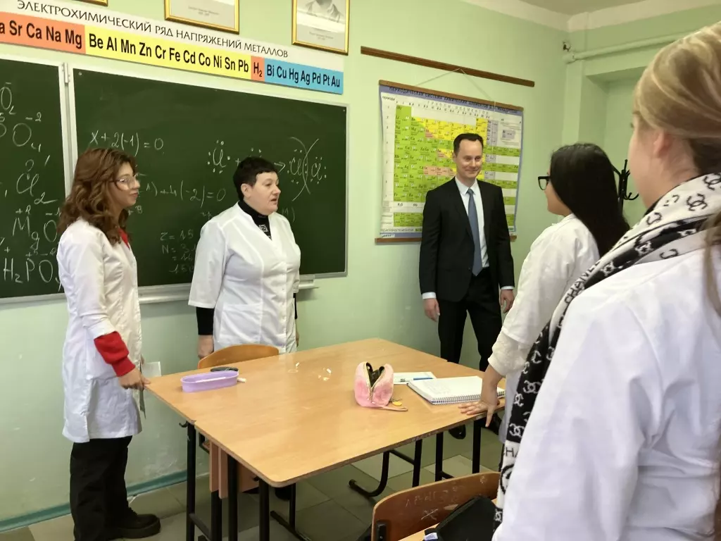 Владимир Шкарин ознакомился с ходом работ по ремонту актового зала главного корпуса ПМФИ, подчеркнув, что создание современной комфортной среды для студентов — одна из главных задач, стоящих перед администрацией вуза. Он оценил уровень оснащения четырех кафедр: биологии и физиологии, неорганической, физической и коллоидной химии, фармакогнозии, ботаники и технологий фитопрепаратов, — а также пообщался с преподавателями и студентами.