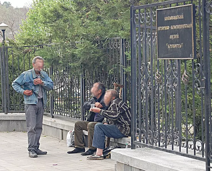 Снимок сделан 6 мая, одновременно с двумя массовыми акциями, проходившими в непосредственной близости от троицы, уютно пристроившейся на ограждении «Крепости». Через дорогу, у мемориала «Журавли» юные патриоты в это же время проводили мероприятие, посвященное 72-летию Великой Победы. А за спинами друзей развернулась молодежная выставка «Арт-май», ежегодно собирающая множество участников из различных регионов. Как ни странно, поблизости мы не заметили ни одного блюстителя порядка. Впрочем, по словам сотрудников музея, их неоднократные попытки обращаться в полицию оказались бесполезными. Вот так красноречиво сидят товарищи на облюбованном общественном месте, бросая вызов правилам, санкциям и законам. Чем не достопримечательность в центре курортного города в преддверии Дня Победы?