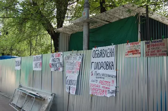 А незабываемую картину в центре знаменитого курорта дополняют красующиеся на заборе плакаты с разномастными надписями от руки: «Администрация не заботится о соблюдении прав человека!», «С ярмарки Кисловодска уйдем последние!», «Нас лишают рабочих мест, загоняют в рабство к частнику!», «Мы платим налоги!», «Наш облик – работа администрации!». А дальше, сбившись в кучку, сидят измученные, растерянные, озлобленные и отчаявшиеся продавцы сувенирной продукции, окруженные плакатами с одним-единственным словом: «Голодовка».