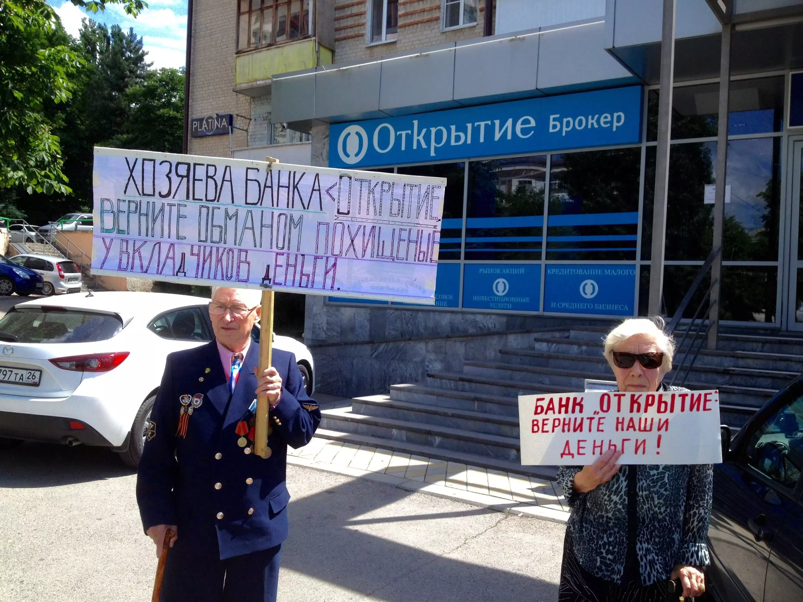 Кисловодские вкладчики, которые уже 10 месяцев пытаются получить свои вклады в банке «Открытие», провели на День России пикет у офиса этого банка в Пятигорске.Офис в Кисловодске перестал работать еще в ноябре 2014 года. Представленные договора и приходные ордера, находящиеся у клиентов этого банка, руководство посчитало несуществующими. К сожалению, эту версию поддержал и Городской суд Кисловодска, в лице федерального судьи Домоцева.