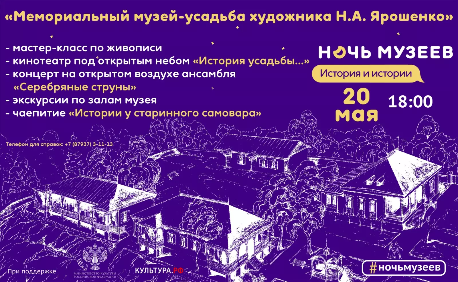 С 18.00 часов экскурсии по «Белой вилле». Рассказ об истории дома, хранящего память об именитых гостях художника — передвижника Н. А. Ярошенко: Д.И. Менделеева, И.Е. Репина, А.И. Куинджи, М.В. Нестерова, Н.Н. Дубовского, А.М. Васнецова, многих других видных деятелей.
