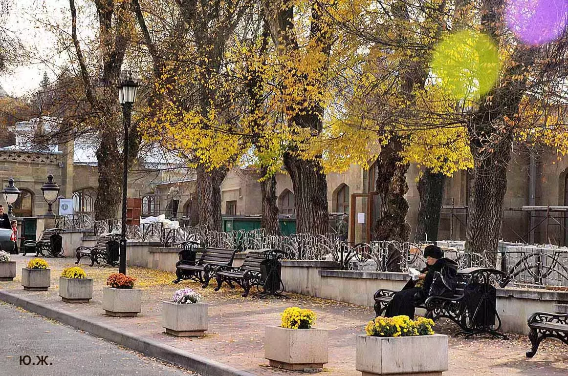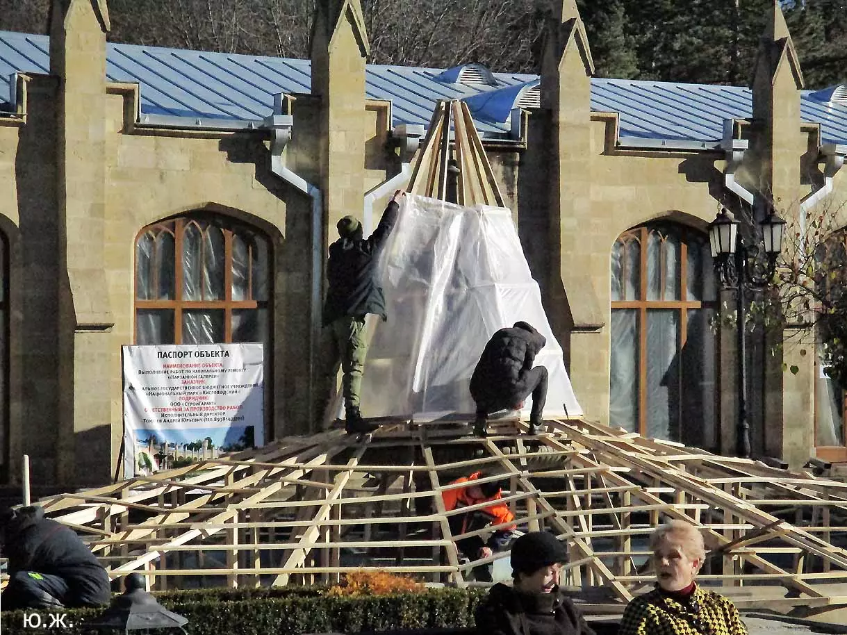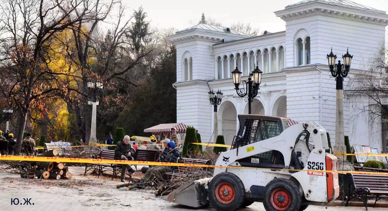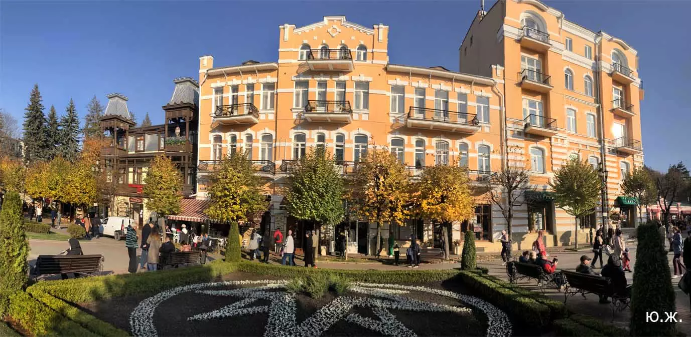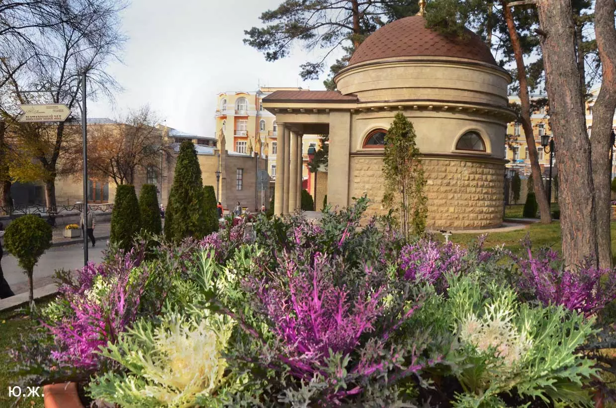 А на место снесенных деревьев сразу же высадили 15-летние липы. Там же у Колоннады провели осеннее кронирование взрослых деревьев. Оживленно сейчас у круглого нарзанного бювета, что у здания Курортного совета.(на фото) У Цветомузыкального фонтана -первый новогодний мотив, над его круглой чашей, оборудуется место для новогодней ели. Нашему бронзовому «нищему» стали щедро подавать…