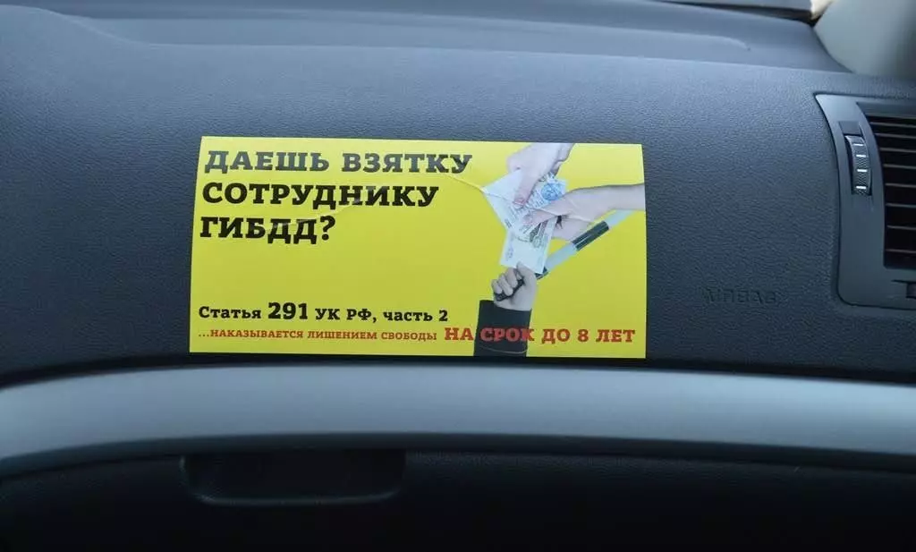 Ярко-желтый антикоррупционный стикер, в разработке которого участвовали опытные психологи и дизайнеры, сразу бросается в глаза водителю, садящемуся в салон автомобиля для составления административного материала. А надпись заставляет задуматься: стоит ли рисковать, пытаясь дать взятку сотрудникам ГИБДД при исполнении ими служебных обязанностей. В ближайшее время похожие плакаты появятся в административных зданиях ГИБДД.