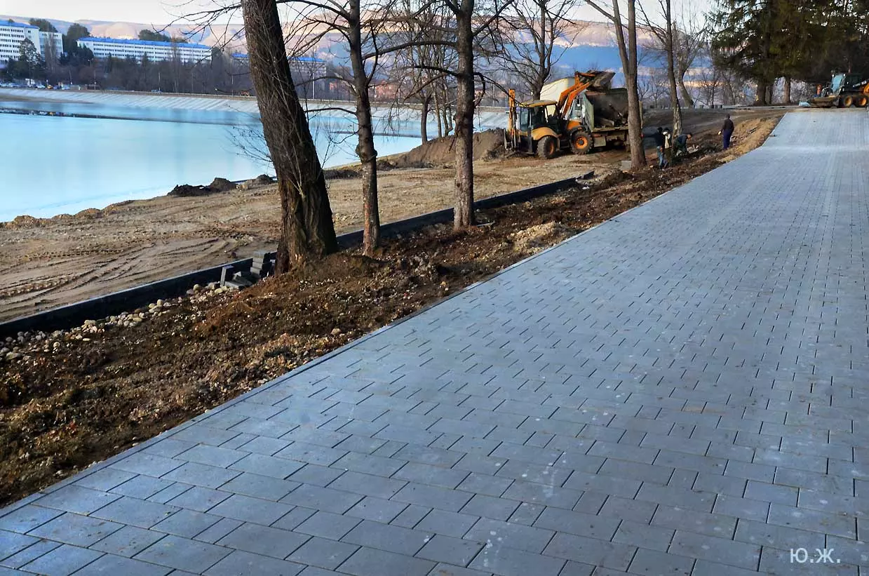 Теперь о новом Старом кисловодском озере. Не хотелось бы обсуждать сегодняшнюю стройку, подожду лета — как все заработает. У строителей еще много времени до купального сезона,чтобы все закончить. Например, на снимках видно, как ребята со стоящим рядом с ними большим прибором долбят толстенные бетонные плиты на дамбе (вернее швы между ними). Вот об этом резерве времени и идет речь: устранить, что еще обнаружиться, преобразить до неузнаваемости, в хорошем смысле слова, территорию. Я же могу только сказать, что озеро прекрасно смотрится со многих окружающих его гор, оно хорошо во все времена года — и летом, и при таком снеге, который недавно нас порадовал. С удовольствием приглашаю вас посмотреть малую часть снимков этих двух последних лет.