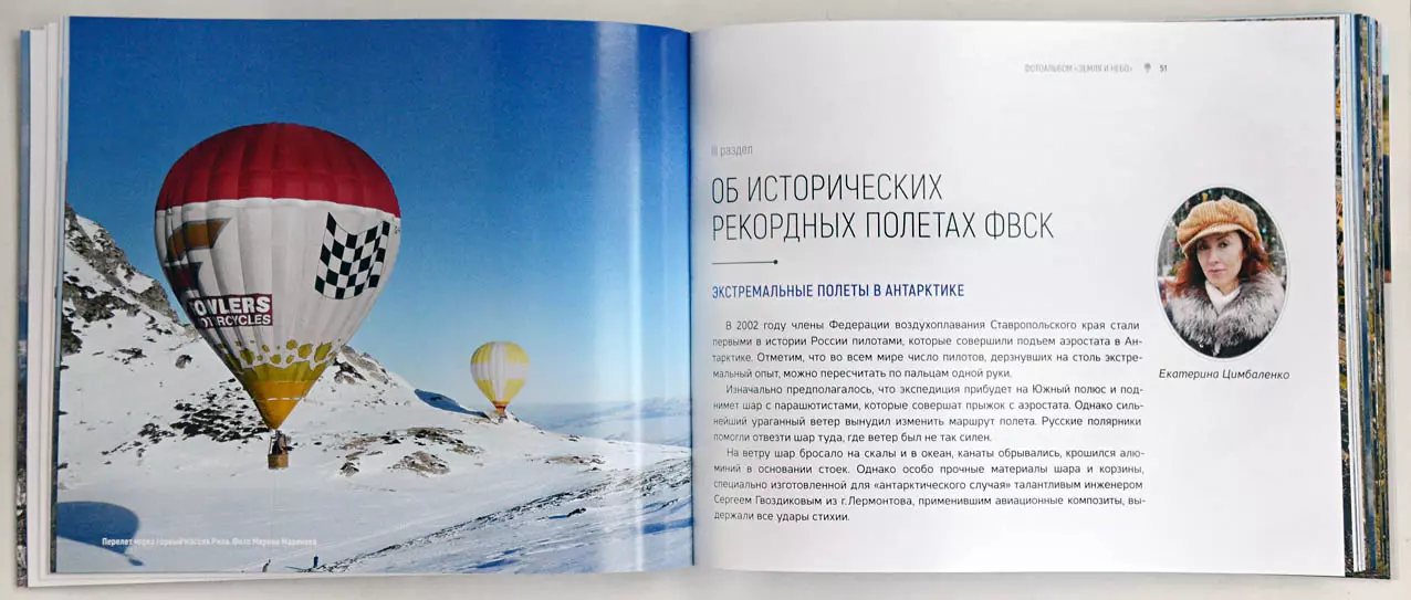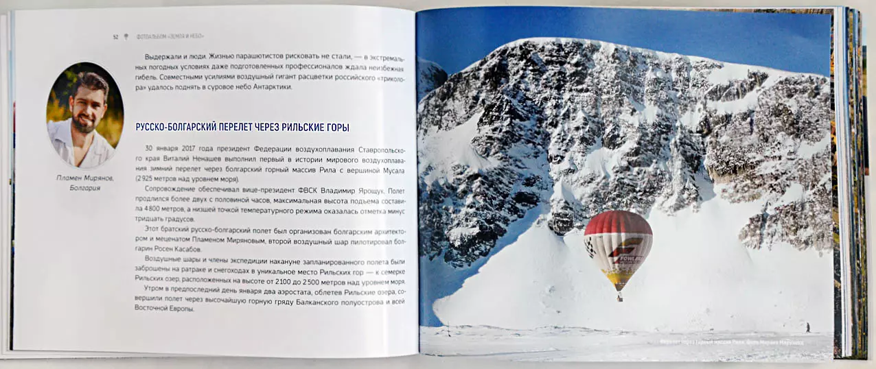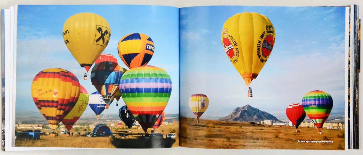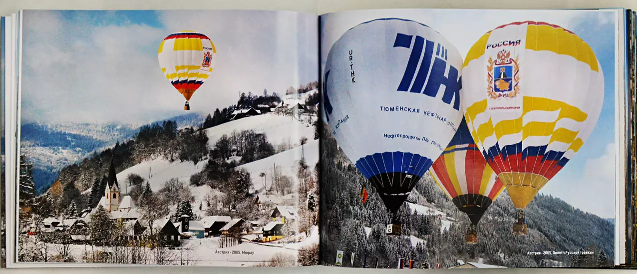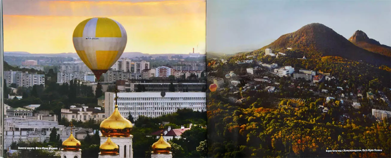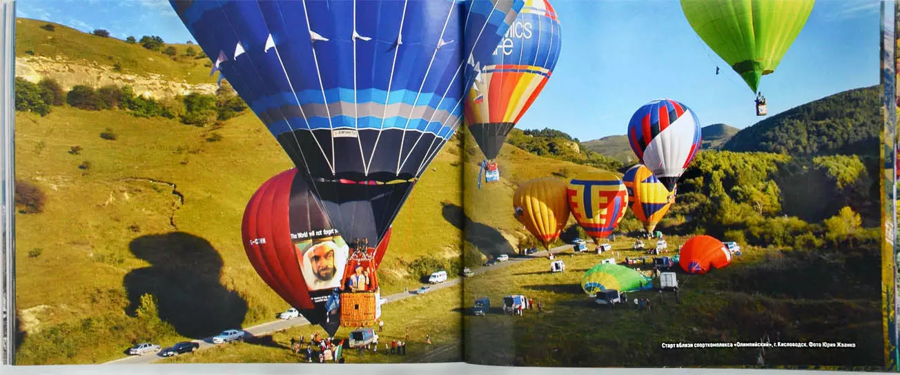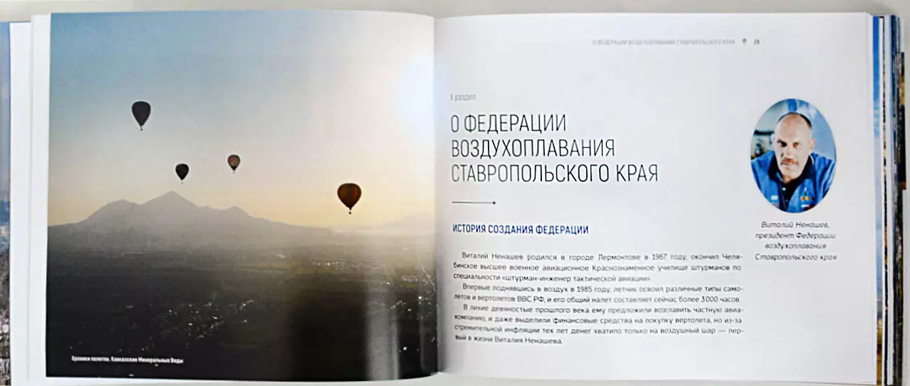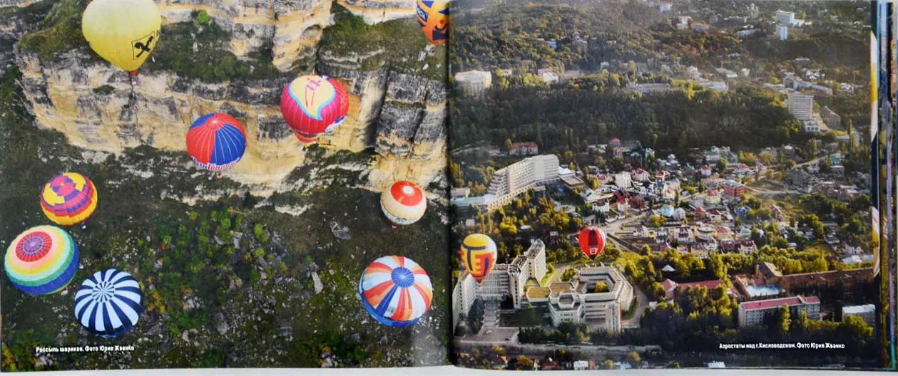 Вторая часть фотоальбома посвящена Федерации воздухоплавания Ставропольского края, ее впечатляющим достижениям, победам и рекордам. Руководит Федерацией с самого ее основания в 1997 году Виталий Ненашев. Назовем здесь далеко не все: это, во первых , проходящие ежегодно со дня основания Федерации, фестивали воздухоплавания «Кавказские Минеральные Воды – Жемчужина России», это полеты во Франции, на Украине, воздушная экспедиция по Большому шелковому пути, полеты по горной Австрии, в Армении, подъем шара в Антарктиде, перелеты через Альпы, через Рильские горы в Болгарии, через Керченский пролив, через высочайшую гору Европы Эльбрус, через пролив Босфор Восточный в Японском море, полеты в Калининграде, Омске, Смоленске, Грозном… Здесь, во второй части издания представлены фотоработы, авторы которых специализируются на аэрофотосъемке, имеют за спиной не один полет. Это и российские и зарубежные фотографы, которые в момент совершения съемки этих кадров находились или в корзине аэростата, или на выбранных ими точках, откуда можно провести по настоящему творческую фотосессию… Когда сравниваешь монгольфъеры 250-летней давности, с современными аэростатами, видишь, что они отличаются друг от друга (имеется в виду внешний вид, силуэт) не так разительно как, скажем автомобили начала ХХ века от нынешних. Здесь гораздо больше здорового консерватизма, вызывающего восторг. И даже огромный шар «Россия», всего несколько дней назад поднявшийся на 10,3 км и установивший новый рекорд России по высоте подъема теплового аэростата, на мой дилетантский взгляд, своим силуэтом подтверждает это. Очень жаль, что его рекордный полет не вошел в это издание. И, кстати, многие кисловодчане и гости города смогли увидеть его во всей красе в прошлом году на Первомайской поляне Нацпарка в день России. Этот репортаж можно увидеть на сайте «НАШ КИСЛОВОДСК» в рубрике «Выставки».