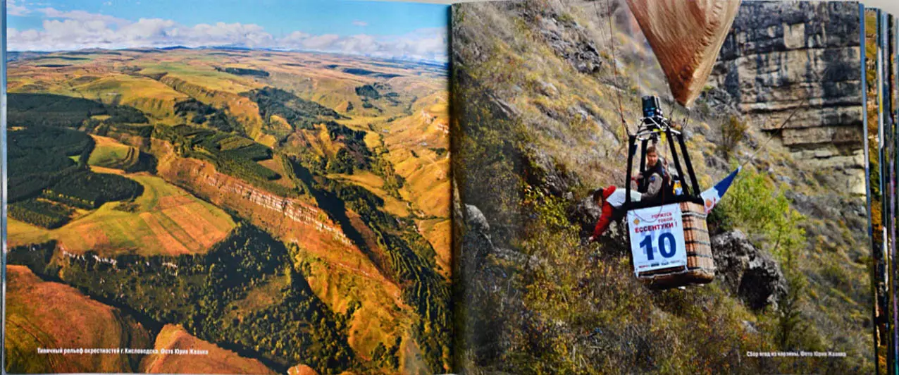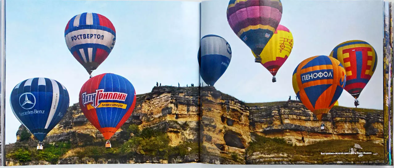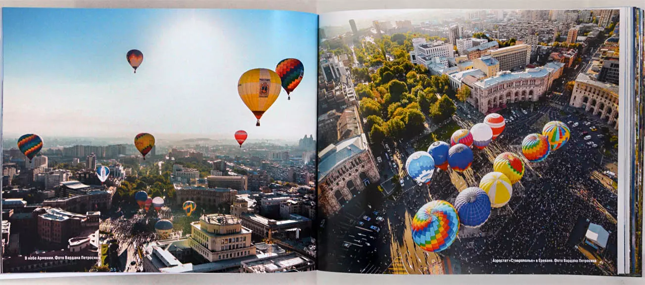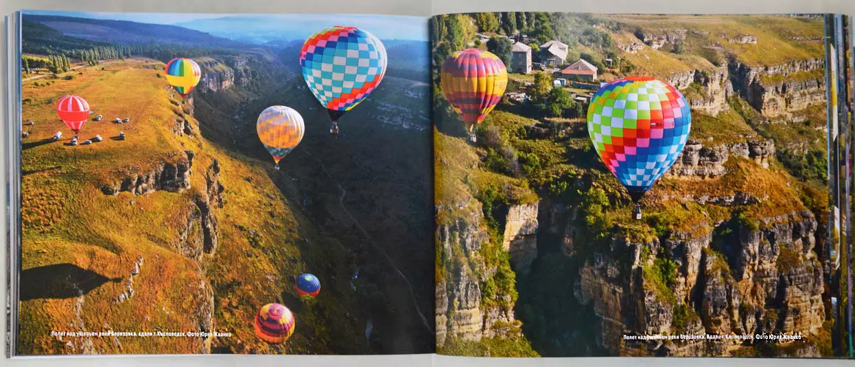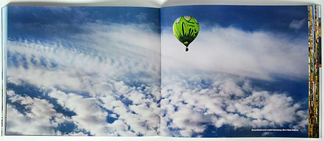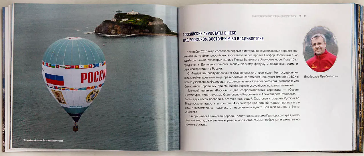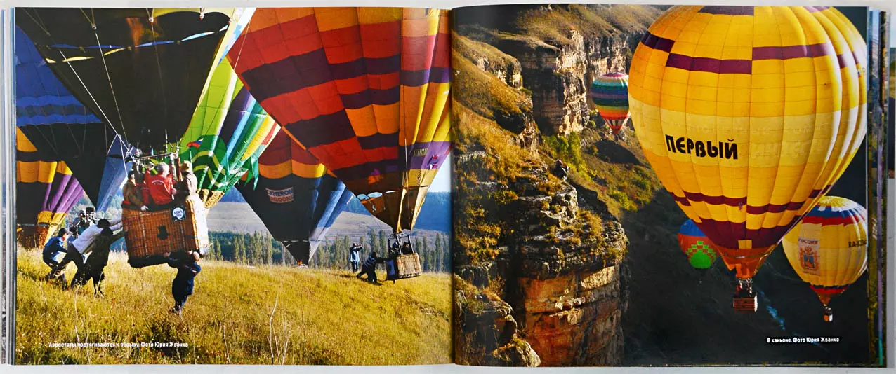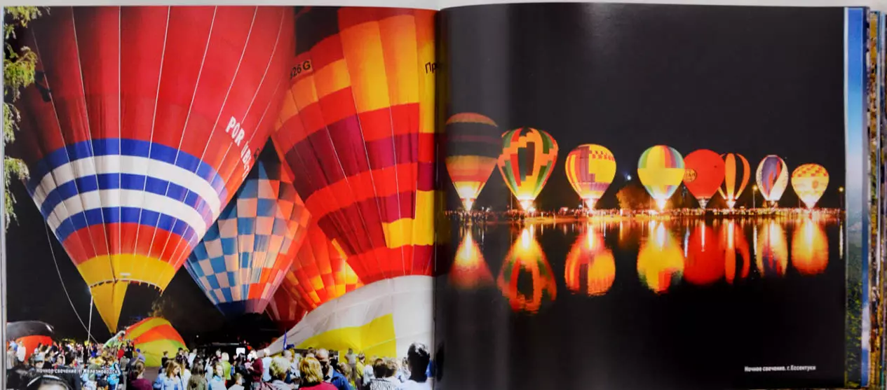 Вторая часть фотоальбома посвящена Федерации воздухоплавания Ставропольского края, ее впечатляющим достижениям, победам и рекордам. Руководит Федерацией с самого ее основания в 1997 году Виталий Ненашев. Назовем здесь далеко не все: это, во первых , проходящие ежегодно со дня основания Федерации, фестивали воздухоплавания «Кавказские Минеральные Воды – Жемчужина России», это полеты во Франции, на Украине, воздушная экспедиция по Большому шелковому пути, полеты по горной Австрии, в Армении, подъем шара в Антарктиде, перелеты через Альпы, через Рильские горы в Болгарии, через Керченский пролив, через высочайшую гору Европы Эльбрус, через пролив Босфор Восточный в Японском море, полеты в Калининграде, Омске, Смоленске, Грозном… Здесь, во второй части издания представлены фотоработы, авторы которых специализируются на аэрофотосъемке, имеют за спиной не один полет. Это и российские и зарубежные фотографы, которые в момент совершения съемки этих кадров находились или в корзине аэростата, или на выбранных ими точках, откуда можно провести по настоящему творческую фотосессию… Когда сравниваешь монгольфъеры 250-летней давности, с современными аэростатами, видишь, что они отличаются друг от друга (имеется в виду внешний вид, силуэт) не так разительно как, скажем автомобили начала ХХ века от нынешних. Здесь гораздо больше здорового консерватизма, вызывающего восторг. И даже огромный шар «Россия», всего несколько дней назад поднявшийся на 10,3 км и установивший новый рекорд России по высоте подъема теплового аэростата, на мой дилетантский взгляд, своим силуэтом подтверждает это. Очень жаль, что его рекордный полет не вошел в это издание. И, кстати, многие кисловодчане и гости города смогли увидеть его во всей красе в прошлом году на Первомайской поляне Нацпарка в день России. Этот репортаж можно увидеть на сайте «НАШ КИСЛОВОДСК» в рубрике «Выставки».