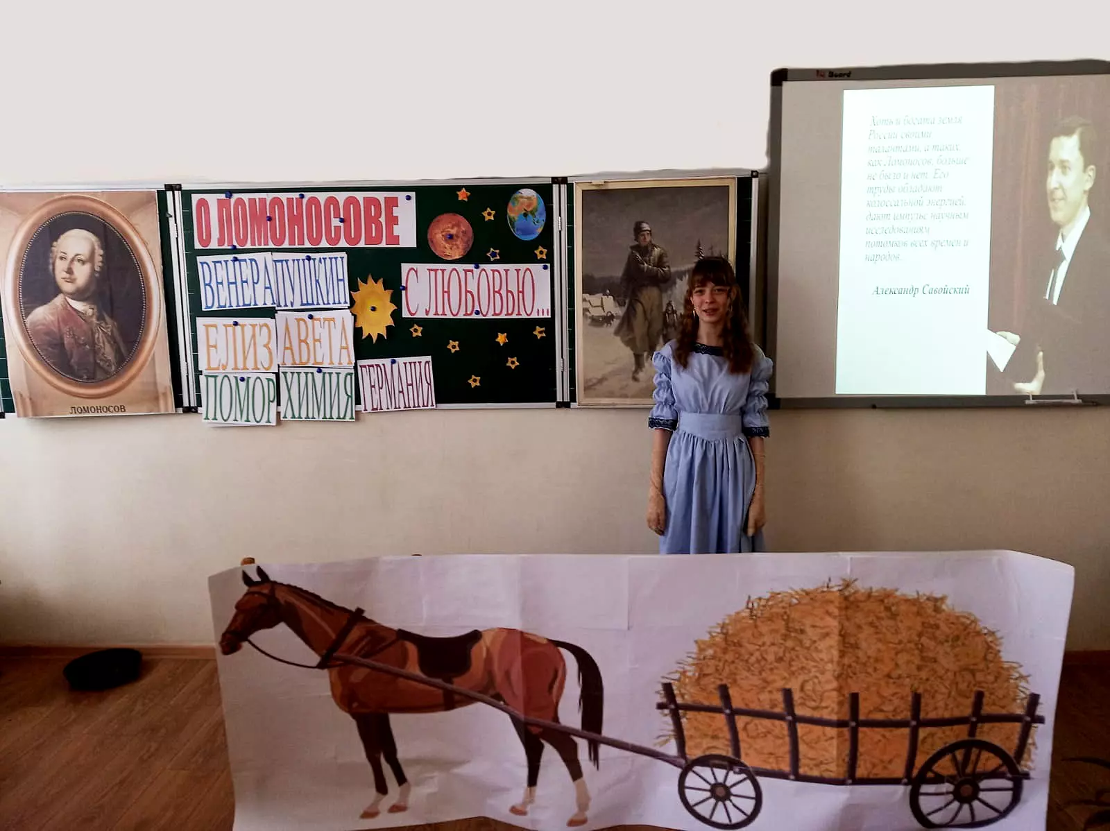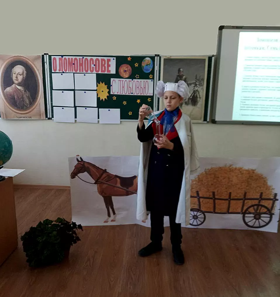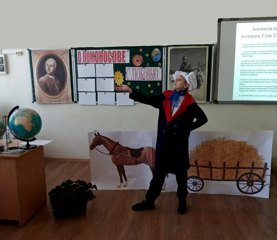 Интегрированный урок с элементами театрализации, проведенный учителем русского языка и литературы Таймударовой Ш.Ю., запомнился яркими костюмами, наглядными пособиями, эпизодами из кинофильма «Михайло Ломоносов», интересной подачей материала и прекрасной игрой юных дарований. Ребята примерили на себя роли выдающихся исторических личностей: Михаила Ломоносова, Елизаветы Петровны Романовой, Коперника и Птолемея.