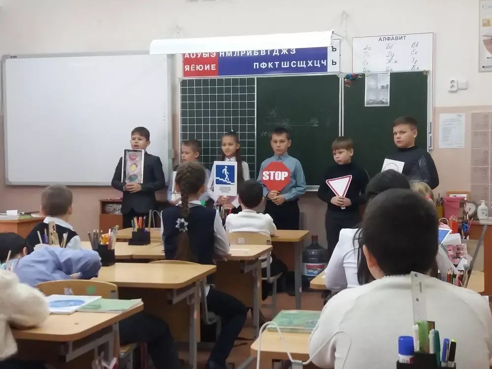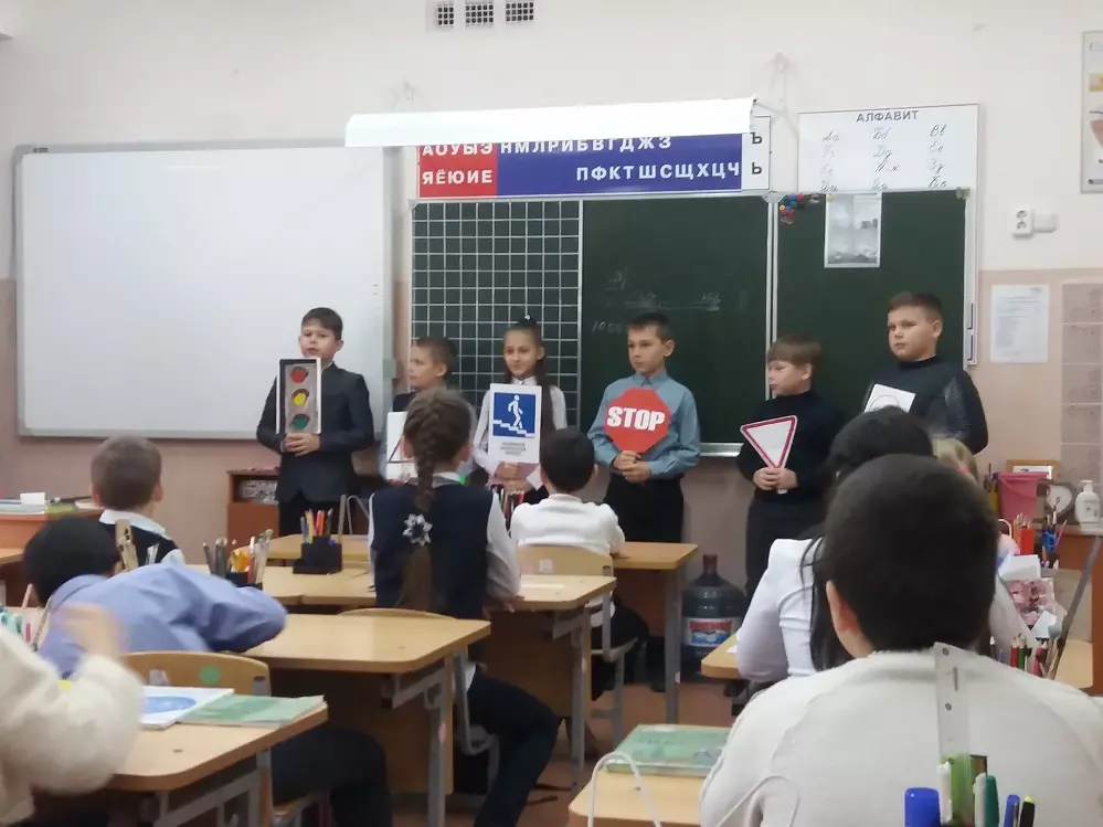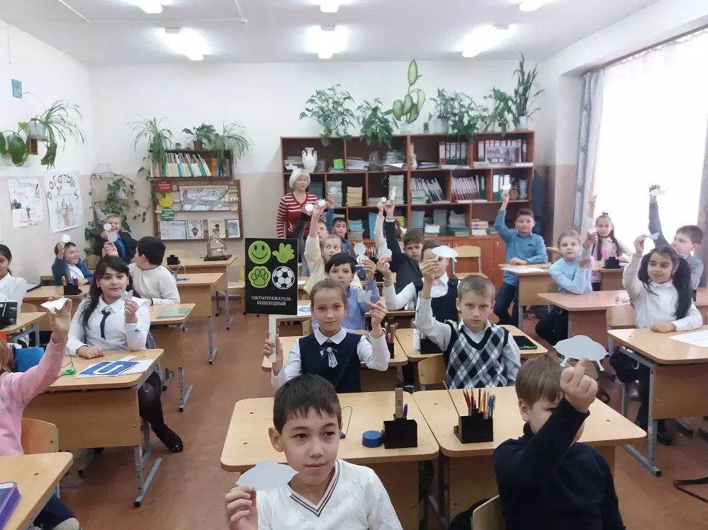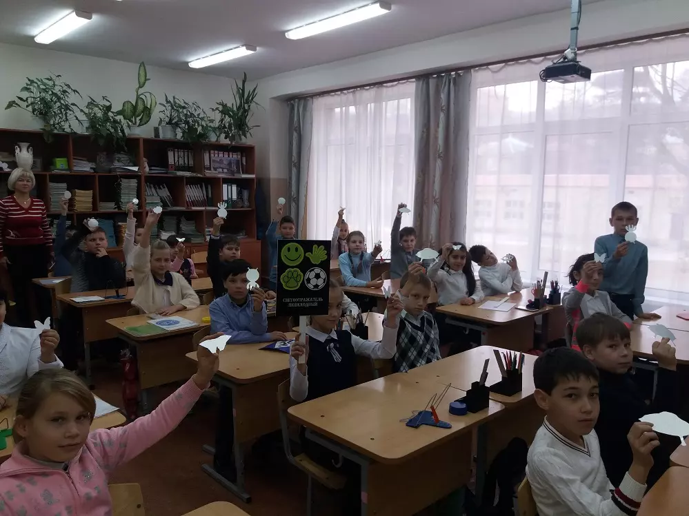Во все школы была выдана партия светоотражающей бумаги из которой дети вырезали различные фигурки для того что бы в последствии эти изделия приклеить на рюкзаки, либо на верхнюю одежду учеников.