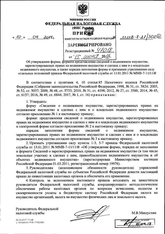 Порядок утвержден приказом ФНС России от 10.04.2017 № ММВ-7-21/302@ «Об утверждении формы, формата представления сведений о недвижимом имуществе, зарегистрированных правах на недвижимое имущество и сделках с ним и о владельцах недвижимого имущества, а также порядка заполнения формы и признании утратившими силу отдельных положений приказа Федеральной налоговой службы от 13.01.2011 № ММВ-7-11/11@».