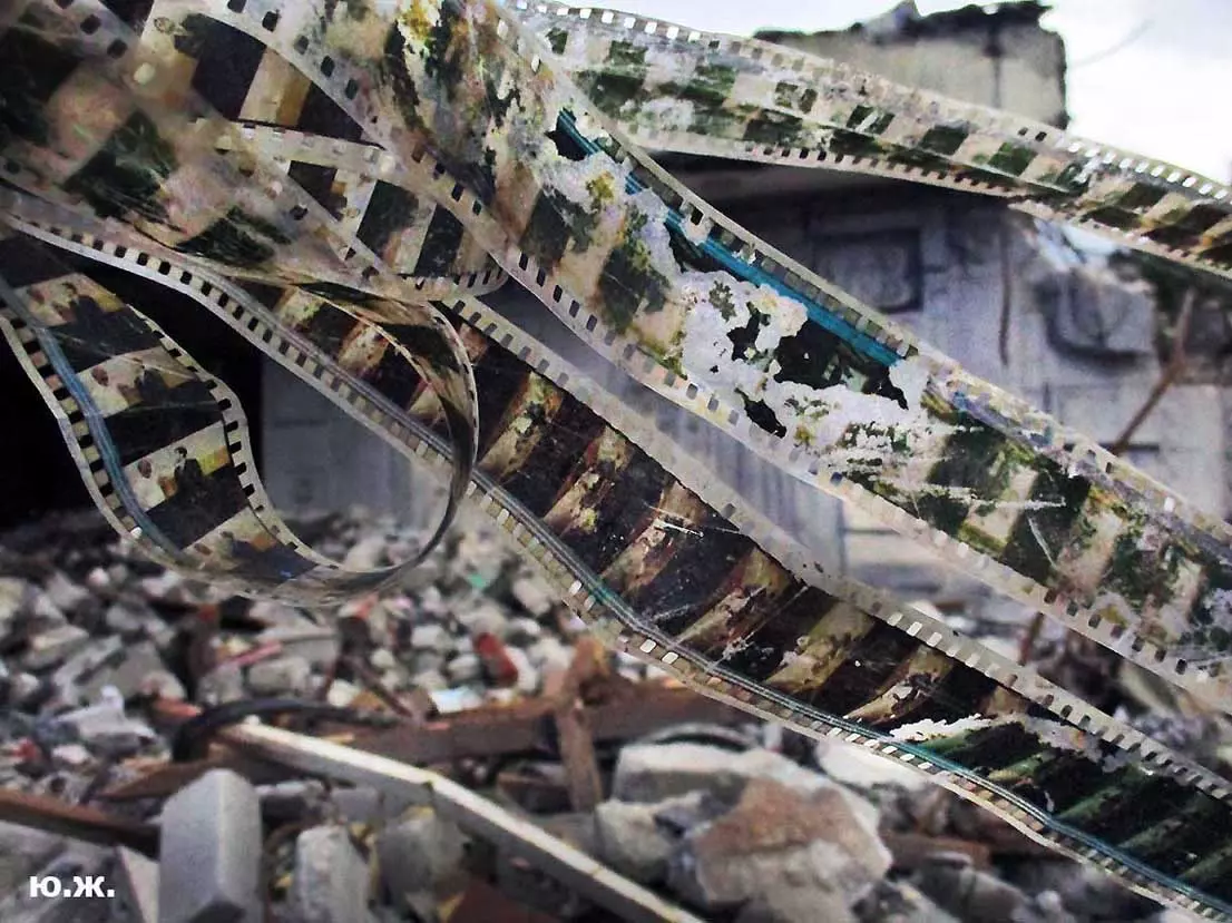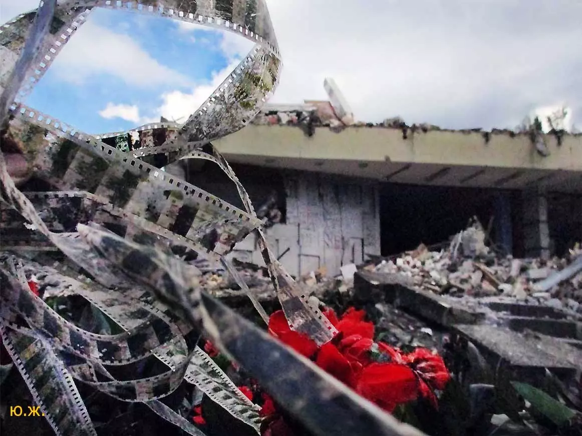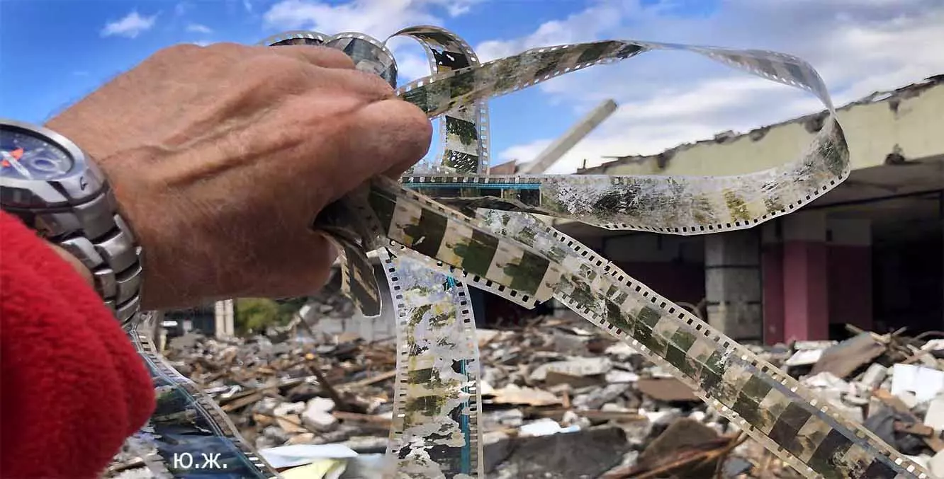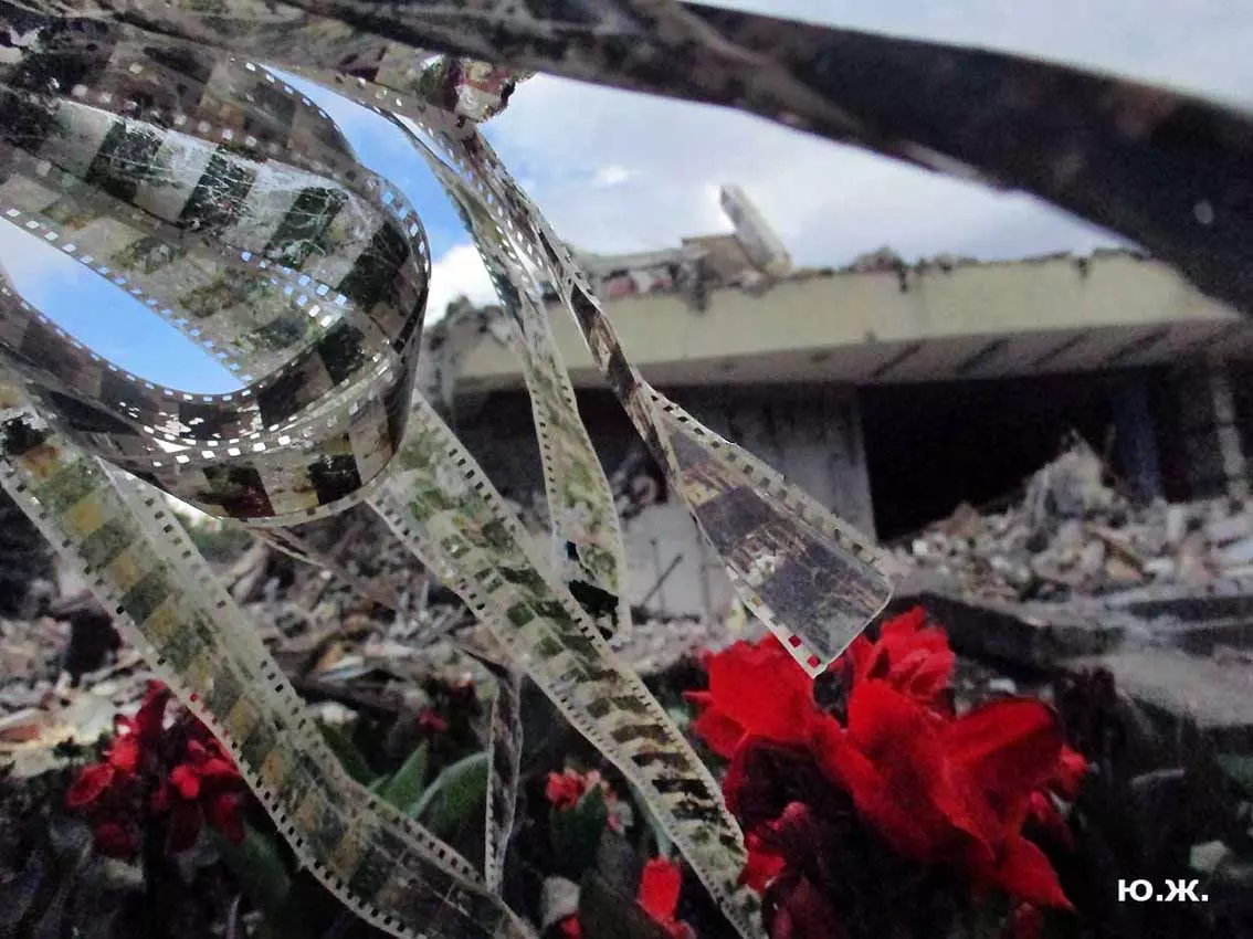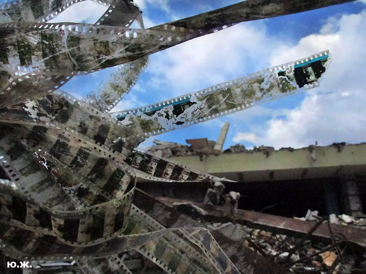 Я начал съемку с самого начала работ по сносу «России» в августе. А в первый день августа прошел рядом с кинотеатром, чтобы запечатлеть на фоне его охристых колец охристых же красавцев-верблюдов Гии Эрадзе при их возвращении в Цирк с громкого променада по Курортному Бульвару. Корабли пустыни словно слились с кольцами здания по масти. Через пару фотосессий, которые мне очень нравились (особенно когда нашел здесь, среди камней, бетонных плит, щебня, целые метры старой, скрученной, поцарапанной широкоформатной пленки — пленки, позволявшей когда то давать на широком экране хорошее изображение, а рядом — остатки разбитых и целых каменных театральных масок, барельефов, голов, украшавших внешние панно кинотеатра), меня стали посещать мысли, вынесенные в заголовок этого многомесячного репортажа… (см. фото).