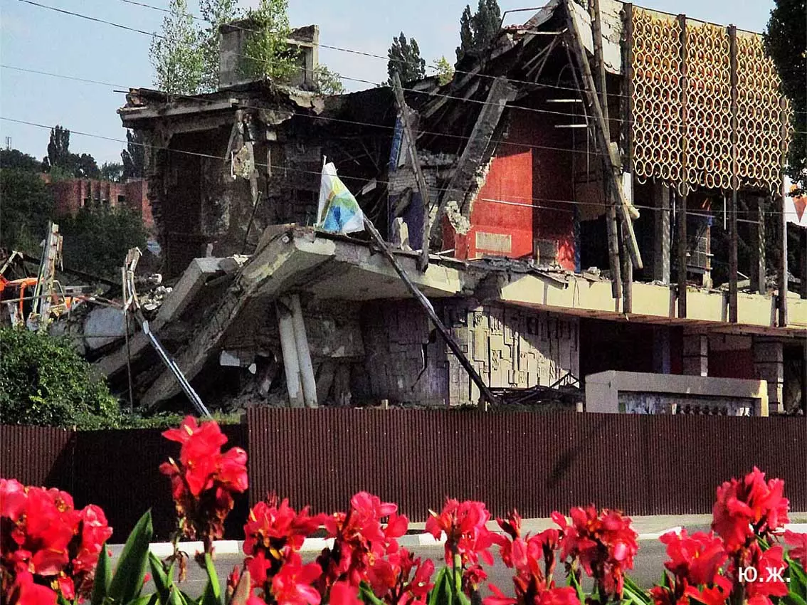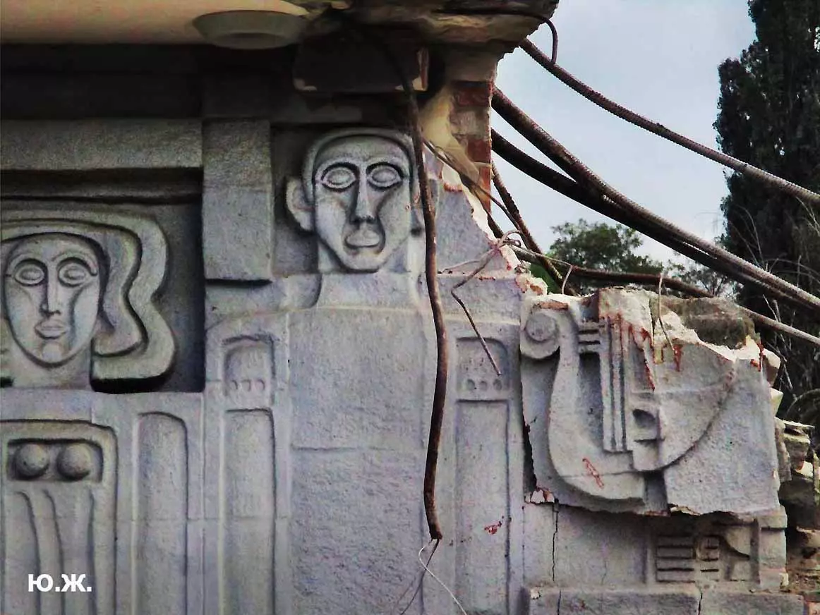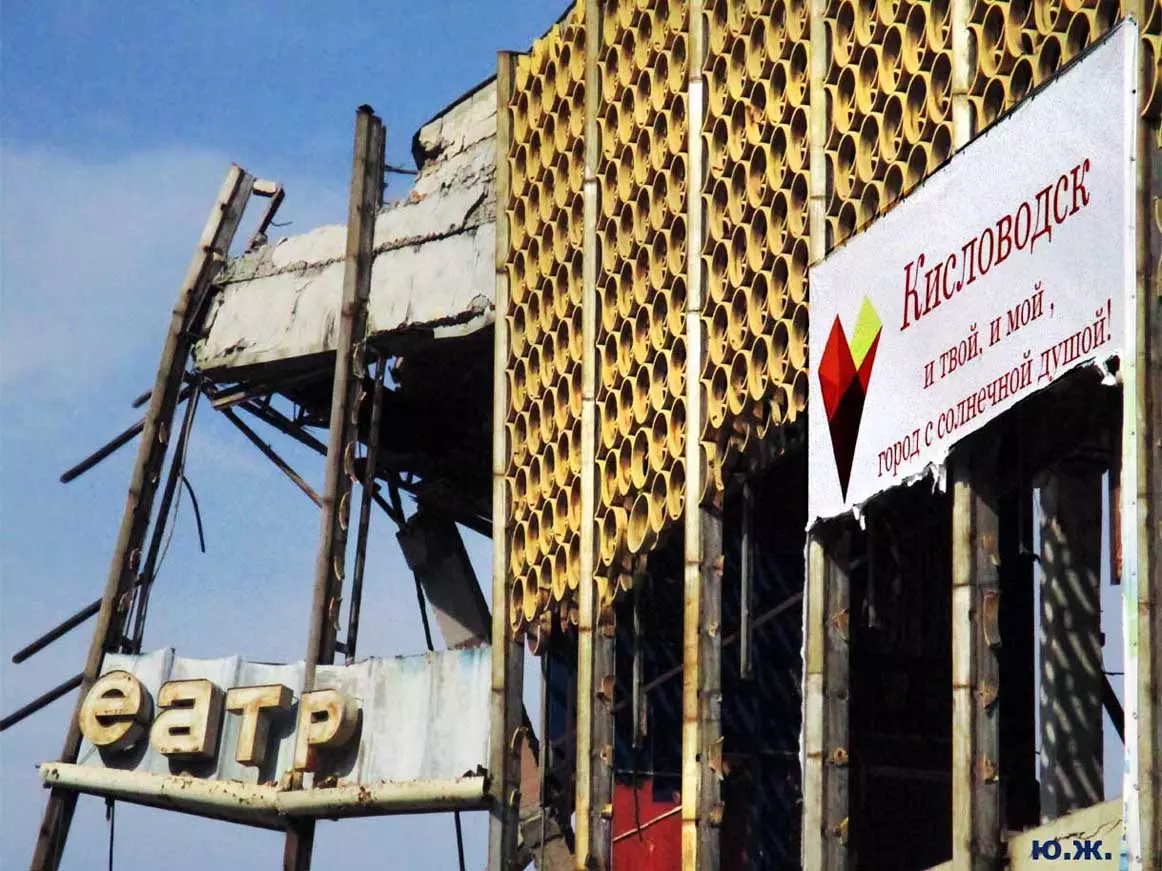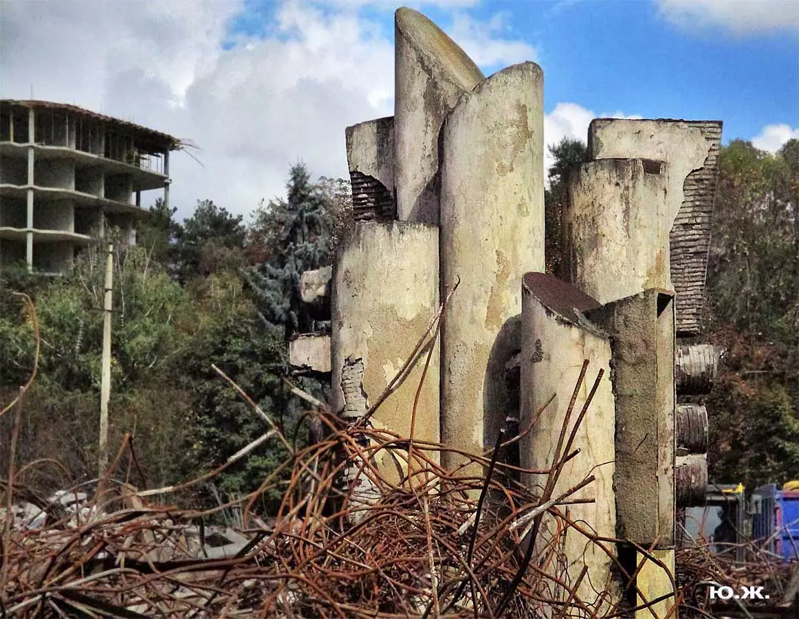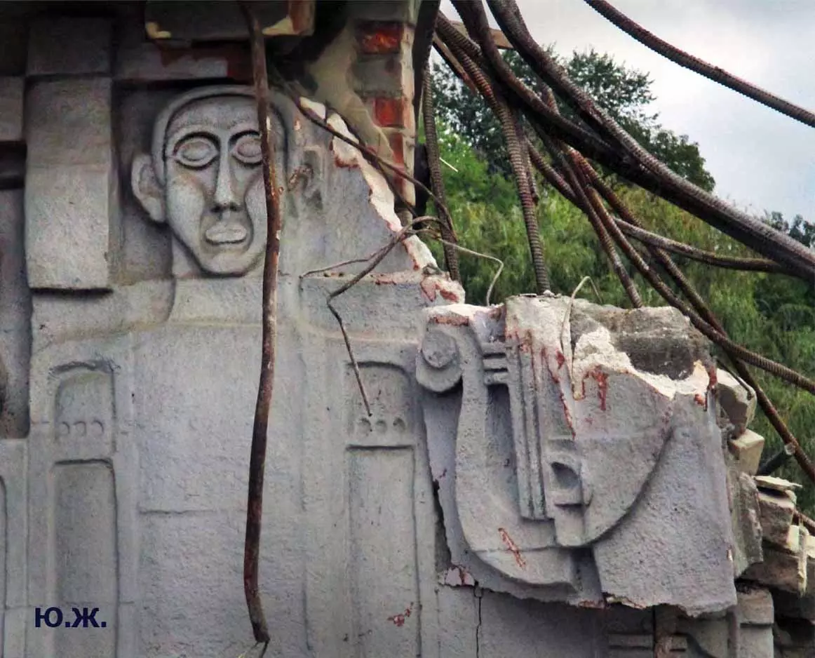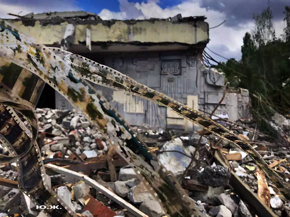 Я начал съемку с самого начала работ по сносу «России» в августе. А в первый день августа прошел рядом с кинотеатром, чтобы запечатлеть на фоне его охристых колец охристых же красавцев-верблюдов Гии Эрадзе при их возвращении в Цирк с громкого променада по Курортному Бульвару. Корабли пустыни словно слились с кольцами здания по масти. Через пару фотосессий, которые мне очень нравились (особенно когда нашел здесь, среди камней, бетонных плит, щебня, целые метры старой, скрученной, поцарапанной широкоформатной пленки — пленки, позволявшей когда то давать на широком экране хорошее изображение, а рядом — остатки разбитых и целых каменных театральных масок, барельефов, голов, украшавших внешние панно кинотеатра), меня стали посещать мысли, вынесенные в заголовок этого многомесячного репортажа… (см. фото).
