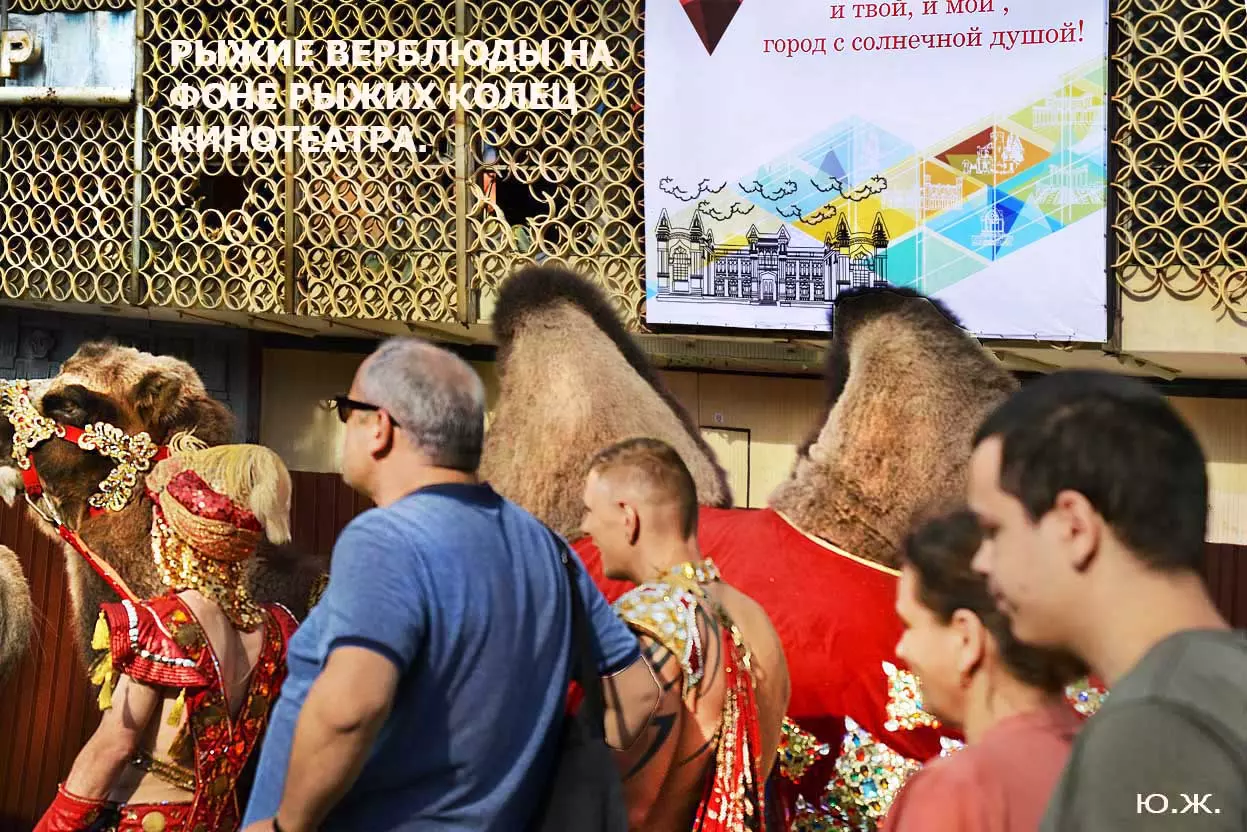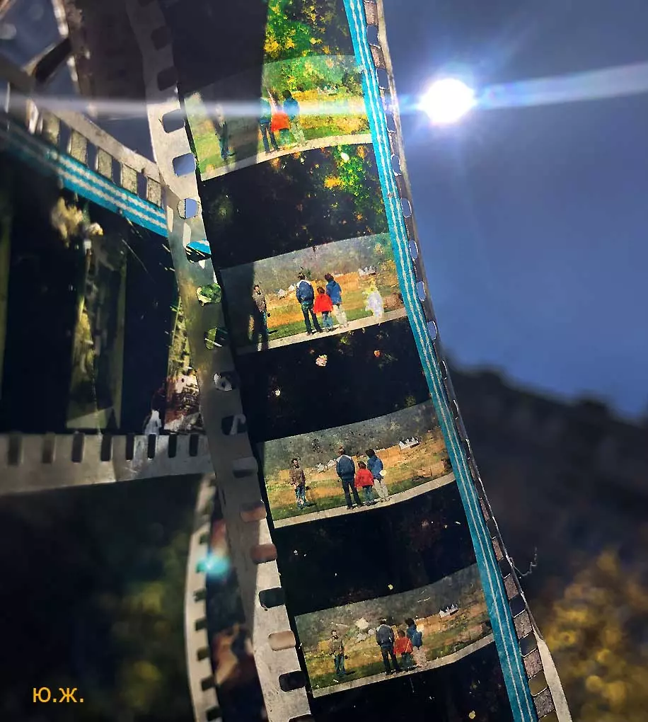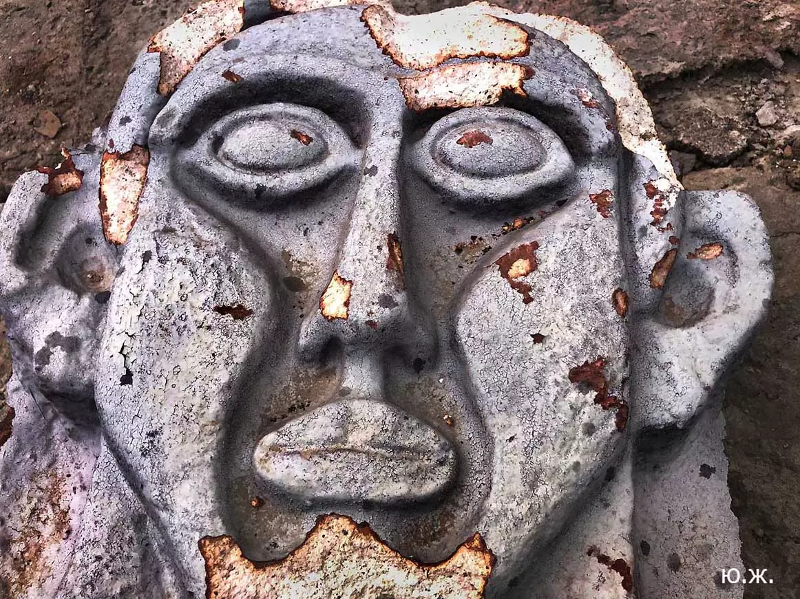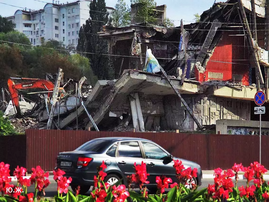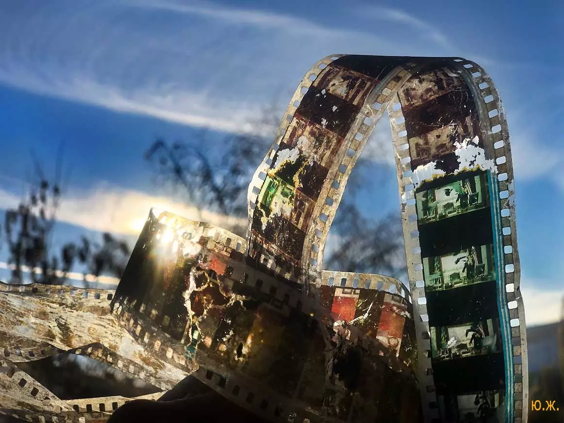 Я начал съемку с самого начала работ по сносу «России» в августе. А в первый день августа прошел рядом с кинотеатром, чтобы запечатлеть на фоне его охристых колец охристых же красавцев-верблюдов Гии Эрадзе при их возвращении в Цирк с громкого променада по Курортному Бульвару. Корабли пустыни словно слились с кольцами здания по масти. Через пару фотосессий, которые мне очень нравились (особенно когда нашел здесь, среди камней, бетонных плит, щебня, целые метры старой, скрученной, поцарапанной широкоформатной пленки — пленки, позволявшей когда то давать на широком экране хорошее изображение, а рядом — остатки разбитых и целых каменных театральных масок, барельефов, голов, украшавших внешние панно кинотеатра), меня стали посещать мысли, вынесенные в заголовок этого многомесячного репортажа… (см. фото).