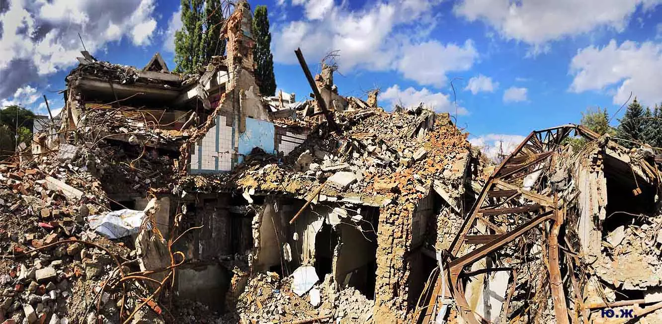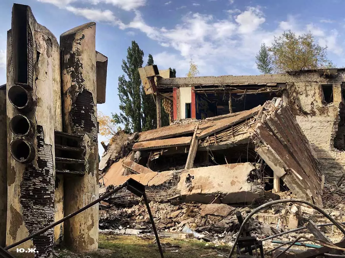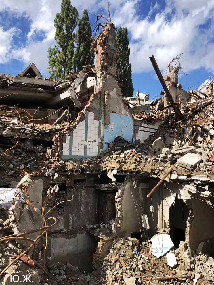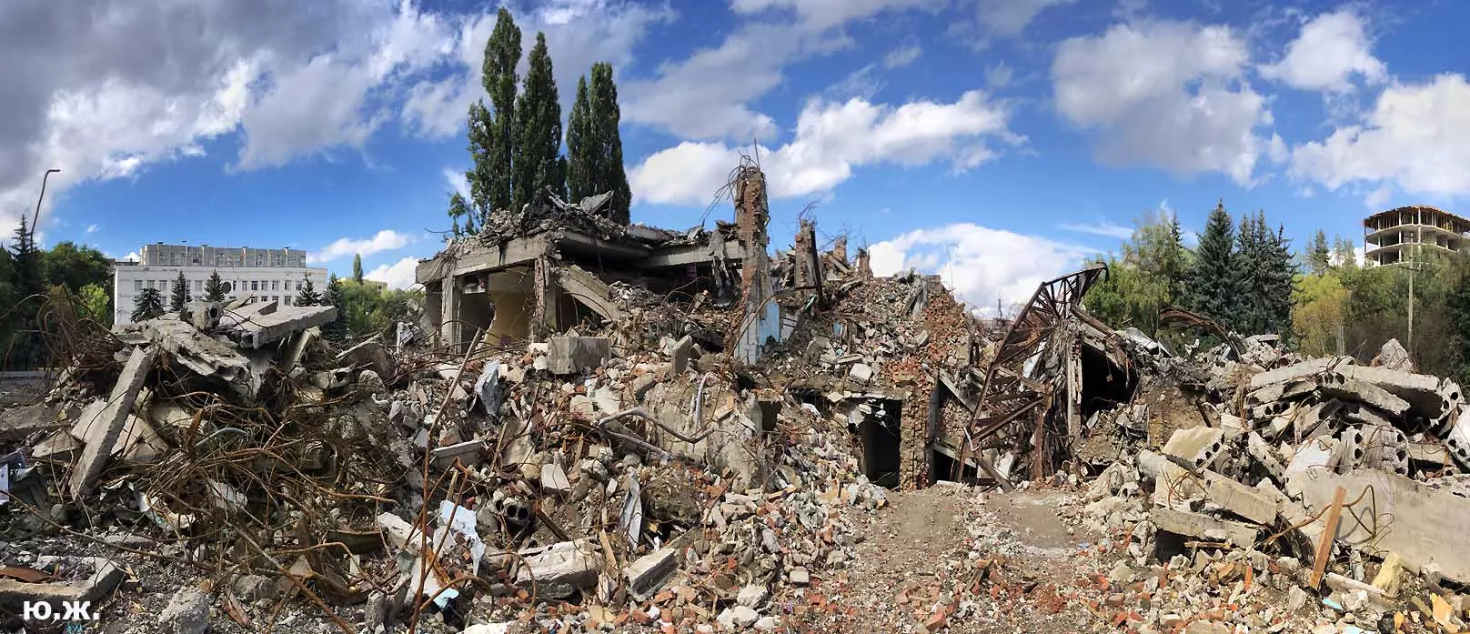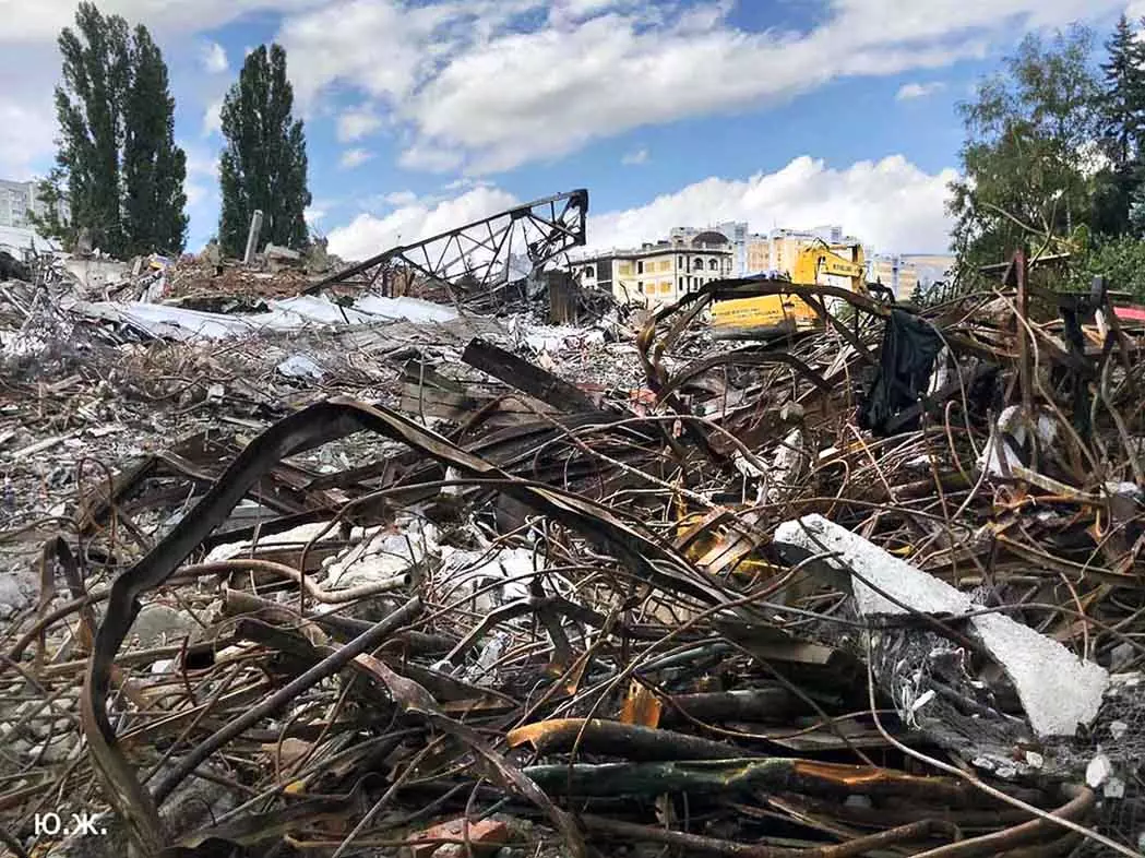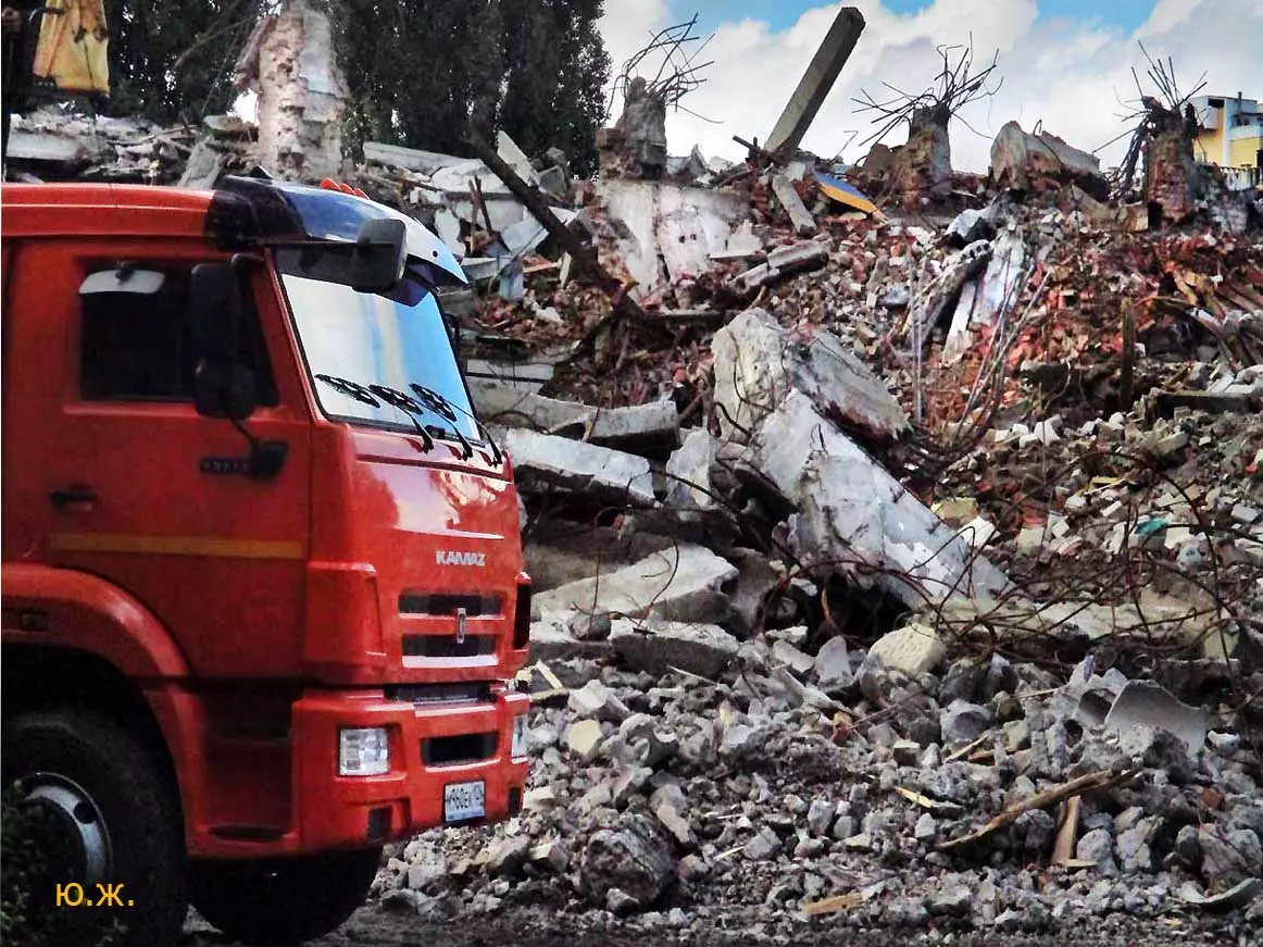 Я начал съемку с самого начала работ по сносу «России» в августе. А в первый день августа прошел рядом с кинотеатром, чтобы запечатлеть на фоне его охристых колец охристых же красавцев-верблюдов Гии Эрадзе при их возвращении в Цирк с громкого променада по Курортному Бульвару. Корабли пустыни словно слились с кольцами здания по масти. Через пару фотосессий, которые мне очень нравились (особенно когда нашел здесь, среди камней, бетонных плит, щебня, целые метры старой, скрученной, поцарапанной широкоформатной пленки — пленки, позволявшей когда то давать на широком экране хорошее изображение, а рядом — остатки разбитых и целых каменных театральных масок, барельефов, голов, украшавших внешние панно кинотеатра), меня стали посещать мысли, вынесенные в заголовок этого многомесячного репортажа… (см. фото).