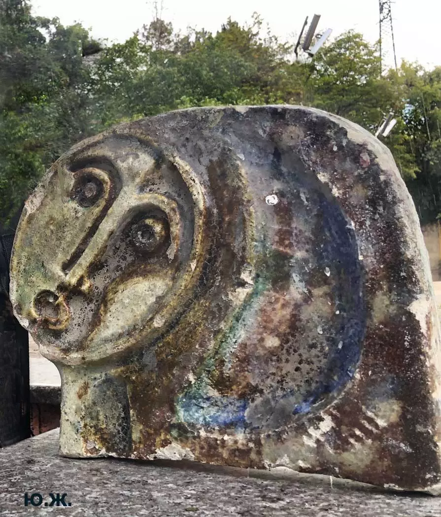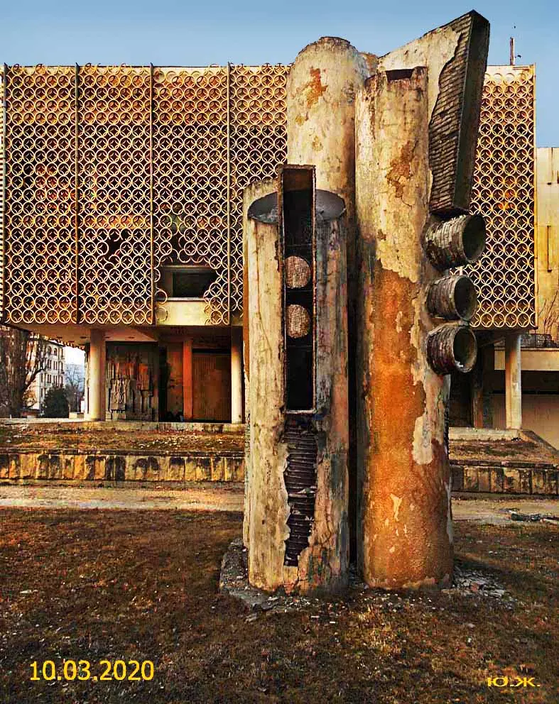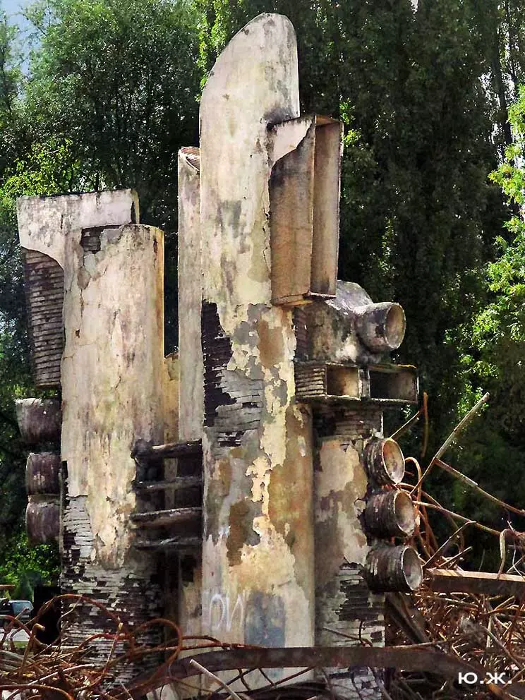 И, последнее. Я не зря здесь затронул Олимпийский плавательный бассейн, ровесник кинотеатра. Построенные одновременно в 1970 году, эти здания имели у своих корпусов очень похожие, каменные и бетонные малые архитектурные формы. Это все говорит о том, что авторы у них были одни. Скульптуры, сюрреалистические в те времена, сейчас просто назовем — авангардными. Они все на месте, все крепкие, все могут быть отреставрированы. Наша скульптура, что стояла рядом с кинотеатром, будет побольше, чем те две у бассейна. Бассейн стоит в Курортном парке, рядом с Долиной Роз, будете там, посмотрите. Здесь же, на одной из фотографий со скульптурой я указал стрелкой слово — «ТАЛИСМАН». Она встречается в альбоме часто.