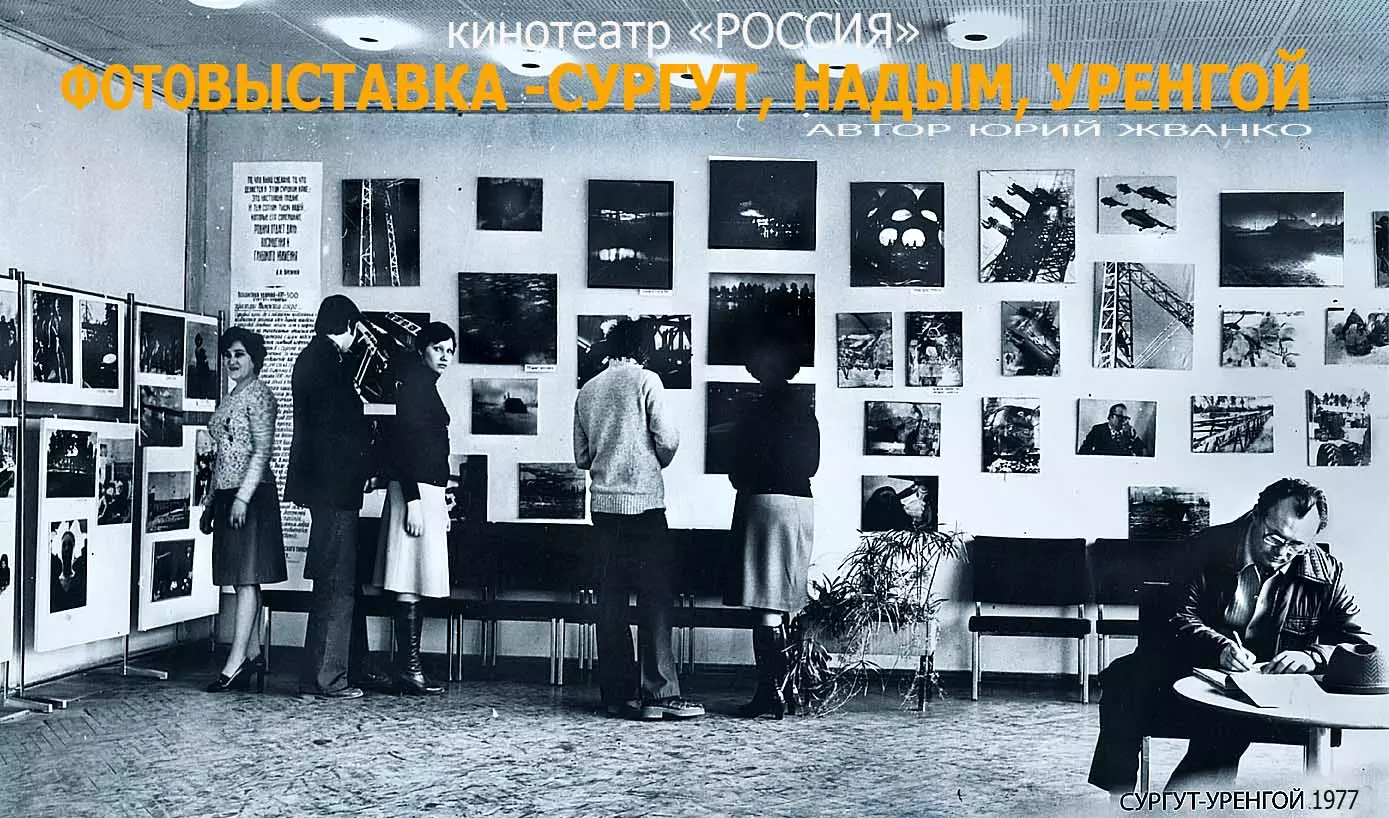 На втором этаже на подвесных вестибюлях справа и слева у панорамных окон был неплохой выставочный зал. Большой, удобный с прекрасным светом, как дневным, так и электрическим. У меня там состоялось несколько персональных фотовыставок, одну из них — «Сургут, Надым, Уренгой» о Всесоюзных ударных стройках — я показываю. Выставка была снята коллегой на черно-белую пленку для газеты. За столиком у книги отзывов что то пишет журналист из «Советской торговли» Валерий Василевский.