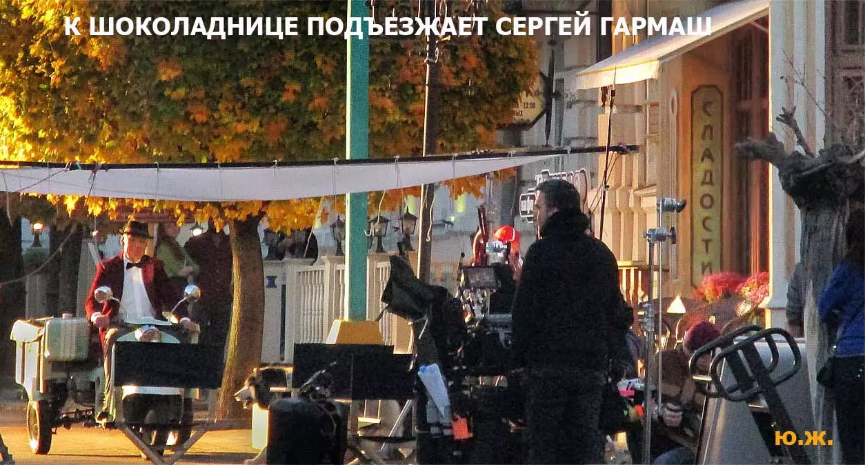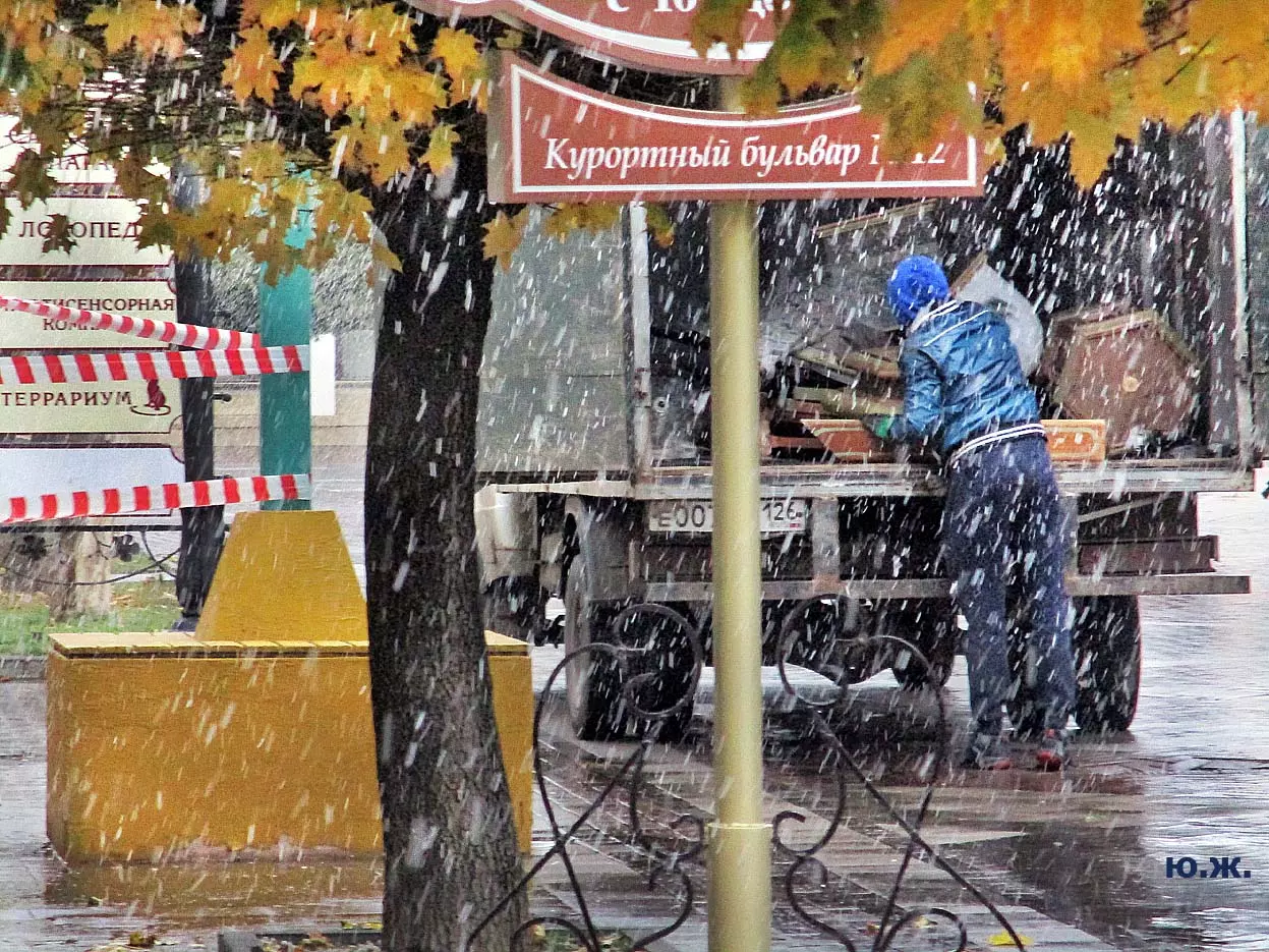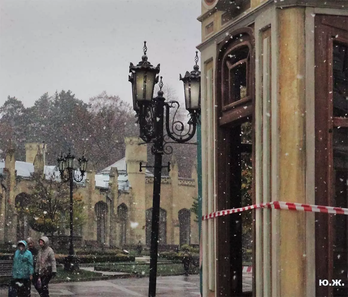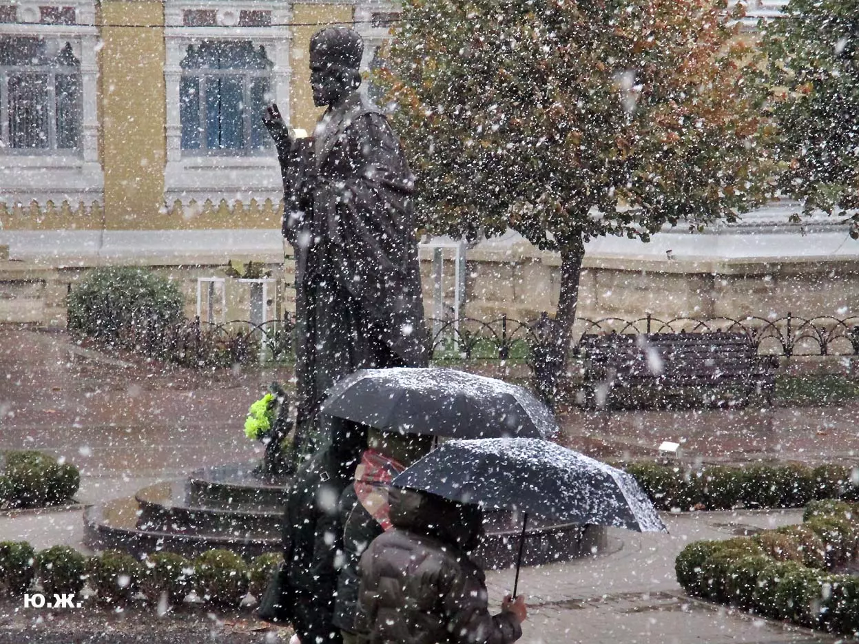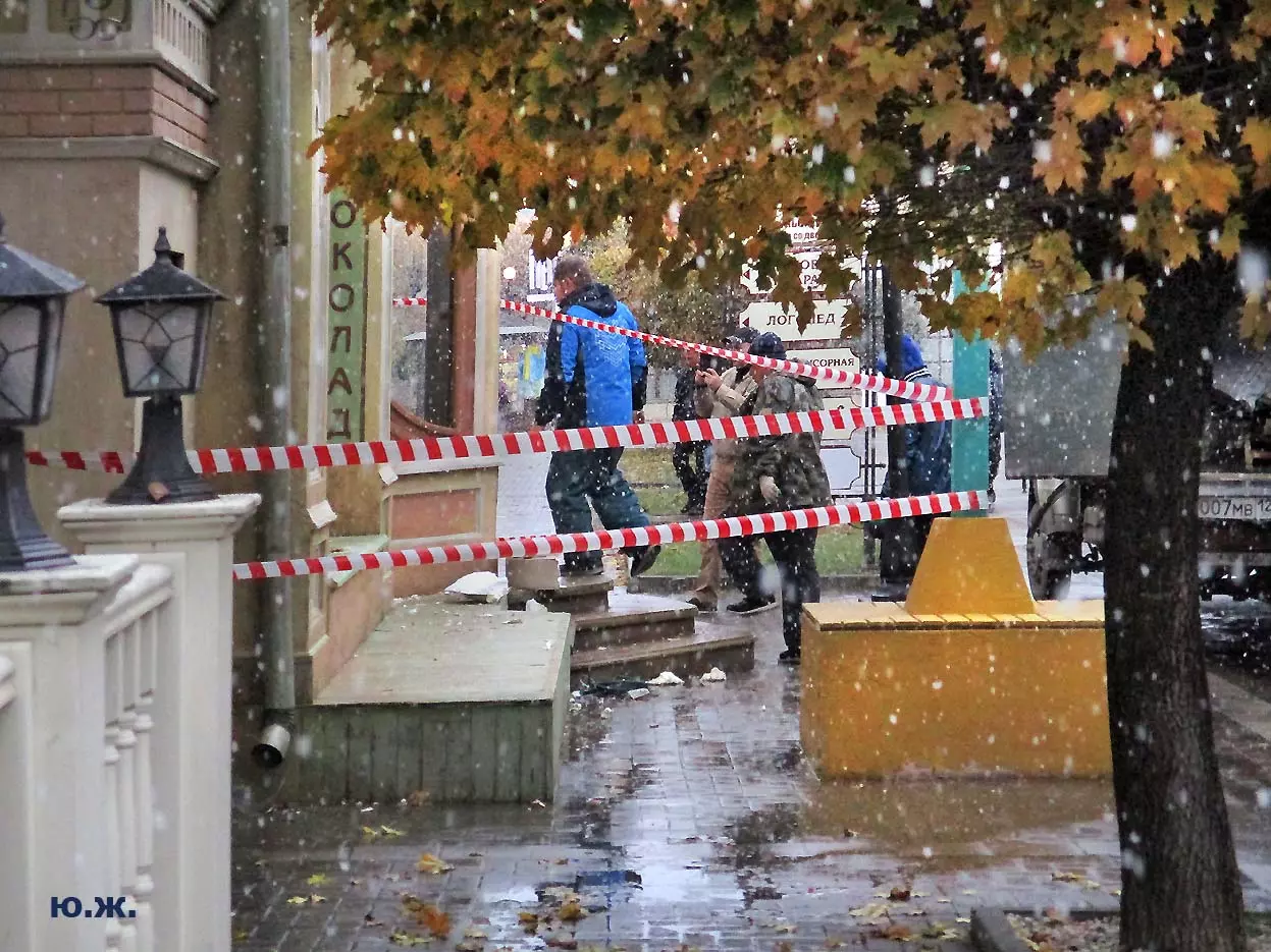 И ровно на следующий последний день окончания съемочной программы, 24 октября, в понедельник 25, пошел первый осенний снег. В наших южных краях это просто забава, не приносящая вреда, пушистый теплый снег, на фоне которого красиво смотрелись яркие зонтики, через пару часов который и закончился. Он начался во вторую половину дня, а в первую его половину работники городской службы треста зеленого хозяйства убирали клумбы и перекапывали землю. (см. фото). И даже за это короткое время многие и многие успели запечатлеть на свои смартфоны и фотокамеры громадное количество снимков и развезут их по всей стране. А как красиво смотрелось при медленно падающих крупных снежинках, возведенное к съемкам фильма здание-реквизит. Практически весь октябрь, пока шли съемки фильма, в других местах- «локациях», на их языке, довольно большая группа молодых людей работала над ним, в конце художники искусственно «старили» его, было еще много разных манипуляций, пока Крокодил Гена (Сергей Гармаш) последние два съемочных дня стал энергично посещать его. Он в том числе подъезжал сюда и на своем трехколесном моточуде , одетый в красный пиджак, шляпу и бабочку. Народ уже стал называть это здание «Домом Чебурашки» и рассказывают, что в этой шоколадной мама одного мальчика, который дружит с Геной, отлично готовит горячий шоколад…