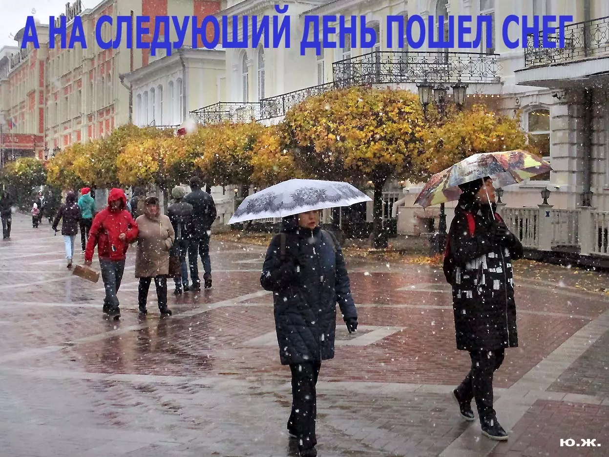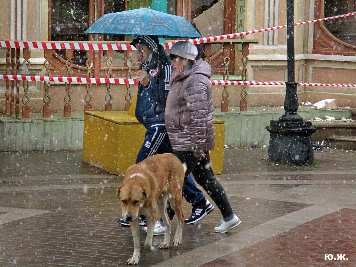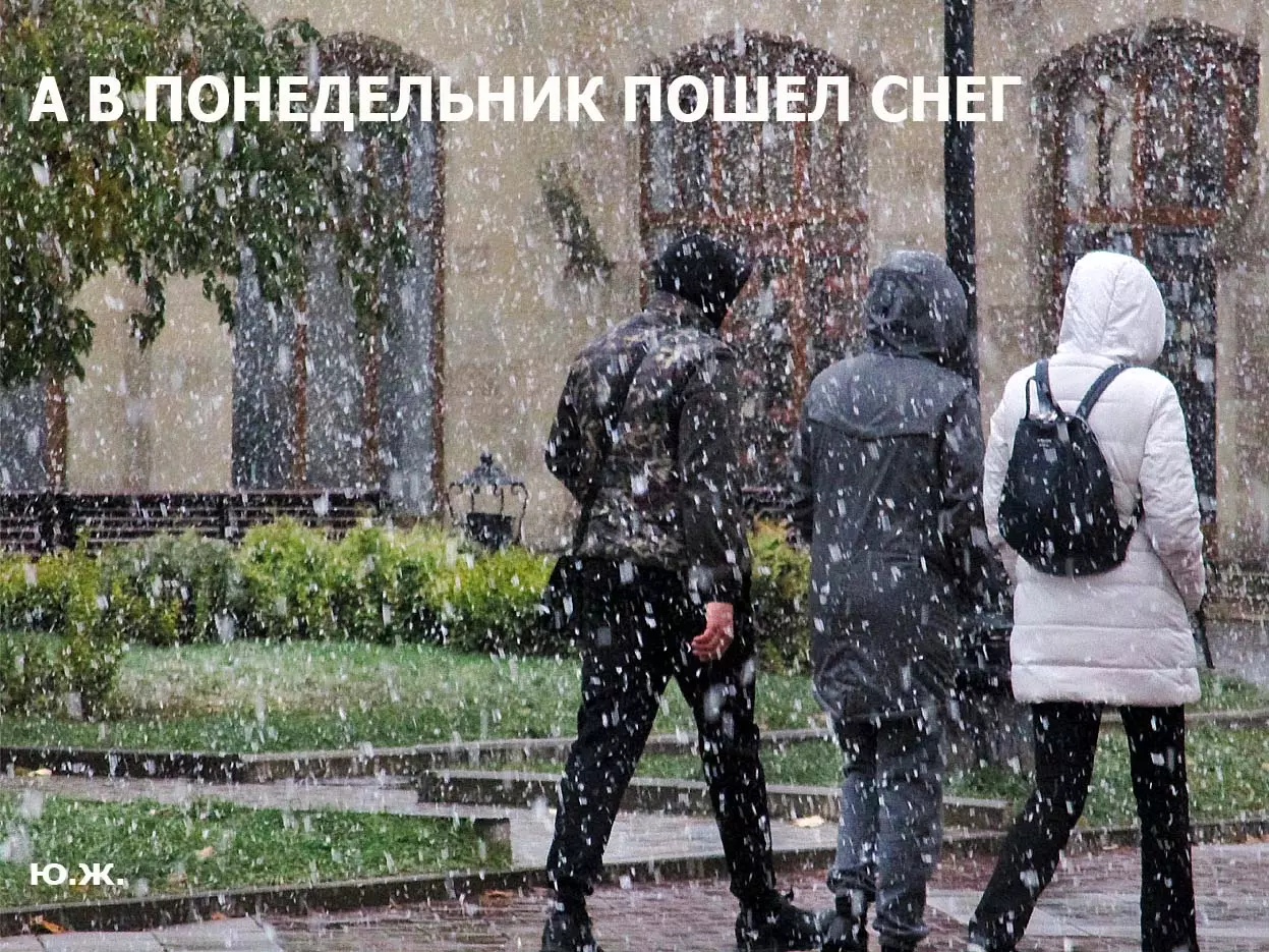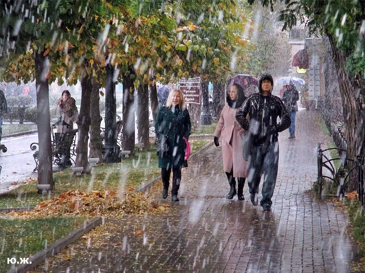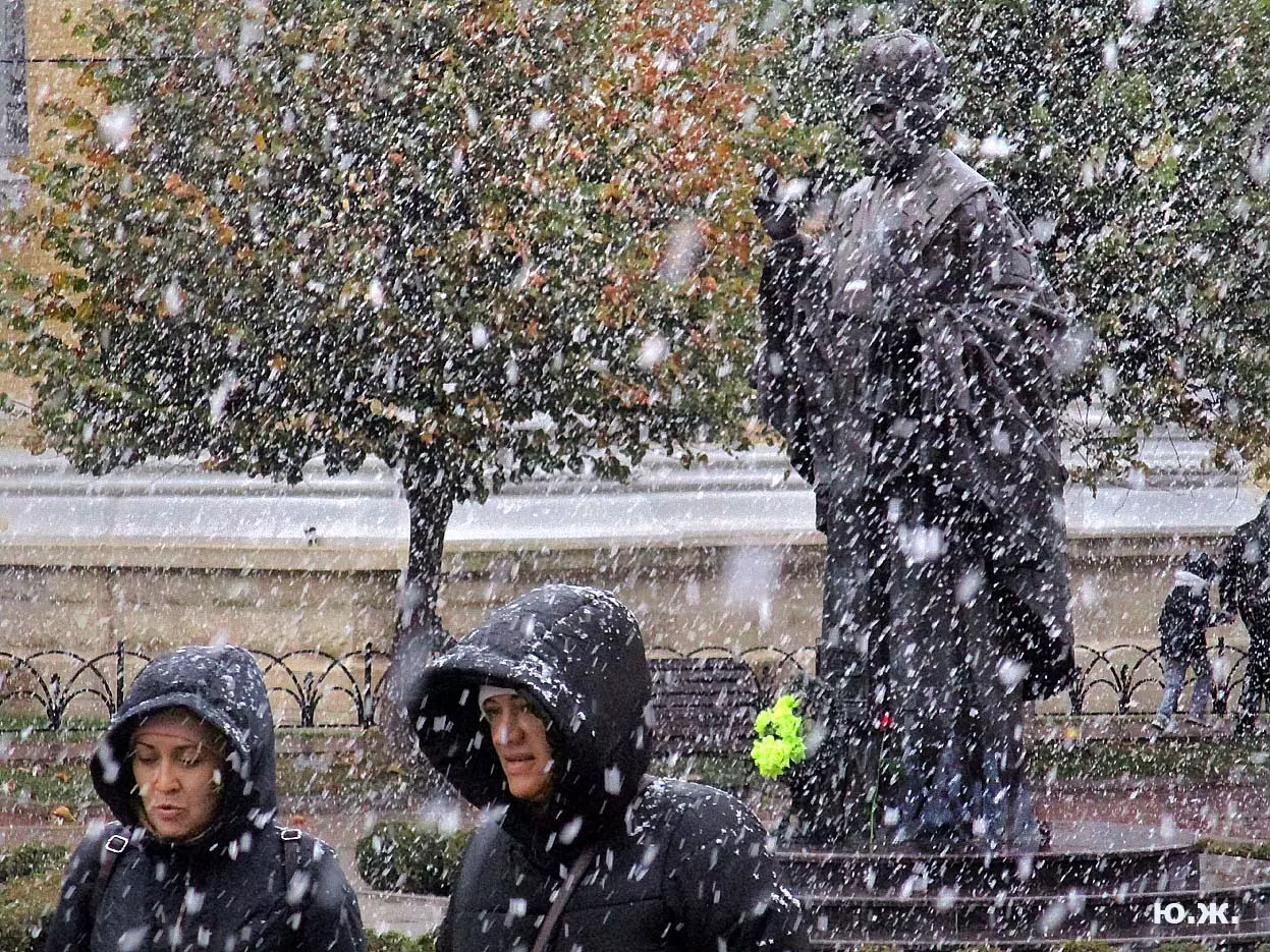 И ровно на следующий последний день окончания съемочной программы, 24 октября, в понедельник 25, пошел первый осенний снег. В наших южных краях это просто забава, не приносящая вреда, пушистый теплый снег, на фоне которого красиво смотрелись яркие зонтики, через пару часов который и закончился. Он начался во вторую половину дня, а в первую его половину работники городской службы треста зеленого хозяйства убирали клумбы и перекапывали землю. (см. фото). И даже за это короткое время многие и многие успели запечатлеть на свои смартфоны и фотокамеры громадное количество снимков и развезут их по всей стране. А как красиво смотрелось при медленно падающих крупных снежинках, возведенное к съемкам фильма здание-реквизит. Практически весь октябрь, пока шли съемки фильма, в других местах- «локациях», на их языке, довольно большая группа молодых людей работала над ним, в конце художники искусственно «старили» его, было еще много разных манипуляций, пока Крокодил Гена (Сергей Гармаш) последние два съемочных дня стал энергично посещать его. Он в том числе подъезжал сюда и на своем трехколесном моточуде , одетый в красный пиджак, шляпу и бабочку. Народ уже стал называть это здание «Домом Чебурашки» и рассказывают, что в этой шоколадной мама одного мальчика, который дружит с Геной, отлично готовит горячий шоколад…